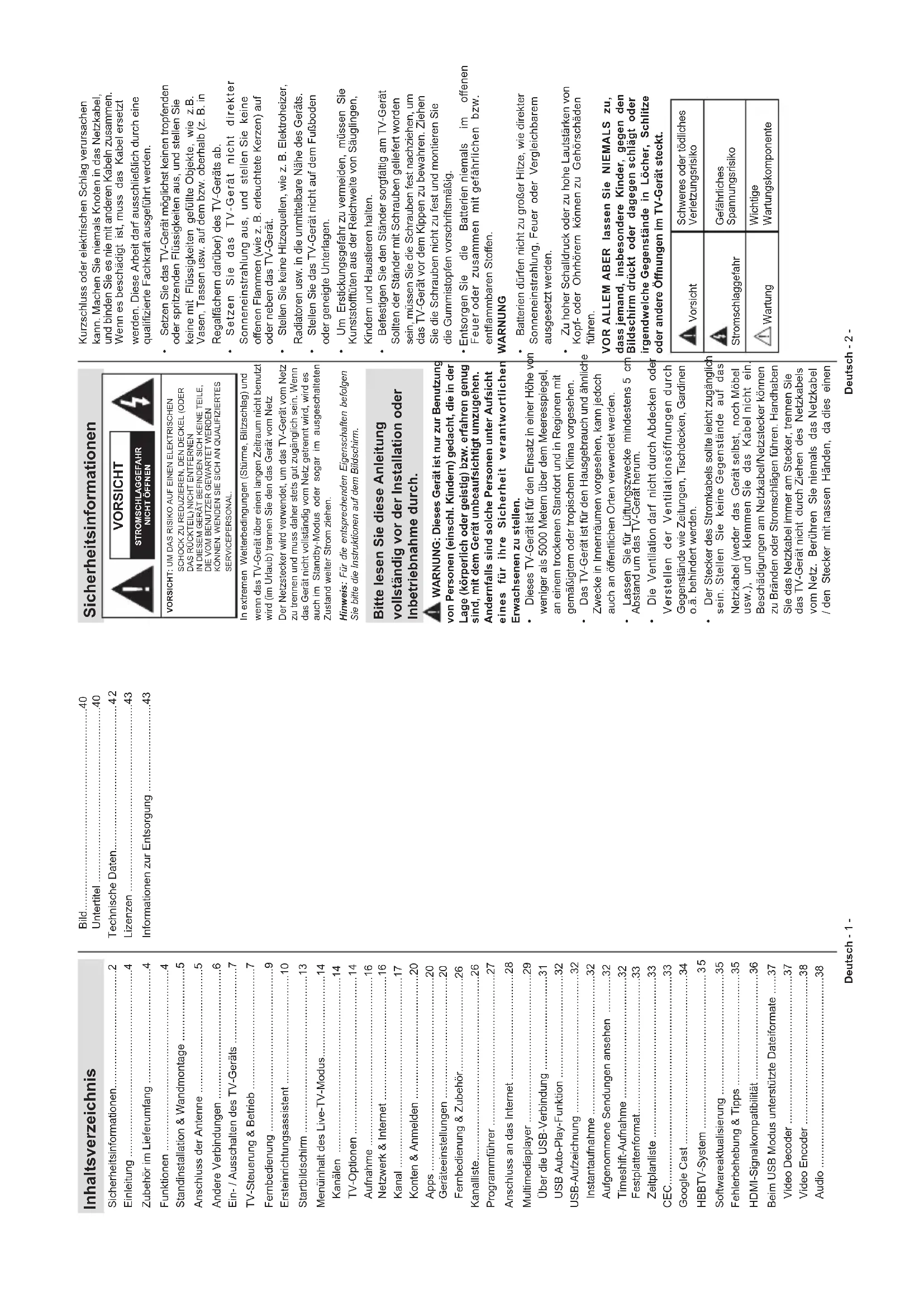 - Informationen zur Entsorgung Deutsch - 2 - Sicherheitsinformationen VORSICHT STROMSCHLAGGEFAHRNICHT ÖFFNENVORSICHT: UM DAS RISIKO AUF EINEN ELEKTRISCHEN SCHOCK ZU REDUZIEREN, DEN DECKEL (ODER DAS RÜCKTEIL) NICHT ENTFERNEN IN DIESEM GERÄT BEFINDEN SICH KEINE TEILE, DIE VOM BENUTZER GEWARTET WERDEN KÖNNEN. WENDEN SIE SICH AN QUALIFIZIERTES SERVICEPERSONAL.Hinweis: Für die entsprechenden Eigenschaften befolgen Sie bitte die Instruktionen auf dem Bildschirm.In extremen Wetterbedingungen (Stürme, Blitzschlag) und wenn das TV-Gerät über einen langen Zeitraum nicht benutzt wird (im Urlaub) trennen Sie den das Gerät vom NetzDer Netzstecker wird verwendet, um das TV-Gerät vom Netz zu trennen und muss daher stets gut zugänglich sein. Wenn das Gerät nicht vollständig vom Netz getrennt wird, wird es auch im Standby-Modus oder sogar im ausgeschalteten Zustand weiter Strom ziehen. Bitte lesen Sie diese Anleitung vollständig vor der Installation oder Inbetriebnahme durch. WARNUNG: Dieses Gerät ist nur zur Benutzung von Personen (einschl. Kindern) gedacht, die in der Lage (körperlich oder geistig) bzw. erfahren genug sind, mit dem Gerät unbeaufsichtigt umzugehen. Andernfalls sind solche Personen unter Aufsicht eines für ihre Sicherheit verantwortlichen Erwachsenen zu stellen. Dieses TV-Gerät ist für den Einsatz in einer Höhe von weniger als 5000 Metern über dem Meeresspiegel, an einem trockenen Standort und in Regionen mit gemäßigtem oder tropischem Klima vorgesehen. Das TV-Gerät ist für den Hausgebrauch und ähnliche Zwecke in Innenräumen vorgesehen, kann jedoch p. 43