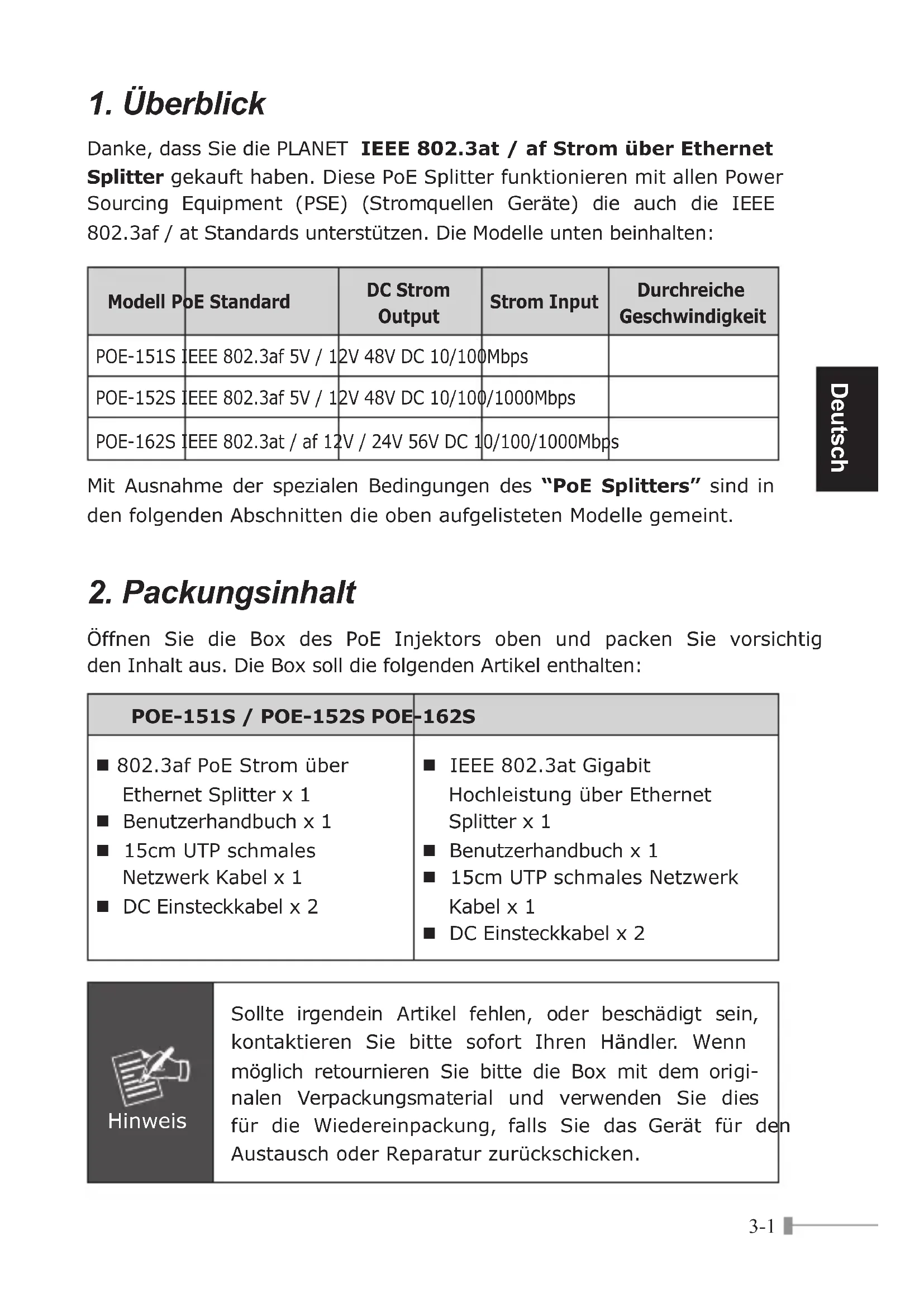 Danke, dass Sie die PLANET IEEE 802.3at / af Strom über Ethernet Splitter gekauft haben. Diese PoE Splitter funktionieren mit allen Power Sourcing Equipment (PSE) (Stromquellen Geräte) die auch die IEEE 802.3af / at Standards unterstützen. Die Modelle unten beinhalten: Modell PoE Standard DC Strom Output Strom Input Durchreiche Geschwindigkeit POE-151S IEEE 802.3af 5V / 12V 48V DC 10/100Mbps POE-152S IEEE 802.3af 5V / 12V 48V DC 10/100/1000Mbps POE-162S IEEE 802.3at / af 12V / 24V 56V DC 10/100/1000Mbps Mit Ausnahme der spezialen Bedingungen des “PoE Splitters” sind in den folgenden Abschnitten die oben aufgelisteten Modelle gemeint.