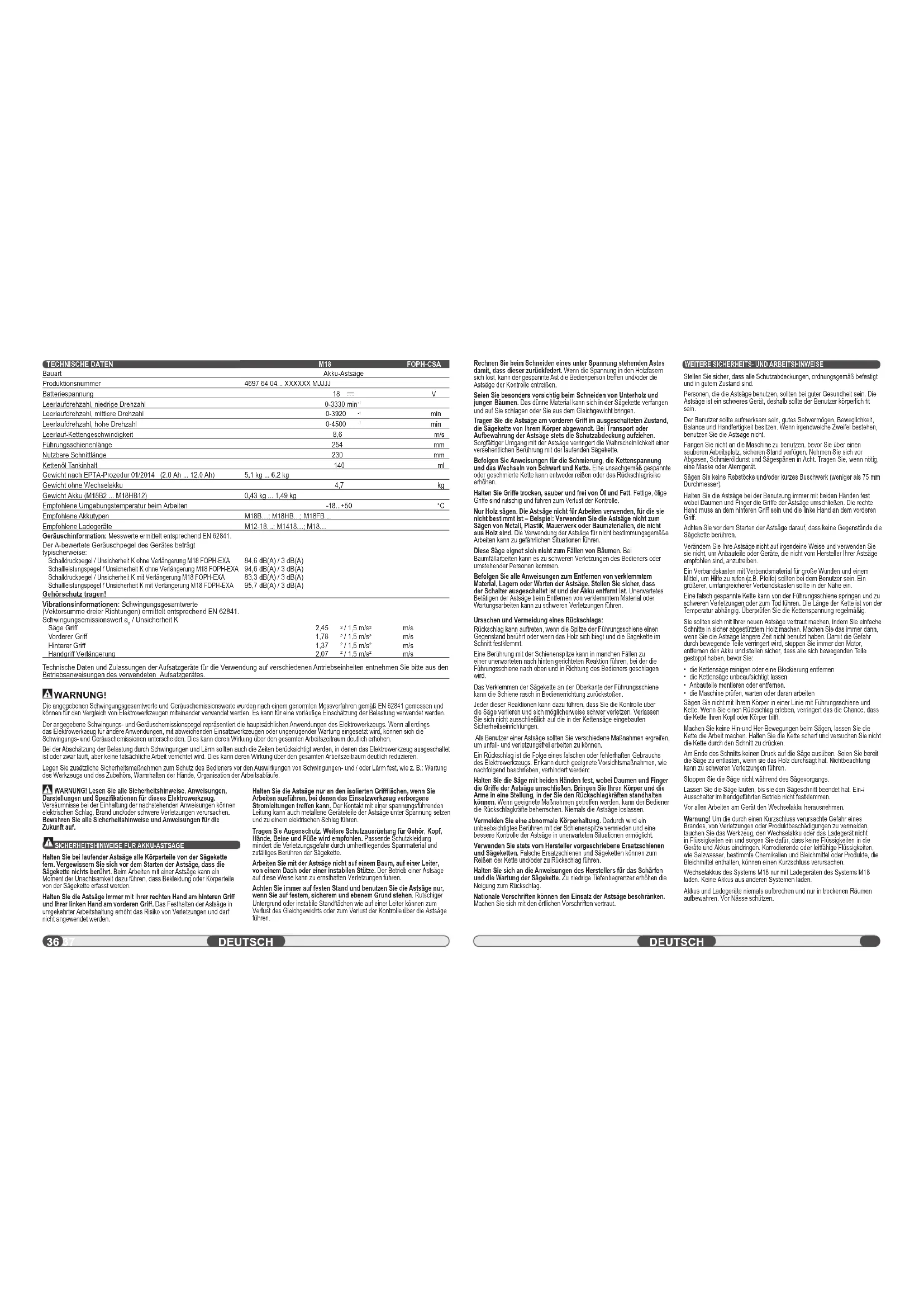 TECHNISCHE DATEN Bauart Produktionsnummer Batteriespannung Leerlaufdrehzahl, niedrige Drehzahl Leerlaufdrehzahl, mittlere Drehzahl Leerlaufdrehzahl, hohe Drehzahl Leerlauf-Kettengeschwindigkeit Führungsschienenlänge Nutzbare Schnittlänge Kettenöl Tankinhalt Gewicht nach EPTA-Prozedur 01/2014 (2.0 Ah ... 12.0 Ah) Gewicht ohne Wechselakku Gewicht Akku (M18B2 ... M18HB12) Empfohlene Umgebungstemperatur beim Arbeiten Empfohlene Akkutypen Empfohlene Ladegeräte Geräuschinformation: Messwerte ermittelt entsprechend EN 62841. Der A-bewertete Geräuschpegel des Gerätes beträgt typischerweise: Schalldruckpegel / Unsicherheit K ohne Verlängerung M18 FOPH-EXA Schallleistungspegel / Unsicherheit K ohne Verlängerung M18 FOPH-EXA Schalldruckpegel / Unsicherheit K mit Verlängerung M18 FOPH-EXA Schallleistungspegel / Unsicherheit K mit Verlängerung M18 FOPH-EXA Gehörschutz tragen! Vibrationsinformationen: Schwingungsgesamtwerte (Vektorsumme dreier Richtungen) ermittelt entsprechend EN 62841. Schwingungsemissionswert a