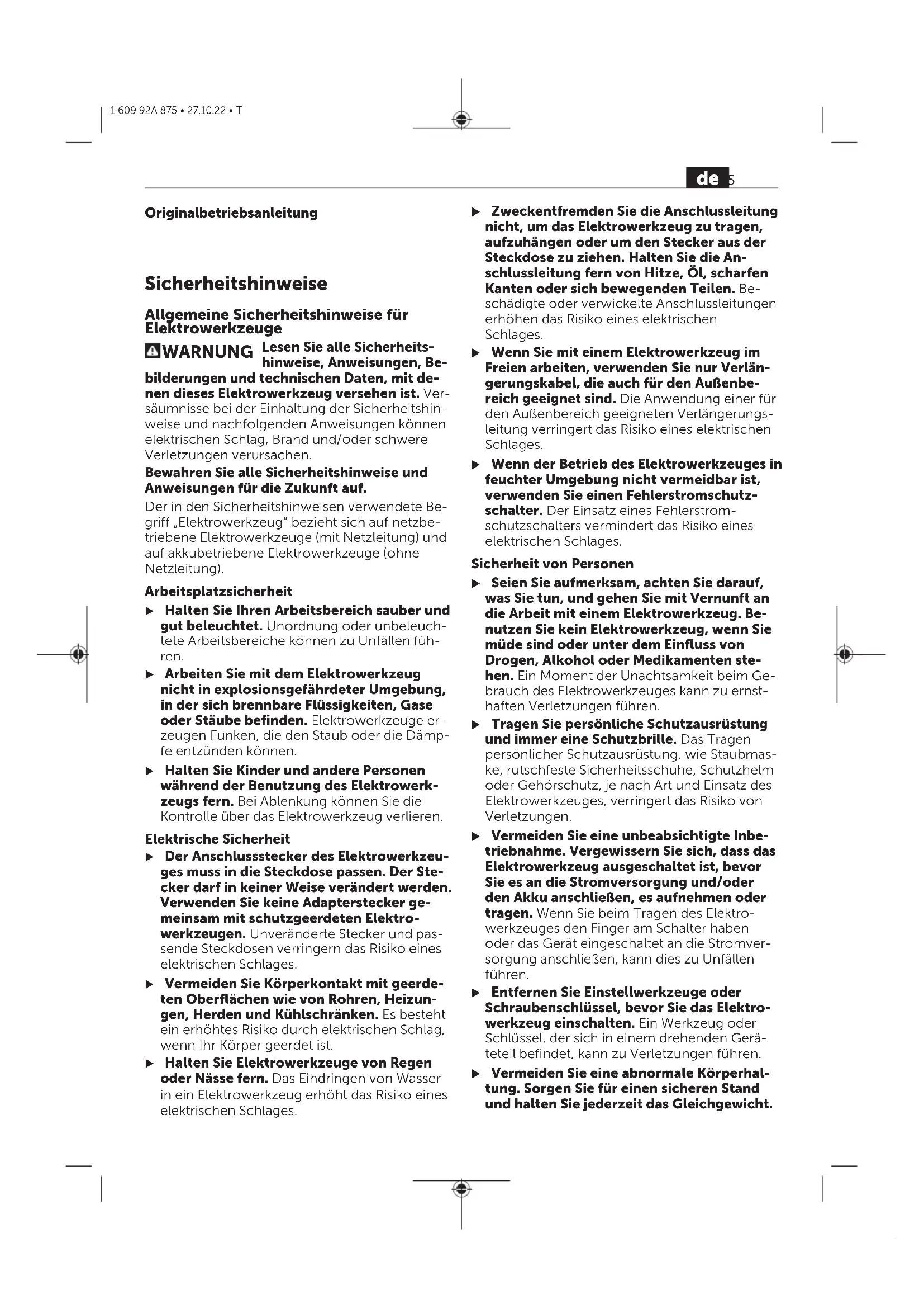 1 609 92A 875 • 27.10.22 • TOriginalbetriebsanleitung SicherheitshinweiseDeutsch Allgemeine Sicherheitshinweise für ElektrowerkzeugeDeutsch WARNUNG Lesen Sie alle Sicherheits- hinweise, Anweisungen, Be- bilderungen und technischen Daten, mit de- nen dieses Elektrowerkzeug versehen ist. Ver- säumnisse bei der Einhaltung der Sicherheitshin- weise und nachfolgenden Anweisungen können elektrischen Schlag, Brand und/oder schwere Verletzungen verursachen. Bewahren Sie alle Sicherheitshinweise und Anweisungen für die Zukunft auf. Der in den Sicherheitshinweisen verwendete Be- griff „Elektrowerkzeug“ bezieht sich auf netzbe- triebene Elektrowerkzeuge (mit Netzleitung) und auf akkubetriebene Elektrowerkzeuge (ohne Netzleitung). ArbeitsplatzsicherheitDeutsch u Halten Sie Ihren Arbeitsbereich sauber und gut beleuchtet. Unordnung oder unbeleuch- tete Arbeitsbereiche können zu Unfällen füh- ren. u Arbeiten Sie mit dem Elektrowerkzeug nicht in explosionsgefährdeter Umgebung, in der sich brennbare Flüssigkeiten, Gase oder Stäube befinden. Elektrowerkzeuge er- zeugen Funken, die den Staub oder die Dämp- fe entzünden können. u Halten Sie Kinder und andere Personen während der Benutzung des Elektrowerk- zeugs fern. Bei Ablenkung können Sie die Kontrolle über das Elektrowerkzeug verlieren. Elektrische SicherheitDeutsch u Der Anschlussstecker des Elektrowerkzeu- ges muss in die Steckdose passen. Der Ste- cker darf in keiner Weise verändert werden. Verwenden Sie keine Adapterstecker ge- meinsam mit schutzgeerdeten Elektro- werkzeugen. Unveränderte Stecker und pas- sende Steckdosen verringern das Risiko eines elektrischen Schlages. u Vermeiden Sie Körperkontakt mit geerde- ten Oberflächen wie von Rohren, Heizun- gen, Herden und Kühlschränken. Es besteht ein erhöhtes Risiko durch elektrischen Schlag, wenn Ihr Körper geerdet ist. u Halten Sie Elektrowerkzeuge von Regen oder Nässe fern. Das Eindringen von Wasser in ein Elektrowerkzeug erhöht das Risiko eines elektrischen Schlages. u Zweckentfremden Sie die Anschlussleitung nicht, um das Elektrowerkzeug zu tragen, aufzuhängen oder um den Stecker aus der Steckdose zu ziehen. Halten Sie die An- schlussleitung fern von Hitze, Öl, scharfen Kanten oder sich bewegenden Teilen. Be- schädigte oder verwickelte Anschlussleitungen erhöhen das Risiko eines elektrischen Schlages. u Wenn Sie mit einem Elektrowerkzeug im Freien arbeiten, verwenden Sie nur Verlän- gerungskabel, die auch für den Außenbe- reich geeignet sind. Die Anwendung einer für den Außenbereich geeigneten Verlängerungs- leitung verringert das Risiko eines elektrischen Schlages. u Wenn der Betrieb des Elektrowerkzeuges in feuchter Umgebung nicht vermeidbar ist, verwenden Sie einen Fehlerstromschutz- schalter. Der Einsatz eines Fehlerstrom- schutzschalters vermindert das Risiko eines elektrischen Schlages. Sicherheit von PersonenDeutsch u Seien Sie aufmerksam, achten Sie darauf, was Sie tun, und gehen Sie mit Vernunft an die Arbeit mit einem Elektrowerkzeug. Be- nutzen Sie kein Elektrowerkzeug, wenn Sie müde sind oder unter dem Einfluss von Drogen, Alkohol oder Medikamenten ste- hen. Ein Moment der Unachtsamkeit beim Ge- brauch des Elektrowerkzeuges kann zu ernst- haften Verletzungen führen. u Tragen Sie persönliche Schutzausrüstung und immer eine Schutzbrille. Das Tragen persönlicher Schutzausrüstung, wie Staubmas- ke, rutschfeste Sicherheitsschuhe, Schutzhelm oder Gehörschutz, je nach Art und Einsatz des Elektrowerkzeuges, verringert das Risiko von Verletzungen. u Vermeiden Sie eine unbeabsichtigte Inbe- triebnahme. Vergewissern Sie sich, dass das Elektrowerkzeug ausgeschaltet ist, bevor Sie es an die Stromversorgung und/oder den Akku anschließen, es aufnehmen oder tragen. Wenn Sie beim Tragen des Elektro- werkzeuges den Finger am Schalter haben oder das Gerät eingeschaltet an die Stromver- sorgung anschließen, kann dies zu Unfällen führen. u Entfernen Sie Einstellwerkzeuge oder Schraubenschlüssel, bevor Sie das Elektro- werkzeug einschalten. Ein Werkzeug oder Schlüssel, der sich in einem drehenden Gerä- teteil befindet, kann zu Verletzungen führen. u Vermeiden Sie eine abnormale Körperhal- tung. Sorgen Sie für einen sicheren Stand und halten Sie jederzeit das Gleichgewicht. de 5 1 609 92A 875 • 27.10.22 • TDadurch können Sie das Elektrowerkzeug in unerwarteten Situationen besser kontrollieren. u Tragen Sie geeignete Kleidung. Tragen Sie keine weite Kleidung oder Schmuck. Halten Sie Haare und Kleidung fern von sich bewe- genden Teilen. Lockere Kleidung, Schmuck oder lange Haare können von sich bewegen- den Teilen erfasst werden. u Wenn Staubabsaug- und -auffangeinrich- tungen montiert werden können, sind diese anzuschließen und richtig zu verwenden. Verwendung einer Staubabsaugung kann Ge- fährdungen durch Staub verringern. u Wiegen Sie sich nicht in falscher Sicherheit und setzen Sie sich nicht über die Sicher- heitsregeln für Elektrowerkzeuge hinweg, auch wenn Sie nach vielfachem Gebrauch mit dem Elektrowerkzeug vertraut sind. Achtloses Handeln kann binnen Sekunden- bruchteilen zu schweren Verletzungen führen. Verwendung und Behandlung des ElektrowerkzeugsDeutsch u Überlasten Sie das Elektrowerkzeug nicht. Verwenden Sie für Ihre Arbeit das dafür be- stimmte Elektrowerkzeug. Mit dem passen- den Elektrowerkzeug arbeiten Sie besser und sicherer im angegebenen Leistungsbereich. u Benutzen Sie kein Elektrowerkzeug, dessen Schalter defekt ist. Ein Elektrowerkzeug, das sich nicht mehr ein- oder ausschalten lässt, ist gefährlich und muss repariert werden. u Ziehen Sie den Stecker aus der Steckdose und/oder entfernen Sie einen abnehmbaren Akku, bevor Sie Geräteeinstellungen vor- nehmen, Einsatzwerkzeugteile wechseln oder das Elektrowerkzeug weglegen. Diese Vorsichtsmaßnahme verhindert den unbeab- sichtigten Start des Elektrowerkzeuges. u Bewahren Sie unbenutzte Elektrowerkzeu- ge außerhalb der Reichweite von Kindern auf. Lassen Sie kei