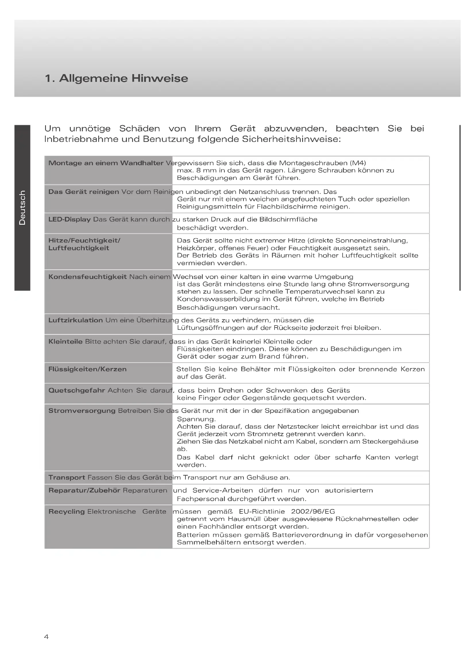 11. Spezifikation .................................................................................................... 444 Deutsch Um unnötige Schäden von Ihrem Gerät abzuwenden, beachten Sie bei Inbetriebnahme und Benutzung folgende Sicherheitshinweise: Montage an einem Wandhalter Vergewissern Sie sich, dass die Montageschrauben (M4) max. 8 mm in das Gerät ragen. Längere Schrauben können zu Beschädigungen am Gerät führen. Das Gerät reinigen Vor dem Reinigen unbedingt den Netzanschluss trennen. Das Gerät nur mit einem weichen angefeuchteten Tuch oder speziellen Reinigungsmitteln für Flachbildschirme reinigen. LED-Display Das Gerät kann durch zu starken Druck auf die Bildschirmfläche beschädigt werden. Hitze/Feuchtigkeit/ Luftfeuchtigkeit Das Gerät sollte nicht extremer Hitze (direkte Sonneneinstrahlung, Heizkörper, oenes Feuer) oder Feuchtigkeit ausgesetzt sein. Der Betrieb des Geräts in Räumen mit hoher Luftfeuchtigkeit sollte vermieden werden. Kondensfeuchtigkeit Nach einem Wechsel von einer kalten in eine warme Umgebung ist das Gerät mindestens eine Stunde lang ohne Stromversorgung stehen zu lassen. Der schnelle Temperaturwechsel kann zu Kondenswasserbildung im Gerät führen, welche im Betrieb Beschädigungen verursacht. Luftzirkulation Um eine Überhitzung des Geräts zu verhindern, müssen die Lüftungsönungen auf der Rückseite jederzeit frei bleiben. Kleinteile Bitte achten Sie darauf, dass in das Gerät keinerlei Kleinteile oder Flüssigkeiten eindringen. Diese können zu Beschädigungen im Gerät oder sogar zum Brand führen. Flüssigkeiten/Kerzen Stellen Sie keine Behälter mit Flüssigkeiten oder brennende Kerzen auf das Gerät. Quetschgefahr Achten Sie darauf, dass beim Drehen oder Schwenken des Geräts keine Finger oder Gegenstände gequetscht werden. Stromversorgung Betreiben Sie das Gerät nur mit der in der Spezifikation angegebenen Spannung. Achten Sie darauf, dass der Netzstecker leicht erreichbar ist und das Gerät jederzeit vom Stromnetz getrennt werden kann. Ziehen Sie das Netzkabel nicht am Kabel, sondern am Steckergehäuse ab. Das Kabel darf nicht geknickt oder über scharfe Kanten verlegt werden. Transport Fassen Sie das Gerät beim Transport nur am Gehäuse an. Reparatur/Zubehör Reparaturen und Service-Arbeiten dürfen nur von autorisiertem Fachpersonal durchgeführt werden. Recycling Elektronische Geräte müssen gemäß EU-Richtlinie 2002/96/EG getrennt vom Hausmüll über ausgewiesene Rücknahmestellen oder einen Fachhändler entsorgt werden. Batterien müssen gemäß Batterieverordnung in dafür vorgesehenen Sammelbehältern entsorgt werden.