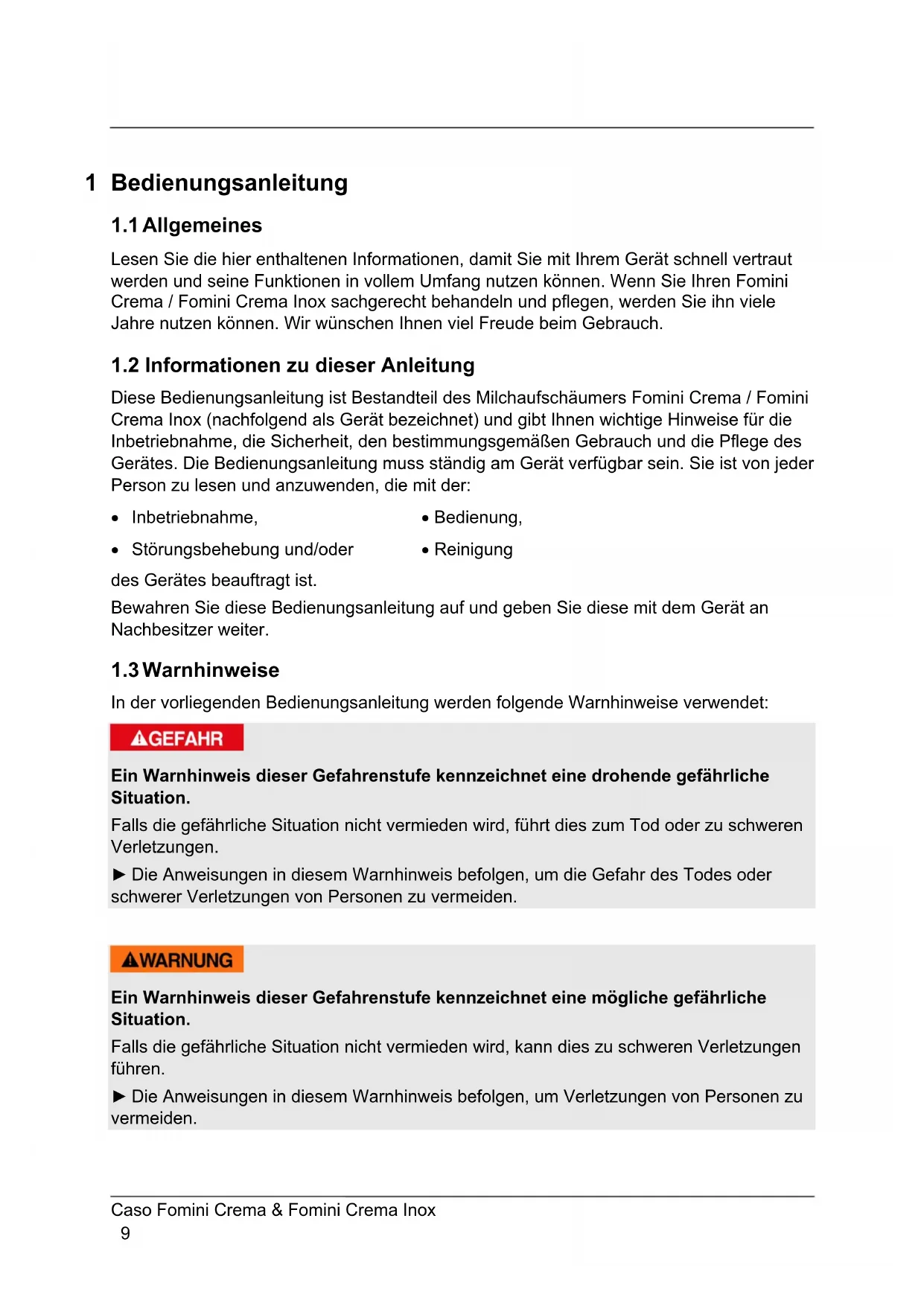 Ein Warnhinweis dieser Gefahrenstufe kennzeichnet eine mögliche gefährliche Situation. Falls die gefährliche Situation nicht vermieden wird, kann dies zu schweren Verletzungen führen. ► Die Anweisungen in diesem Warnhinweis befolgen, um Verletzungen von Personen zu vermeiden.Caso Fomini Crema & Fomini Crema Inox 10 Ein Warnhinweis dieser Gefahrenstufe kennzeichnet eine mögliche gefährliche Situation. Falls die gefährliche Situation nicht vermieden wird, kann dies zu leichten oder gemäßigten Verletzungen führen. ► Die Anweisungen in diesem Warnhinweis befolgen, um Verletzungen von Personen zu vermeiden.