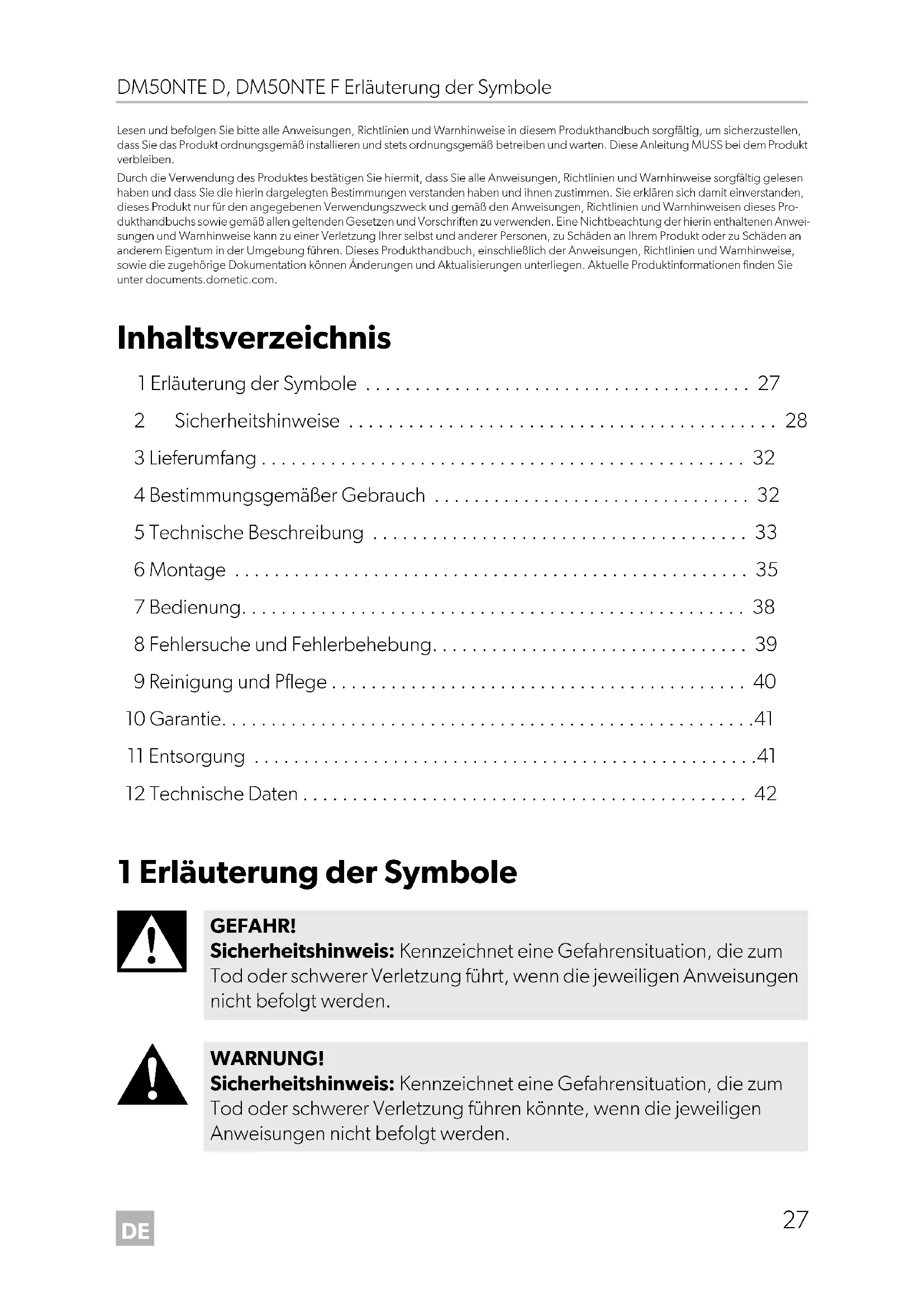 - Lesen und befolgen Sie bitte alle Anweisungen, Richtlinien und Warnhinweise in diesem Produkthandbuch sorgfältig, um sicherzustellen, dass Sie das Produkt ordnungsgemäß installieren und stets ordnungsgemäß betreiben und warten. Diese Anleitung MUSS bei dem Produkt verbleiben. Durch die Verwendung des Produktes bestätigen Sie hiermit, dass Sie alle Anweisungen, Richtlinien und Warnhinweise sorgfältig gelesen haben und dass Sie die hierin dargelegten Bestimmungen verstanden haben und ihnen zustimmen. Sie erklären sich damit einverstanden, dieses Produkt nur für den angegebenen Verwendungszweck und gemäß den Anweisungen, Richtlinien und Warnhinweisen dieses Pro- dukthandbuchs sowie gemäß allen geltenden Gesetzen und Vorschriften zu verwenden. Eine Nichtbeachtung der hierin enthaltenen Anwei- sungen und Warnhinweise kann zu einer Verletzung Ihrer selbst und anderer Personen, zu Schäden an Ihrem Produkt oder zu Schäden an anderem Eigentum in der Umgebung führen. Dieses Produkthandbuch, einschließlich der Anweisungen, Richtlinien und Warnhinweise, sowie die zugehörige Dokumentation können Änderungen und Aktualisierungen unterliegen. Aktuelle Produktinformationen finden Sie unter documents.dometic.com. Inhaltsverzeichnis 1 Erläuterung der Symbole p. 27