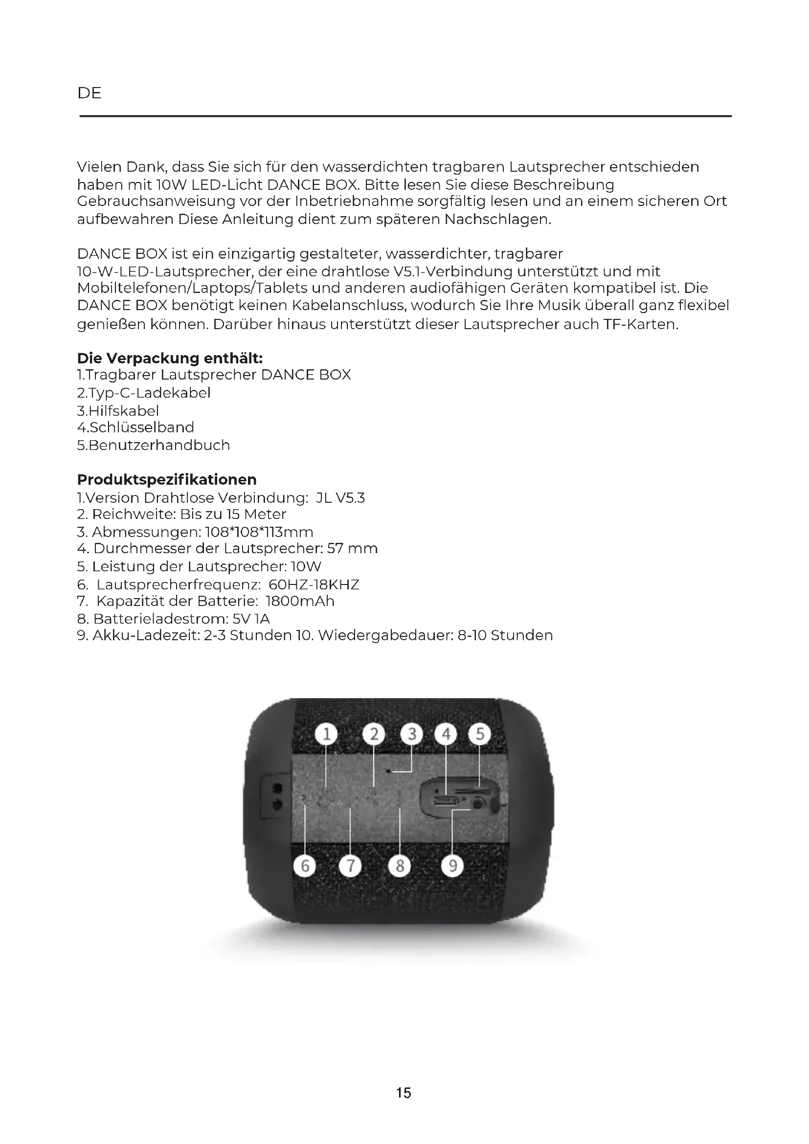 CATEGORIA Prixton DANCE BOX Speaker Audio Le caratteristiche tecniche ed elettriche qui riportate corrispondono alle unità tipiche e possono essere modificate senza preavviso per migliorare le qualità del dispositivo. 14DE Vielen Dank, dass Sie sich für den wasserdichten tragbaren Lautsprecher entschieden haben mit 10W LED-Licht DANCE BOX. Bitte lesen Sie diese Beschreibung Gebrauchsanweisung vor der Inbetriebnahme sorgfältig lesen und an einem sicheren Ort aufbewahren Diese Anleitung dient zum späteren Nachschlagen. DANCE BOX ist ein einzigartig gestalteter, wasserdichter, tragbarer 10-W-LED-Lautsprecher, der eine drahtlose V5.1-Verbindung unterstützt und mit Mobiltelefonen/Laptops/Tablets und anderen audiofähigen Geräten kompatibel ist. Die DANCE BOX benötigt keinen Kabelanschluss, wodurch Sie Ihre Musik überall ganz flexibel genießen können. Darüber hinaus unterstützt dieser Lautsprecher auch TF-Karten. Die Verpackung enthält: 1.Tragbarer Lautsprecher DANCE BOX 2.Typ-C-Ladekabel 3.Hilfskabel 4.Schlüsselband 5.Benutzerhandbuch Produktspezifikationen 1.Version Drahtlose Verbindung: JL V5.3