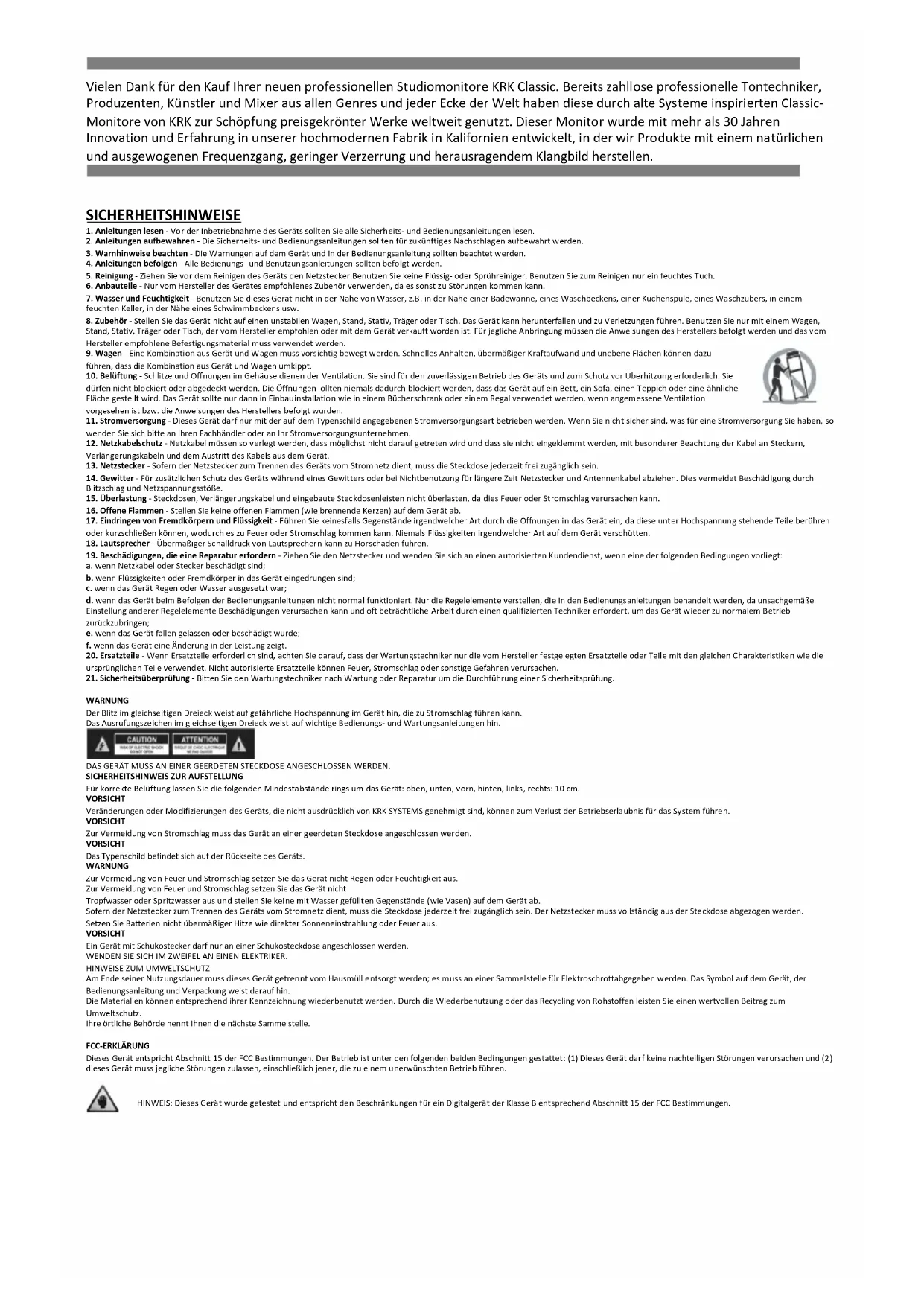 www.krkmusic.com/warrantyVielen Dank für den Kauf Ihrer neuen professionellen Studiomonitore KRK Classic. Bereits zahllose professionelle Tontechniker, Produzenten, Künstler und Mixer aus allen Genres und jeder Ecke der Welt haben diese durch alte Systeme inspirierten Classic- Monitore von KRK zur Schöpfung preisgekrönter Werke weltweit genutzt. Dieser Monitor wurde mit mehr als 30 Jahren Innovation und Erfahrung in unserer hochmodernen Fabrik in Kalifornien entwickelt, in der wir Produkte mit einem natürlichen und ausgewogenen Frequenzgang, geringer Verzerrung und herausragendem Klangbild herstellen. SICHERHEITSHINWEISE