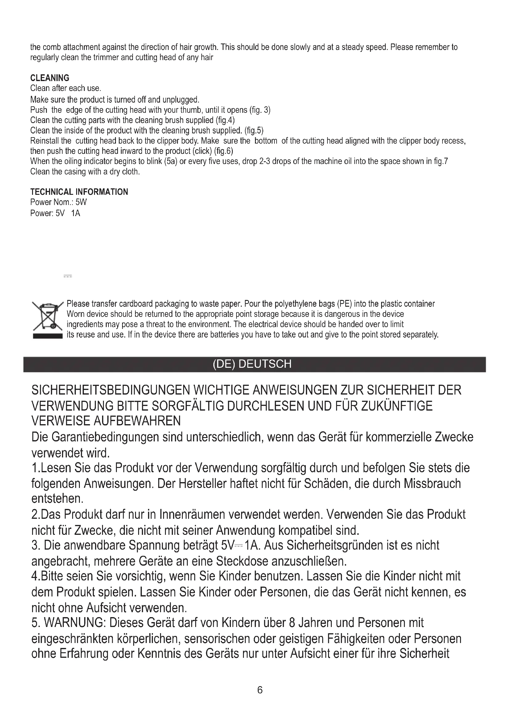 6 Ladebuchse 7. Kämme 7a. Reinigungsbürste 7b. Ölflasche 4a. Verbleibende Batteriekapazität 4b. Ladeanzeige 4c. Reisesperre 4d. Geschwindigkeitsanzeige 5. Ladekabel DIE BATTERIE AUFLADEN: Um mit dem Laden zu beginnen, stecken Sie das Netzkabel in die Ladebuchse (6) und das Ladegerät in eine 220–240 V~ 50/60 Hz Netzsteckdose. Nachdem der Akku vollständig aufgeladen ist, zeigt die Akkukapazitätsanzeige (4b) 100 % an. Die Ladezeit beträgt ca. 2,5 Stunden. Nachdem das Produkt vollständig aufgeladen ist, beträgt die Laufzeit etwa 180 Minuten. Wenn Sie das Netzteil in die Steckdose stecken, beginnt die Ladeanzeige (5d) von unten nach oben zu blinken. Wenn der Akkustand auf 10 % sinkt, beginnt die Ladeanzeige (4b) zu blinken GESCHWINDIGKEITSREGELTASTE (3) Geschwindigkeitsanzeige (4d) Durch einmaliges Drücken wird das Gerät eingeschaltet. Durch zweimaliges Drücken wird das Gerät in den Turbomodus geschaltet, was durch das Aufleuchten der Geschwindigkeitsanzeige (4d) angezeigt wird. Sobald das Gerät eingeschaltet ist, können Sie die Geschwindigkeits-/Einschalttaste (3) drücken. POWER-TASTE / SICHERHEITSVERRIEGELUNG (4) Drücken Sie den Netzschalter (4), um es ein- oder auszuschalten Halten Sie die Einschalttaste (4) 3 Sekunden lang gedrückt, um die Sicherheitsverriegelung ein- oder auszuschalten Bringen Sie den Schneidkopf wieder am Körper der Haarschneidemaschine an. Stellen Sie sicher, dass die Unterseite des Schneidkopfs mit der Aussparung im Körper des Haarschneiders ausgerichtet ist, und drücken Sie dann den Schneidkopf nach innen Reinigen Sie das Innere des Produkts mit der mitgelieferten Reinigungsbürste. (Abb.5) Reinigen Sie die Schneidteile mit der mitgelieferten Reinigungsbürste (Abb. 4). Drücken Sie mit dem Daumen auf die Kante des Schneidkopfes, bis er sich öffnet (Abb. 3). Nach jedem Gebrauch reinigen. Stellen Sie sicher, dass das Produkt ausgeschaltet und vom Stromnetz getrennt ist. REINIGUNG Um den Kamm zu wechseln, schalten Sie die Haarschneidemaschine aus, lösen Sie den Kamm (Abb. 1) und befestigen Sie den rechten Kamm (Abb. 2). Beginnen Sie mit dem Schneiden, indem Sie den Trimmer mit dem Kammaufsatz entgegen der Haarwuchsrichtung laufen lassen. Dies sollte langsam und mit gleichmäßiger Geschwindigkeit erfolgen. Bitte denken Sie daran, den Trimmer und den Schneidkopf regelmäßig von Haaren zu reinigen Wählen Sie die gewünschte Schnittlänge durch Drehen des Schnittlängen-Einstellknopfs (2): 0,8 / 1,1 / 1,4 / 1,7 / 2,0 mm