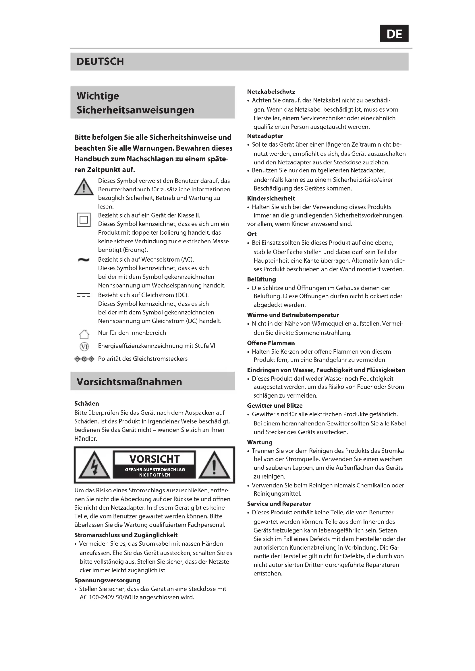 Dieses Symbol verweist den Benutzer darauf, das Benutzerhandbuch für zusätzliche Informationen bezüglich Sicherheit, Betrieb und Wartung zu lesen.Bezieht sich auf ein Gerät der KlasseII.Dieses Symbol kennzeichnet, dass es sich um ein Produkt mit doppelter Isolierung handelt, das keine sichere Verbindung zur elektrischen Masse benötigt (Erdung).Bezieht sich auf Wechselstrom (AC).Dieses Symbol kennzeichnet, dass es sich bei der mit dem Symbol gekennzeichneten Nennspannung um Wechselspannung handelt.Bezieht sich auf Gleichstrom (DC). Dieses Symbol kennzeichnet, dass es sich bei der mit dem Symbol gekennzeichneten Nennspannung um Gleichstrom (DC) handelt.Nur für den InnenbereichEnergieezienzkennzeichnung mit StufeVIPolarität des Gleichstromsteckers Vorsichtsmaßnahmen SchädenBitte überprüfen Sie das Gerät nach dem Auspacken auf Schäden. Ist das Produkt in irgendeiner Weise beschädigt, bedienen Sie das Gerät nicht– wenden Sie sich an Ihren Händler. VORSICHT GEFAHR AUF STROMSCHLAGNICHT ÖFFNENUm das Risiko eines Stromschlags auszuschließen, entfer-nen Sie nicht die Abdeckung auf der Rückseite und önen Sie nicht den Netzadapter. In diesem Gerät gibt es keine Teile, die vom Benutzer gewartet werden können. Bitte überlassen Sie die Wartung qualiziertem Fachpersonal.Stromanschluss und Zugänglichkeit• Vermeiden Sie es, das Stromkabel mit nassen Händen anzufassen. Ehe Sie das Gerät ausstecken, schalten Sie es bitte vollständig aus. Stellen Sie sicher, dass der Netzste-cker immer leicht zugänglich ist.Spannungsversorgung• Stellen Sie sicher, dass das Gerät an eine Steckdose mit AC 100-240V 50/60Hz angeschlossen wird.Netzkabelschutz• Achten Sie darauf, das Netzkabel nicht zu beschädi-gen. Wenn das Netzkabel beschädigt ist, muss es vom Hersteller, einem Servicetechniker oder einer ähnlich qualizierten Person ausgetauscht werden.Netzadapter• Sollte das Gerät über einen längeren Zeitraum nicht be-nutzt werden, empehlt es sich, das Gerät auszuschalten und den Netzadapter aus der Steckdose zu ziehen.• Benutzen Sie nur den mitgelieferten Netzadapter, andernfalls kann es zu einem Sicherheitsrisiko/einer Beschädigung des Gerätes kommen.Kindersicherheit• Halten Sie sich bei der Verwendung dieses Produkts immer an die grundlegenden Sicherheitsvorkehrungen,vor allem, wenn Kinder anwesend sind. Ort