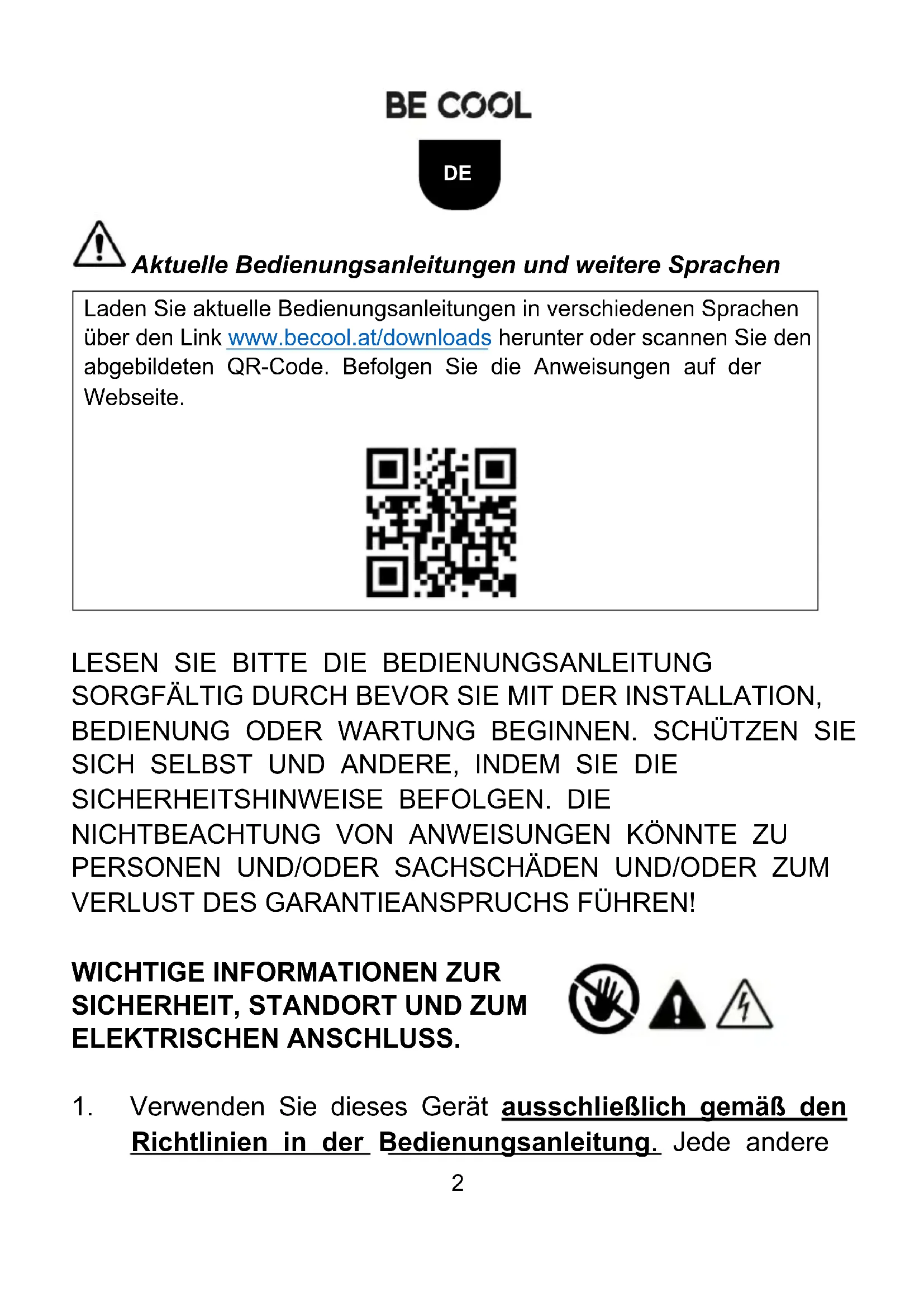 Laden Sie aktuelle Bedienungsanleitungen in verschiedenen Sprachen über den Link www.becool.at/downloads herunter oder scannen Sie den abgebildeten QR-Code. Befolgen Sie die Anweisungen auf der Webseite.