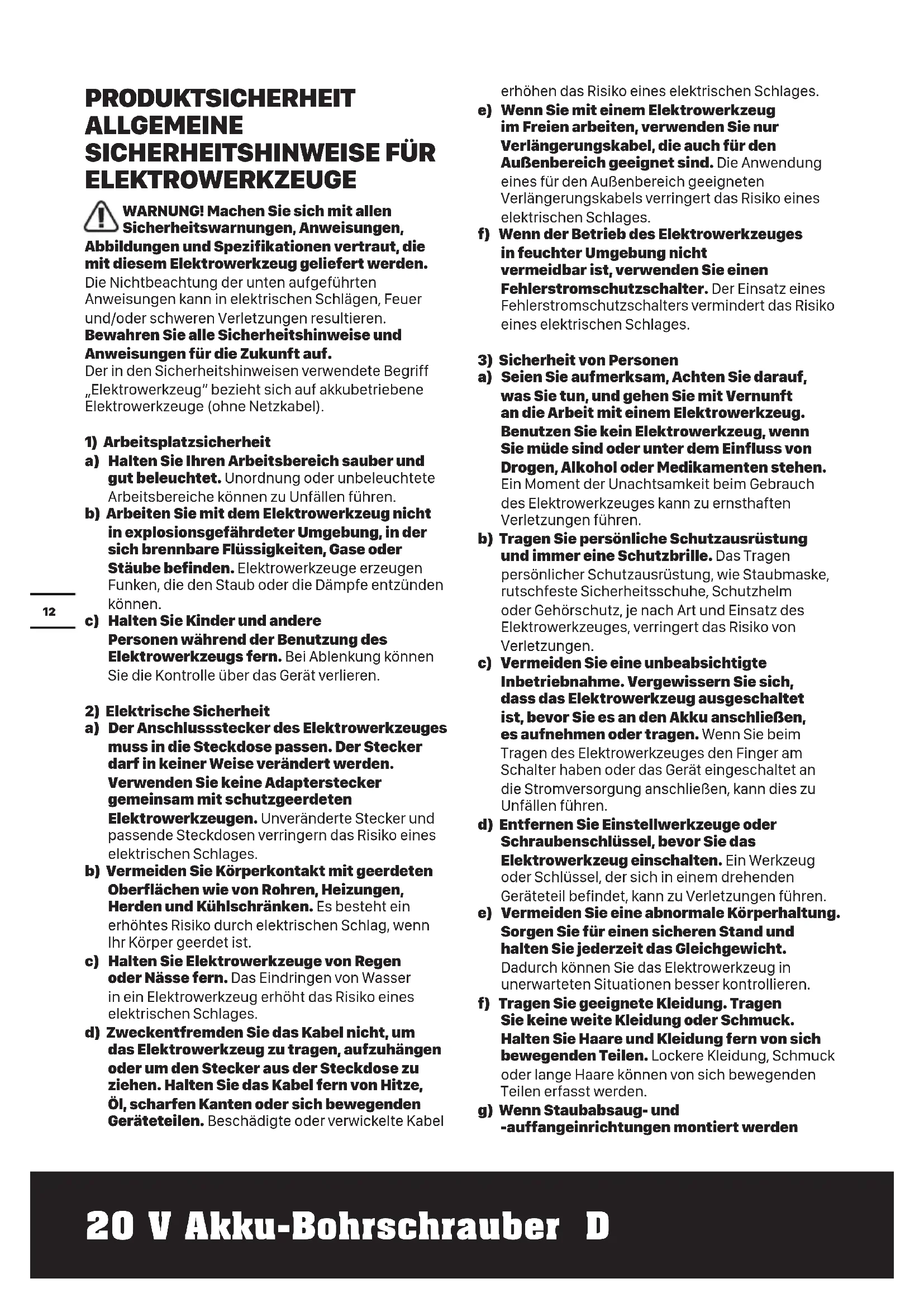 a) Lassen Sie Ihr Elektrowerkzeug nur von qualifiziertem Fachpersonal und nur mit Original-Ersatzteilen reparieren. Damit wird sichergestellt, dass die Sicherheit des Gerätes erhalten bleibt. b) Führen Sie niemals Wartungsarbeiten an beschädigten Akkus durch. Die Wartung von Akkupacks darf nur vom Hersteller selbst oder14 20 V Akku-Bohrschrauber D autorisierten Dienstleistern durchgeführt werden. ZUSÄTZLICHE