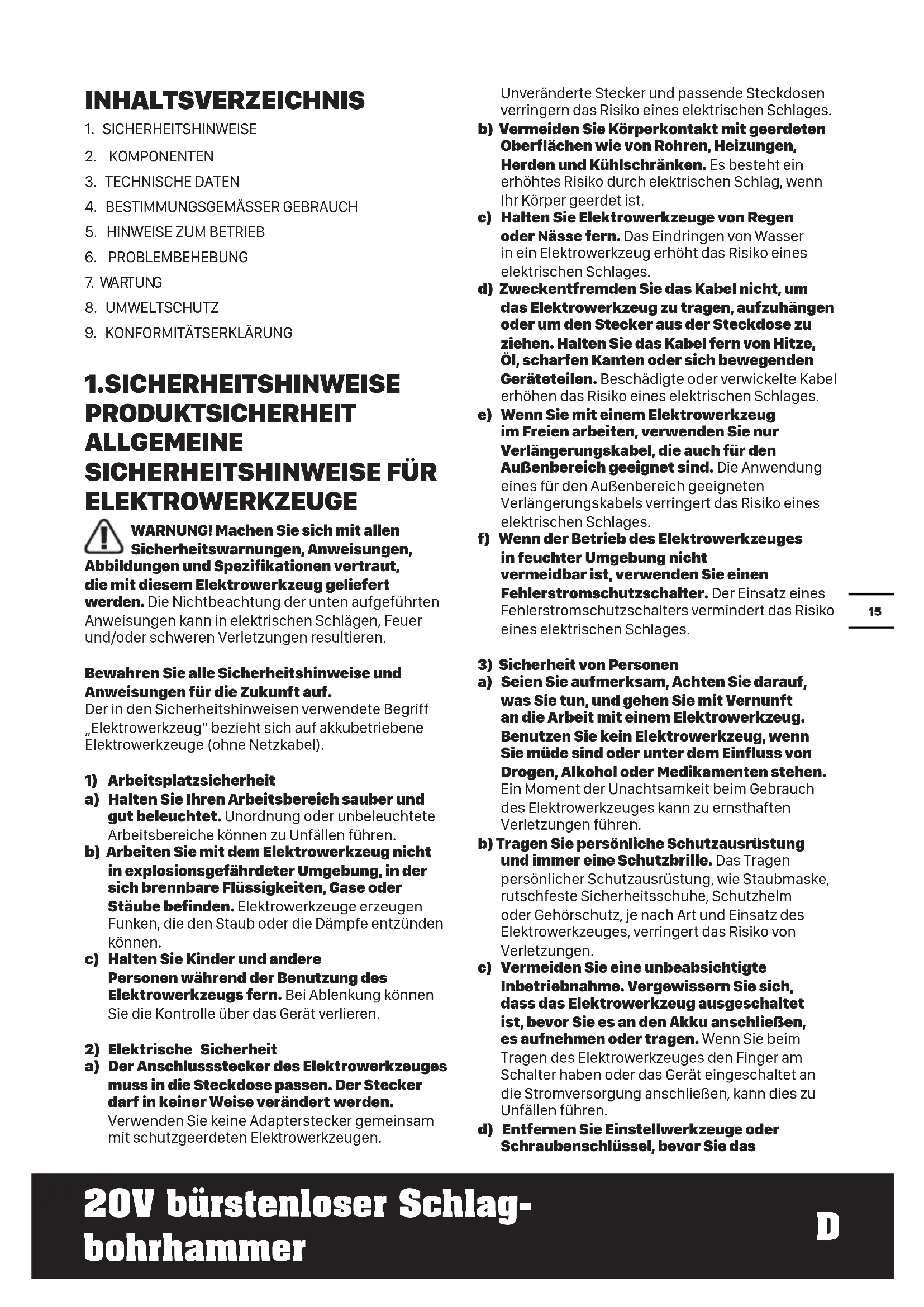 Akkuwerkzeugs a) Laden Sie die Akkus nur in Ladegeräten auf, die vom Hersteller empfohlen werden. Für ein Ladegerät, das für eine bestimmte Art von Akkus geeignet ist, besteht Brandgefahr, wenn es mit anderen Akkus verwendet wird. b) Verwenden Sie nur die dafür vorgesehenen Akkus in den Elektrowerkzeugen. Der Gebrauch von anderen Akkus kann zu Verletzungen und Brandgefahr führen. c) Halten Sie den nicht benutzten Akku fern von Büroklammern, Münzen, Schlüsseln, Nägeln, Schrauben oder anderen kleinen Metallgegenständen, die eine Überbrückung der Kontakte verursachen könnten. Ein Kurzschluss zwischen den Akkukontakten kann Verbrennungen oder Feuer zur Folge haben. d) Bei falscher Anwendung kann Flüssigkeit aus dem Akku austreten. Vermeiden Sie den Kontakt damit. Bei zufälligem Kontakt mit Wasser abspülen. Wenn die Flüssigkeit in die Augen kommt, nehmen Sie zusätzlich ärztliche Hilfe in Anspruch. Austretende Akkuflüssigkeit kann zu Hautreizungen oder Verbrennungen führen. e) Verwenden Sie kein Akkupack oder Werkzeug, das beschädigt ist. Beschädigte oder modifizierte Akkus können unvorhersehbare Reaktionen auslösen und zu Bränden, Explosionen oder Verletzungen führen. f) Setzen Sie das Akkupack oder Werkzeug keinem Feuer oder übermäßig hohen Temperaturen aus. Die Belastung durch Feuer oder Temperaturen über 130 °C kann zur Explosion führen. g) Befolgen Sie alle Ladeanweisungen, und laden Sie das Akkupack oder Werkzeug nicht außerhalb des in den Anweisungen17 20V bürstenloser Schlag- bohrhammer