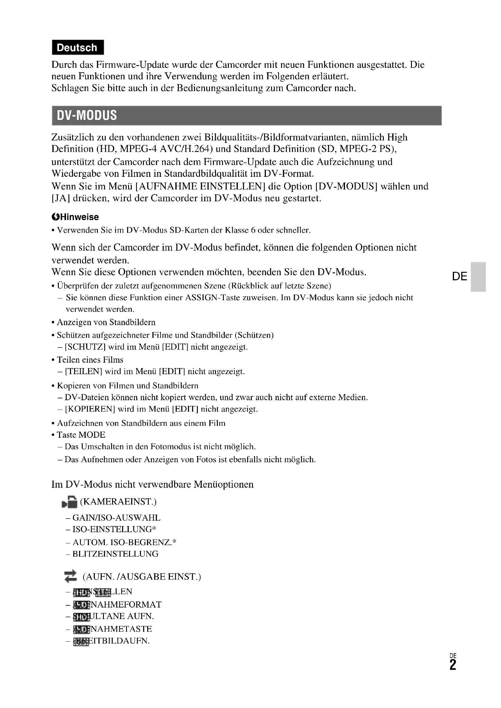 Durch das Firmware-Update wurde der Camcorder mit neuen Funktionen ausgestattet. Die neuen Funktionen und ihre Verwendung werden im Folgenden erläutert. Schlagen Sie bitte auch in der Bedienungsanleitung zum Camcorder nach. Zusätzlich zu den vorhandenen zwei Bildqualitäts-/Bildformatvarianten, nämlich High Definition (HD, MPEG-4 AVC/H.264) und Standard Definition (SD, MPEG-2 PS), unterstützt der Camcorder nach dem Firmware-Update auch die Aufzeichnung und Wiedergabe von Filmen in Standardbildqualität im DV-Format. Wenn Sie im Menü [AUFNAHME EINSTELLEN] die Option [DV-MODUS] wählen und [JA] drücken, wird der Camcorder im DV-Modus neu gestartet. b Hinweise• Verwenden Sie im DV-Modus SD-Karten der Klasse 6 oder schneller. Wenn sich der Camcorder im DV-Modus befindet, können die folgenden Optionen nicht verwendet werden. Wenn Sie diese Optionen verwenden möchten, beenden Sie den DV-Modus.