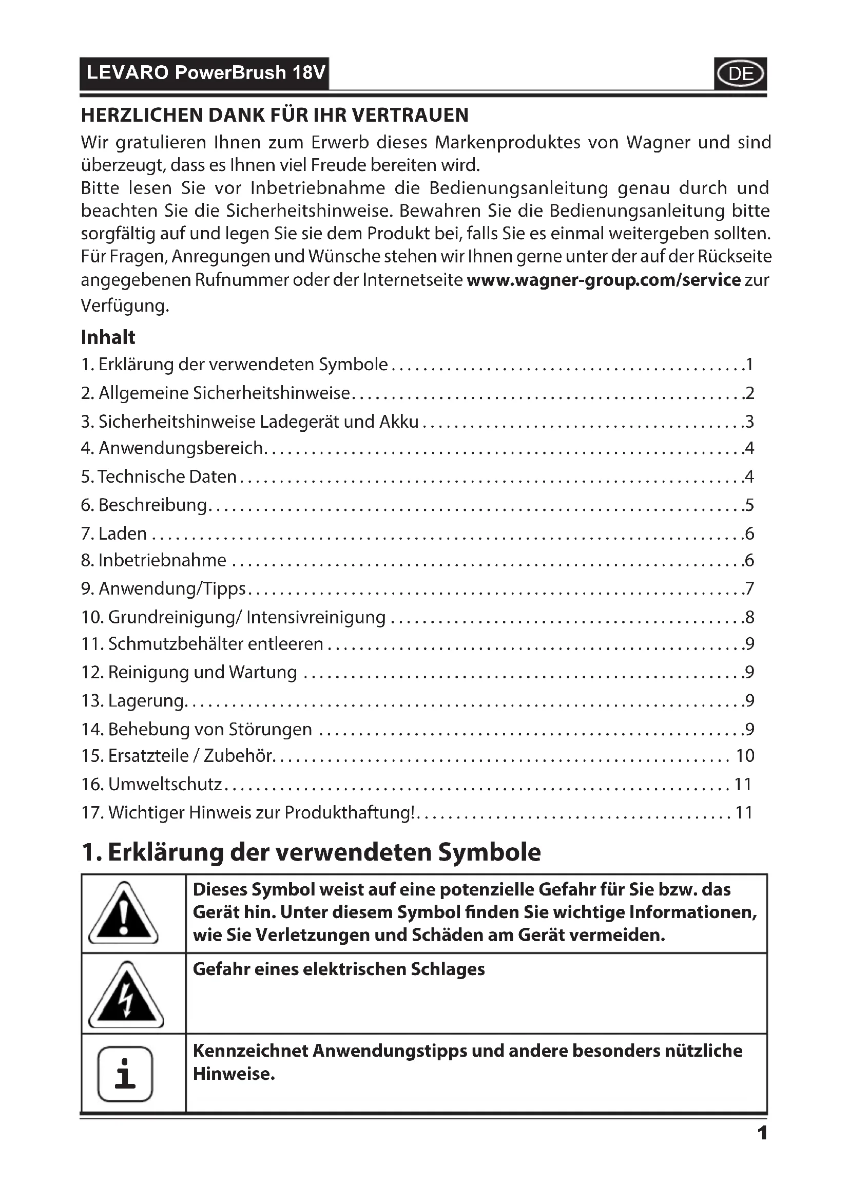 LEVARO PowerBrush 18V 3+1 Jahre Garantie Die J. Wagner GmbH, mit Sitz in D-88677 Markdorf, räumt Ihnen neben der gesetzlichen Gewährleistung für dieses Produkt zusätzlich für den Zeitraum von 36 Monaten eine Garantie (Geräte-Garantie) ein. Der Garantiezeitraum verlängert sich um weitere 12 Monate, wenn das Produkt innerhalb von 28 Tagen nach dem Kauf im Internet unter https://go.wagner-group.com/3plus1 registriert wird. Die Garantie umfasst die kostenlose Behebung der Mängel, die nachweisbar auf die Verwendung von einem nicht einwandfreien Material bei der Herstellung des Produktes oder durch Montagefehler des Produktes zurückzuführen sind, sowie den kostenlosen Ersatz von defekten Teilen, sofern nicht ein Garantieausschluss vorliegt. Die gesetzlichen Sachmängelrechte, die Ihnen als Käufer für den vorgesehenen Zweck ab Übergabe der Kaufsache zustehen, werden durch die Garantie nicht eingeschränkt. Die Garantie sowie Ihr gesetzliches Mängelgewährleistungsrecht erlöschen, wenn das Gerät von anderen Personen als dem autorisierten WAGNER Service - Personal geönet wurde. Die detaillierten Garantiebestimmungen erhalten Sie auf Nachfrage bei unseren autorisierten WAGNER Partnern (siehe Webseite oder Betriebsanleitung) oder in Textform auf unserer Webseite: https://go.wagner-group.com/hf-warranty-conditions - Änderungen vorbehalten- Sehr geehrter WAGNER-Kunde, unser Service-Zentrum bietet Ihnen die beste Unterstützung durch unsere Hotline, die wir für Sie unter der Telefon Nummer 07544 / 505 1541 (zum Ortstarif) geschaltet haben. Unsere Experten garantieren Ihnen schnelle Hilfe und kompetente Auskunft. Sie geben Tipps und Tricks zum Benutzen unserer Produkte. Email: hotline@wagner-group.com13 LEVARO PowerBrush 18V
