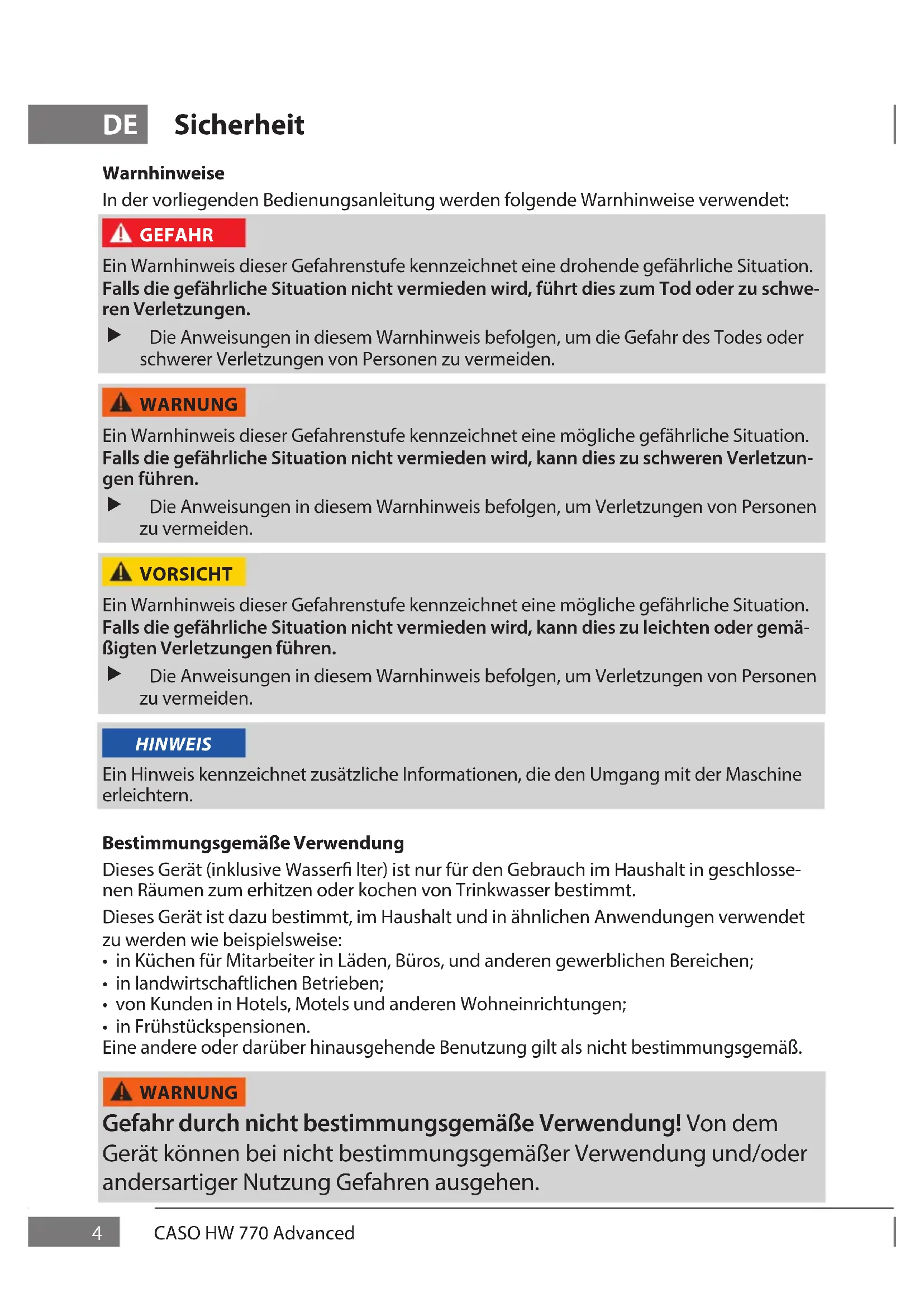 Anschlussdaten / Mains data / Aansluitgegevens / Anslutningsdata / Données de raccordement / Dati connessione / Conexión / Параметры подключения / Dados de ligação / Bağlantı Bilgileri 220 V - 240 V; 50 Hz / 60 Hz Leistungsaufnahme / Power consumption / Power consumptie / E ekt / Puissance consom- mée / Potenza assorbita / Consumo de potencia / Потребляемая мощность / Potência / Mikrodal- ga nominal çıkışı 2200 W - 2600 W Volumen / Volume / Volume / Volym / Volume / Volume / Volumen / Объем / Volume / Cilt 2,7 L Außenabmessungen (B/H/T) / External mea- surements (W x H x D) / Afmetingen (BxHxD) / Yttermått (B/H/D) / Dimensions externes (l/h/p) / Misure esterne (L/H/P) / Dimensiones exteriores (An/H/P) /Габаритные размеры (Ш/В/Г) / Medi- das (C x A x P) / Dış Gövdenin Boyutu (Y/G/D) 150 mm x 300 mm x 270 mm Nettogewicht / Net weight / Nettogewicht / Nettovikt / Poids net / Peso netto / Peso net / Вес / Peso / Net ağırlık 2,28 kg Garantiegeber: CASO GmbH | Rai eisenstraße 9 | D-59757 Arnsberg Service-Hotline International: Tel.: +49 (0) 29 32 / 80 55 4 – 99, Fax: +49 (0) 29 32 / 80 55 4 – 77 eMail: kundenservice@caso-design.de | Internet: www.caso-design.de Sie nden die aktuellste Version der Bedienungsanleitung auch auf unserer Homepage: www.caso-design.de Dokument-Nr.: 01889 29-12-2023 Bildabweichungen zur Originalware sind technisch bedingt möglich. Druck – und Satzfehler vorbehalten. © 2023 CASO GmbH4 CASO HW 770 Advanced DE Sicherheit Warnhinweise In der vorliegenden Bedienungsanleitung werden folgende Warnhinweise verwendet: Ein Warnhinweis dieser Gefahrenstufe kennzeichnet eine drohende gefährliche Situation. Falls die gefährliche Situation nicht vermieden wird, führt dies zum Tod oder zu schwe- ren Verletzungen. Die Anweisungen in diesem Warnhinweis befolgen, um die Gefahr des Todes oder schwerer Verletzungen von Personen zu vermeiden. Ein Warnhinweis dieser Gefahrenstufe kennzeichnet eine mögliche gefährliche Situation. Falls die gefährliche Situation nicht vermieden wird, kann dies zu schweren Verletzun- gen führen. Die Anweisungen in diesem Warnhinweis befolgen, um Verletzungen von Personen zu vermeiden. Ein Warnhinweis dieser Gefahrenstufe kennzeichnet eine mögliche gefährliche Situation. Falls die gefährliche Situation nicht vermieden wird, kann dies zu leichten oder gemä- ßigten Verletzungen führen. Die Anweisungen in diesem Warnhinweis befolgen, um Verletzungen von Personen zu vermeiden. Ein Hinweis kennzeichnet zusätzliche Informationen, die den Umgang mit der Maschine erleichtern. Bestimmungsgemäße Verwendung Dieses Gerät (inklusive Wasser lter) ist nur für den Gebrauch im Haushalt in geschlosse- nen Räumen zum erhitzen oder kochen von Trinkwasser bestimmt. Dieses Gerät ist dazu bestimmt, im Haushalt und in ähnlichen Anwendungen verwendet zu werden wie beispielsweise: