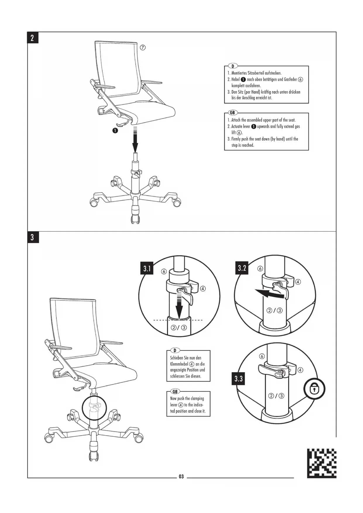 03BEDIENUNG OPERATION D GB Height adjustment with safety gas lift. Depth adjustment of the backrest and height adjustment of the armrests (by hand). Höhenverstellung durch Sicherheitsgasfeder. Tiefenverstellung der Rückenlehne und Höhenverstellung der Armlehnen (per Hand). Video Verstellung der Rückenlehne Video adjustment of the backrest