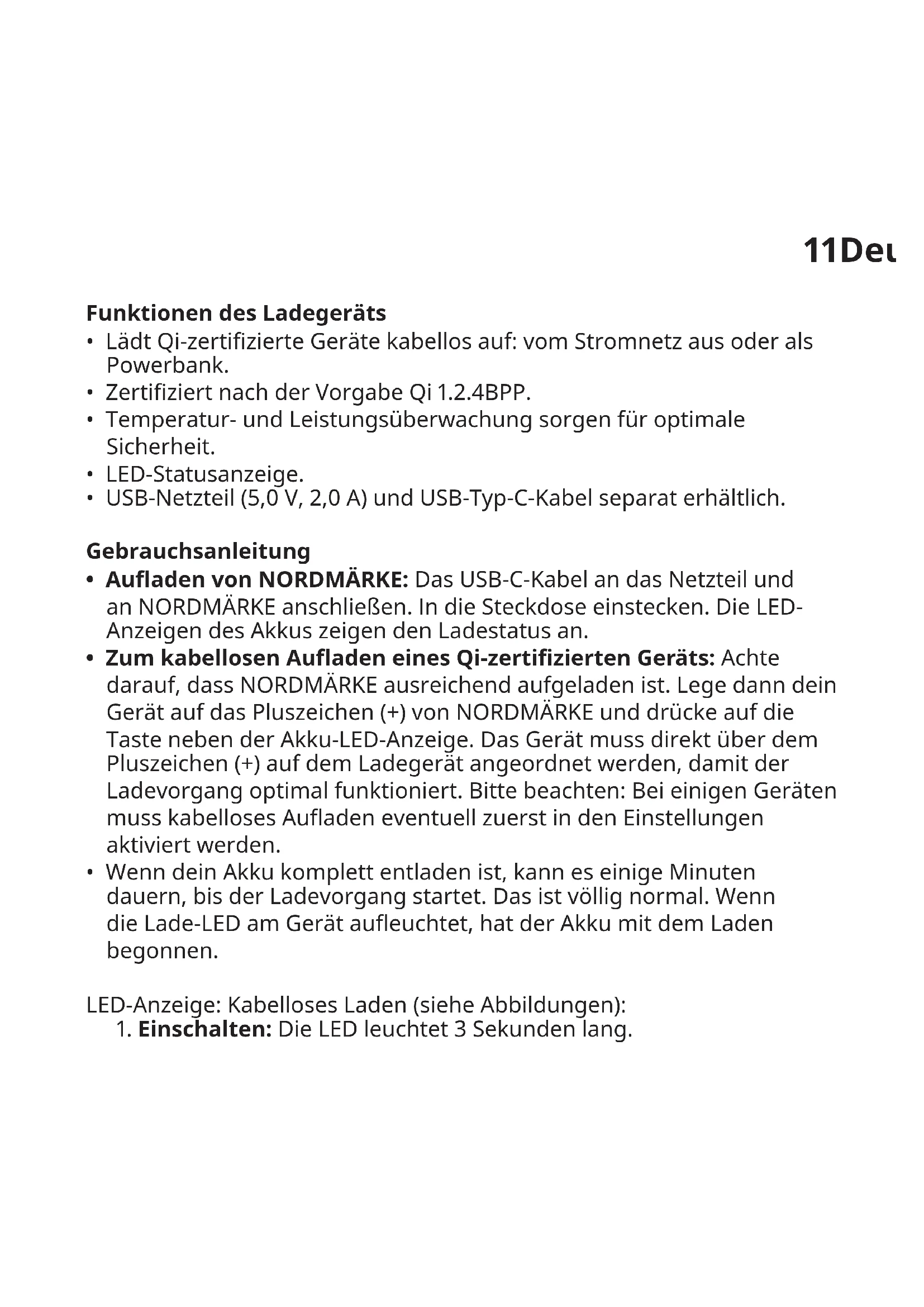 - Eventuell austretende Flüssigkeiten dürfen nicht mit Haut oder Augen in Berührung kommen. Produktinstandhaltung Niemals versuchen, das Produkt selbst zu reparieren. Durch das Önen oder Entfernen der Abdeckung kann man sich gefährlichen Spannungen und anderen Risiken aussetzen. INFORMATIONZURF-Belastung Gem. den Funkfrequenz-Richtlinien soll der Endnutzer im Normalbetrieb davon absehen, sich dem Gerät um mehr als 10 cm zu nähern. Technische Daten Fabrikat: E2008 NORDMÄRKE Akkuleistung: 6500 mAh/24,0 Wh, Li-Ionen Eingang: 5,0 V DC, 2,0 A, 10 W USB-Typ-C Nur für den Innenbereich geeignet Betriebsfrequenz:112 - 148 kHz Ausgangsleistung: -2 dBμA/m bei 10 m15 Hersteller: IKEA of Sweden AB Adresse:Box702,S34381Älmhult/Schweden. Das "Qi"-Symbol ist ein Warenzeichen des Unternehmens Wireless Power Consortium. Das Symbol mit der durchgestrichenen Abfalltonne bedeutet, dass das Produkt getrennt vom Haushaltsabfall entsorgt werden muss. Das Produkt muss gem. der örtlichen Entsorgungsvorschriften der Wiederverwertung zugeführt werden. Durch separate Entsorgung des Produkts trägst du zur Minderung des Verbrennungs- oder Deponieabfalls bei und reduzierst eventuelle negative Einwirkungen auf die menschliche Gesundheit und die Umwelt. Weitere Informationen im IKEA Einrichtungshaus.16Français Caractéristiques du chargeur