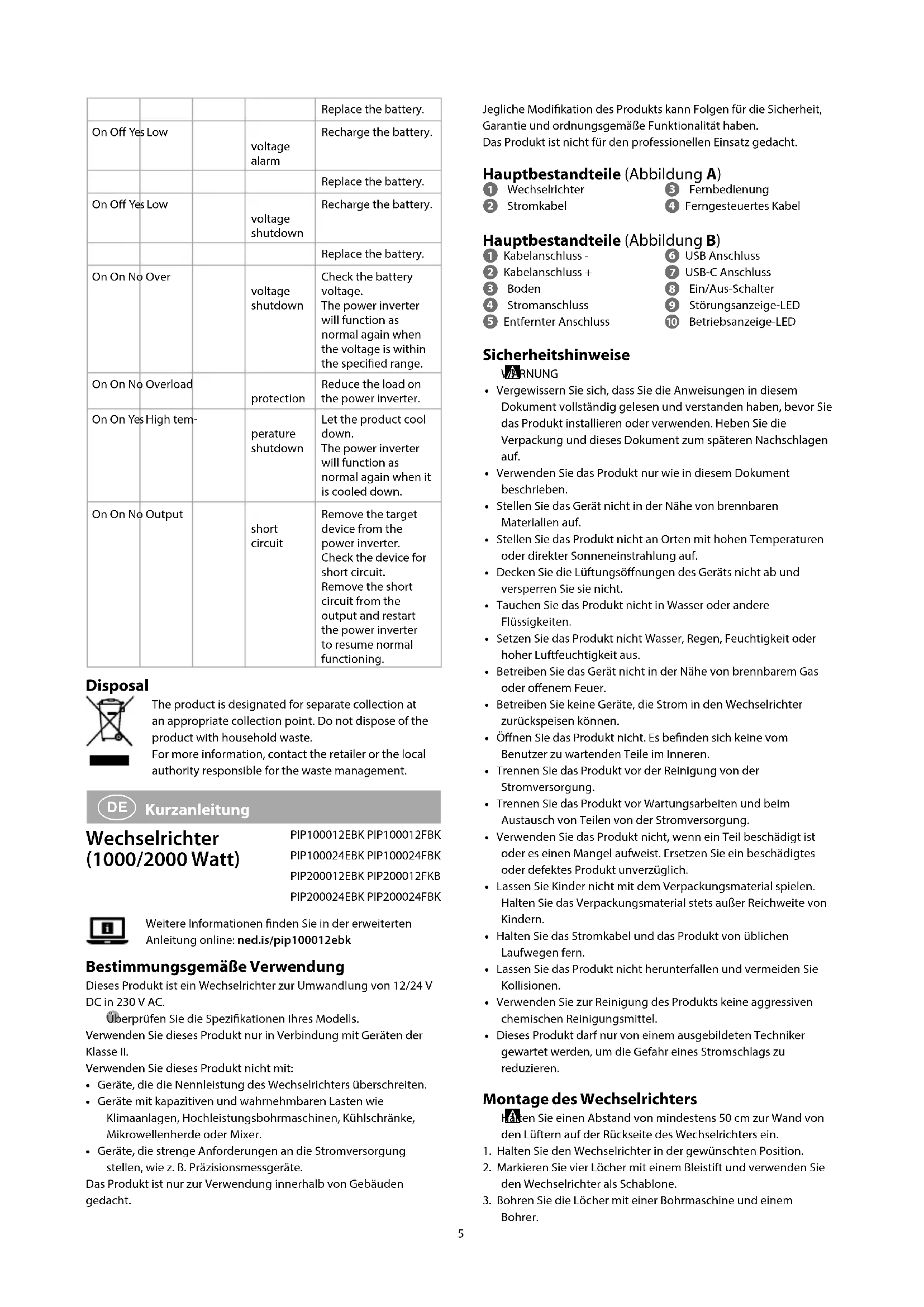 PIP200012FBK - Wechselrichter NEDIS - Kostenlose Bedienungsanleitung