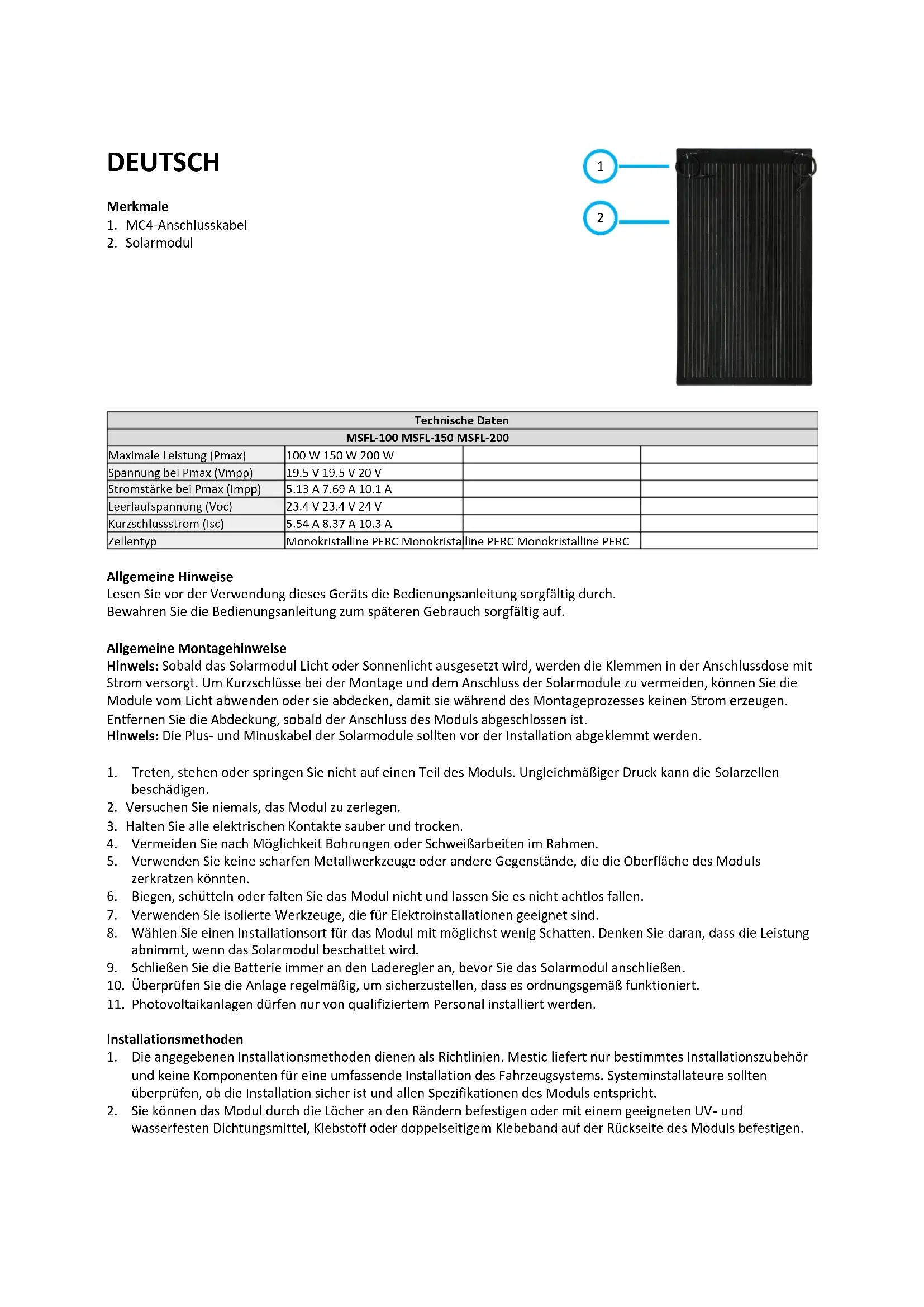 MSFL150 - Solarmodul Mestic - Kostenlose Bedienungsanleitung