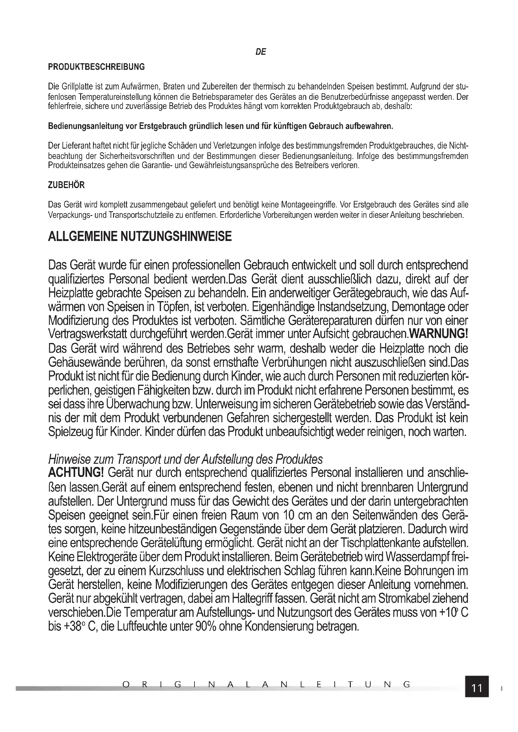 PRODUKTBESCHREIBUNG Die Grillplatte ist zum Aufwärmen, Braten und Zubereiten der thermisch zu behandelnden Speisen bestimmt. Aufgrund der stu- fenlosen Temperatureinstellung können die Betriebsparameter des Gerätes an die Benutzerbedürfnisse angepasst werden. Der fehlerfreie, sichere und zuverlässige Betrieb des Produktes hängt vom korrekten Produktgebrauch ab, deshalb: Bedienungsanleitung vor Erstgebrauch gründlich lesen und für künftigen Gebrauch aufbewahren. Der Lieferant haftet nicht für jegliche Schäden und Verletzungen infolge des bestimmungsfremden Produktgebrauches, die Nicht- beachtung der Sicherheitsvorschriften und der Bestimmungen dieser Bedienungsanleitung. Infolge des bestimmungsfremden Produkteinsatzes gehen die Garantie- und Gewährleistungsansprüche des Betreibers verloren. ZUBEHÖR Das Gerät wird komplett zusammengebaut geliefert und benötigt keine Montageeingriff e. Vor Erstgebrauch des Gerätes sind alle Verpackungs- und Transportschutzteile zu entfernen. Erforderliche Vorbereitungen werden weiter in dieser Anleitung beschrieben. ALLGEMEINE NUTZUNGSHINWEISE Das Gerät wurde für einen professionellen Gebrauch entwickelt und soll durch entsprechend qualifi ziertes Personal bedient werden.Das Gerät dient ausschließlich dazu, direkt auf der Heizplatte gebrachte Speisen zu behandeln. Ein anderweitiger Gerätegebrauch, wie das Auf- wärmen von Speisen in Töpfen, ist verboten. Eigenhändige Instandsetzung, Demontage oder Modifi zierung des Produktes ist verboten. Sämtliche Gerätereparaturen dürfen nur von einer Vertragswerkstatt durchgeführt werden.Gerät immer unter Aufsicht gebrauchen.WARNUNG! Das Gerät wird während des Betriebes sehr warm, deshalb weder die Heizplatte noch die Gehäusewände berühren, da sonst ernsthafte Verbrühungen nicht auszuschließen sind.Das Produkt ist nicht für die Bedienung durch Kinder, wie auch durch Personen mit reduzierten kör- perlichen, geistigen Fähigkeiten bzw. durch im Produkt nicht erfahrene Personen bestimmt, es sei dass ihre Überwachung bzw. Unterweisung im sicheren Gerätebetrieb sowie das Verständ- nis der mit dem Produkt verbundenen Gefahren sichergestellt werden. Das Produkt ist kein Spielzeug für Kinder. Kinder dürfen das Produkt unbeaufsichtigt weder reinigen, noch warten. Hinweise zum Transport und der Aufstellung des Produktes ACHTUNG! Gerät nur durch entsprechend qualifi ziertes Personal installieren und anschlie- ßen lassen.Gerät auf einem entsprechend festen, ebenen und nicht brennbaren Untergrund aufstellen. Der Untergrund muss für das Gewicht des Gerätes und der darin untergebrachten Speisen geeignet sein.Für einen freien Raum von 10 cm an den Seitenwänden des Gerä- tes sorgen, keine hitzeunbeständigen Gegenstände über dem Gerät platzieren. Dadurch wird eine entsprechende Gerätelüftung ermöglicht. Gerät nicht an der Tischplattenkante aufstellen. Keine Elektrogeräte über dem Produkt installieren. Beim Gerätebetrieb wird Wasserdampf frei- gesetzt, der zu einem Kurzschluss und elektrischen Schlag führen kann.Keine Bohrungen im Gerät herstellen, keine Modifi zierungen des Gerätes entgegen dieser Anleitung vornehmen. Gerät nur abgekühlt vertragen, dabei am Haltegriff fassen. Gerät nicht am Stromkabel ziehend verschieben.Die Temperatur am Aufstellungs- und Nutzungsort des Gerätes muss von +10