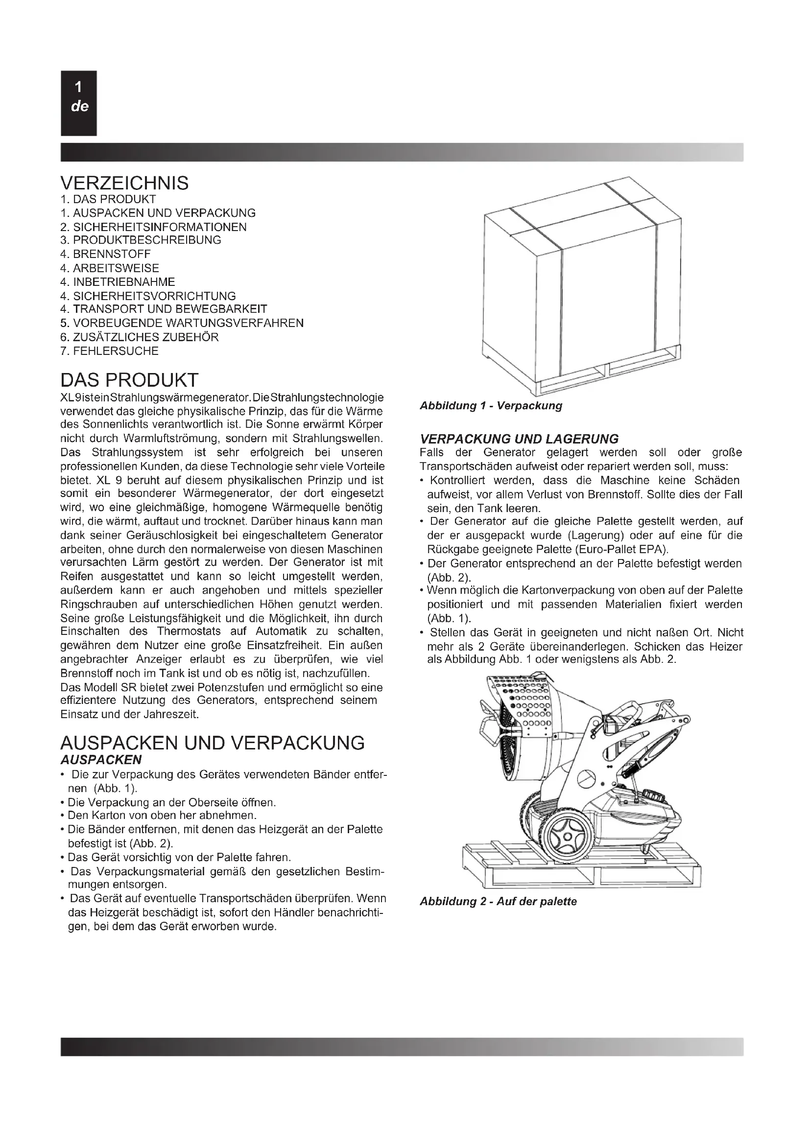 - Stellen das Gerät in geeigneten und nicht naßen Ort. Nicht mehr als 2 Geräte übereinanderlegen. Schicken das Heizer als Abbildung Abb. 1 oder wenigstens als Abb. 2. Abbildung 1 - Verpackung Abbildung 2 - Auf der palette2