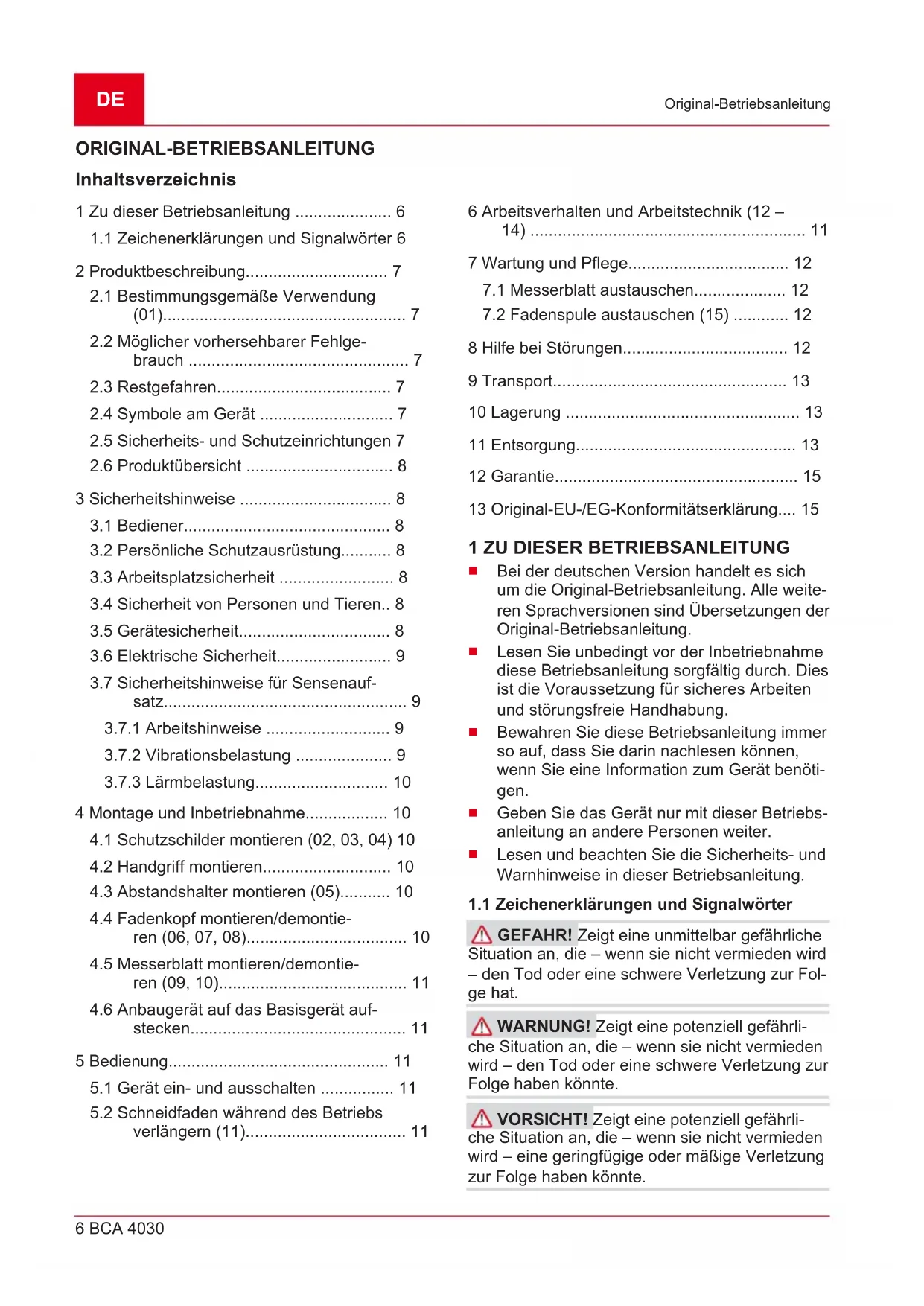6 BCA 4030 Original-Betriebsanleitung ORIGINAL-BETRIEBSANLEITUNG Inhaltsverzeichnis 1 Zu dieser Betriebsanleitung ..................... 6