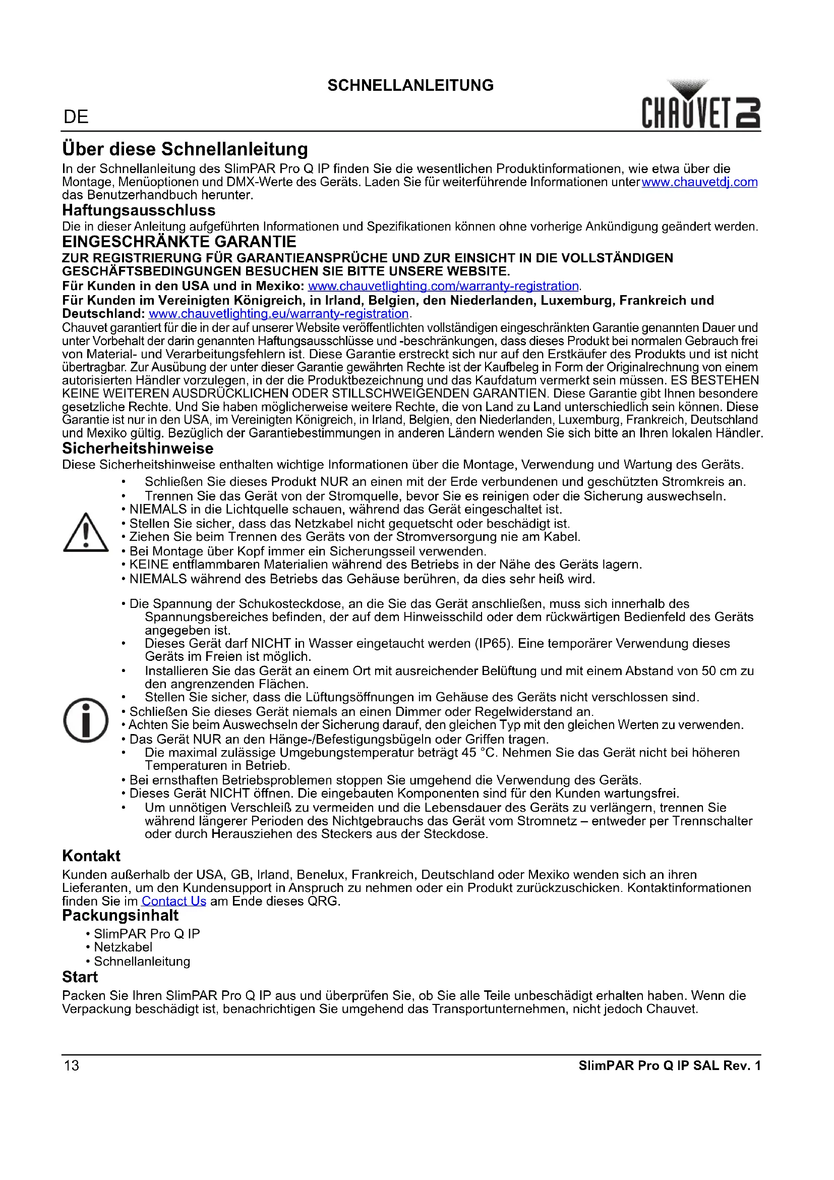Chauvet garantiert für die in der auf unserer Website veröffentlichten vollständigen eingeschränkten Garantie genannten Dauer und unter Vorbehalt der darin genannten Haftungsausschlüsse und -beschränkungen, dass dieses Produkt bei normalen Gebrauch frei von Material- und Verarbeitungsfehlern ist. Diese Garantie erstreckt sich nur auf den Erstkäufer des Produkts und ist nicht übertragbar. Zur Ausübung der unter dieser Garantie gewährten Rechte ist der Kaufbeleg in Form der Originalrechnung von einem autorisierten Händler vorzulegen, in der die Produktbezeichnung und das Kaufdatum vermerkt sein müssen. ES BESTEHEN KEINE WEITEREN AUSDRÜCKLICHEN ODER STILLSCHWEIGENDEN GARANTIEN. Diese Garantie gibt Ihnen besondere gesetzliche Rechte. Und Sie haben möglicherweise weitere Rechte, die von Land zu Land unterschiedlich sein können. Diese Garantie ist nur in den USA, im Vereinigten Königreich, in Irland, Belgien, den Niederlanden, Luxemburg, Frankreich, Deutschland und Mexiko gültig. Bezüglich der Garantiebestimmungen in anderen Ländern wenden Sie sich bitte an Ihren lokalen Händler. Sicherheitshinweise Diese Sicherheitshinweise enthalten wichtige Informationen über die Montage, Verwendung und Wartung des Geräts. Kontakt Kunden außerhalb der USA, GB, Irland, Benelux, Frankreich, Deutschland oder Mexiko wenden sich an ihren Lieferanten, um den Kundensupport in Anspruch zu nehmen oder ein Produkt zurückzuschicken. Kontaktinformationen finden Sie im Contact Us am Ende dieses QRG. Packungsinhalt Start Packen Sie Ihren SlimPAR Pro Q IP aus und überprüfen Sie, ob Sie alle Teile unbeschädigt erhalten haben. Wenn die Verpackung beschädigt ist, benachrichtigen Sie umgehend das Transportunternehmen, nicht jedoch Chauvet.