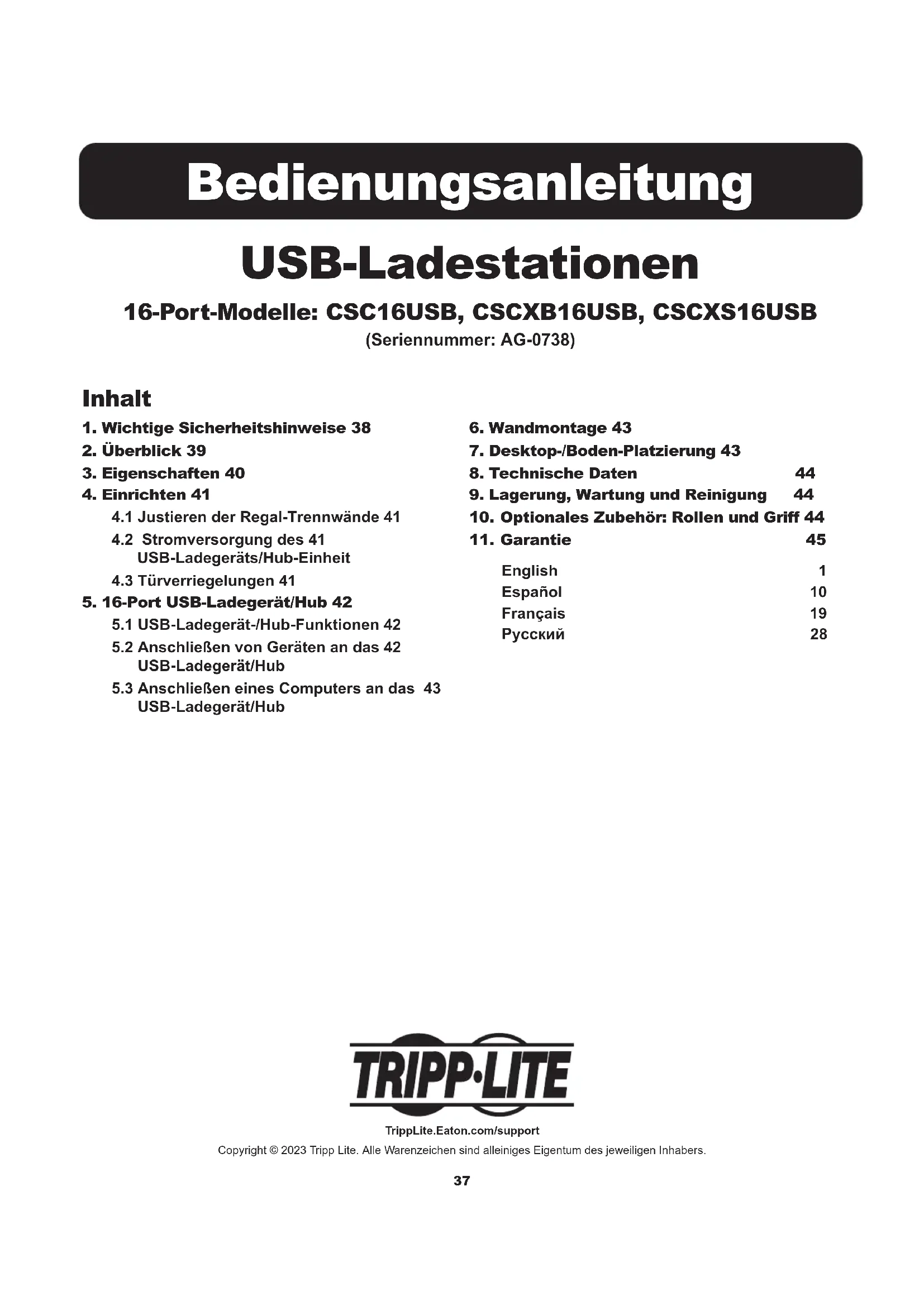 English 1 Español 10 Français 19 Русский 28 USB-Ladestationen 16-Port-Modelle: CSC16USB, CSCXB16USB, CSCXS16USB (Seriennummer:AG-0738) Bedienungsanleitung TrippLite.Eaton.com/support Copyright © 2023 Tripp Lite. Alle Warenzeichen sind alleiniges Eigentum des jeweiligen Inhabers.38