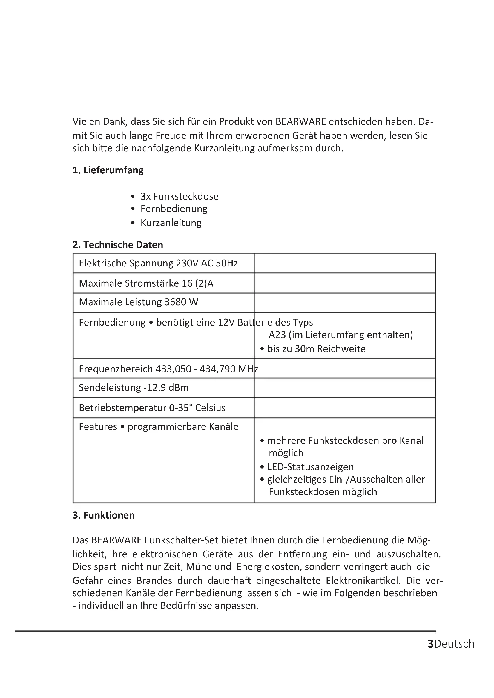 Das BEARWARE Funkschalter-Set bietet Ihnen durch die Fernbedienung die Mög- lichkeit, Ihre elektronischen Geräte aus der Enernung ein- und auszuschalten. Dies spart nicht nur Zeit, Mühe und Energiekosten, sondern verringert auch die Gefahr eines Brandes durch dauerha eingeschaltete Elektronikarkel. Die ver- schiedenen Kanäle der Fernbedienung lassen sich - wie im Folgenden beschrieben - individuell an Ihre Bedürfnisse anpassen. Elektrische Spannung 230V AC 50Hz Maximale Stromstärke 16 (2)A Maximale Leistung 3680 W Fernbedienung • benögt eine 12V Baerie des Typs A23 (im Lieferumfang enthalten)