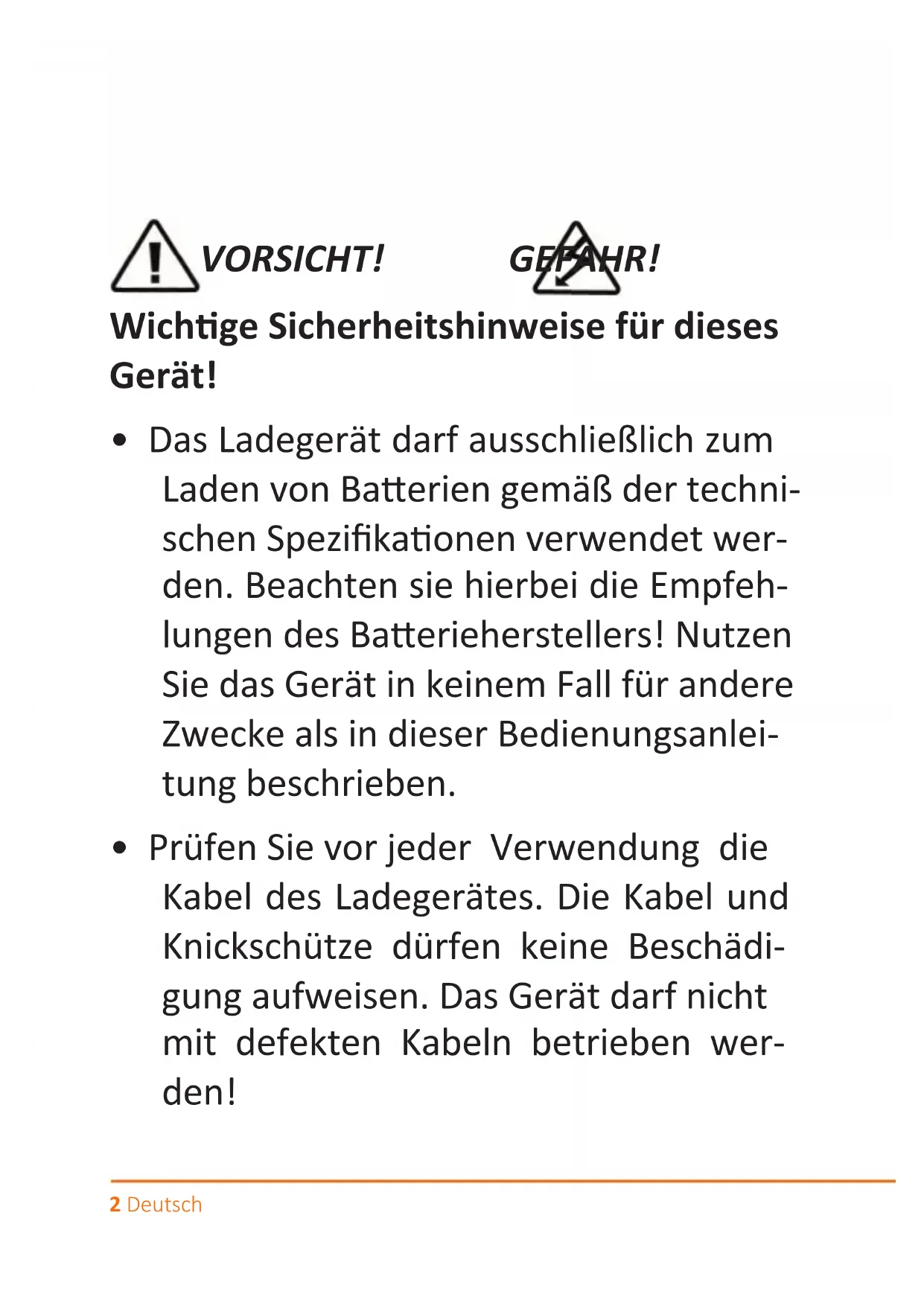 Prüfen Sie vor jeder Verwendung die Kabel des Ladegerätes. Die Kabel und Knickschütze)dürfen keine Beschädigung aufweisen. Das Gerät darf nicht mit defekten Kabeln betrieben werden!