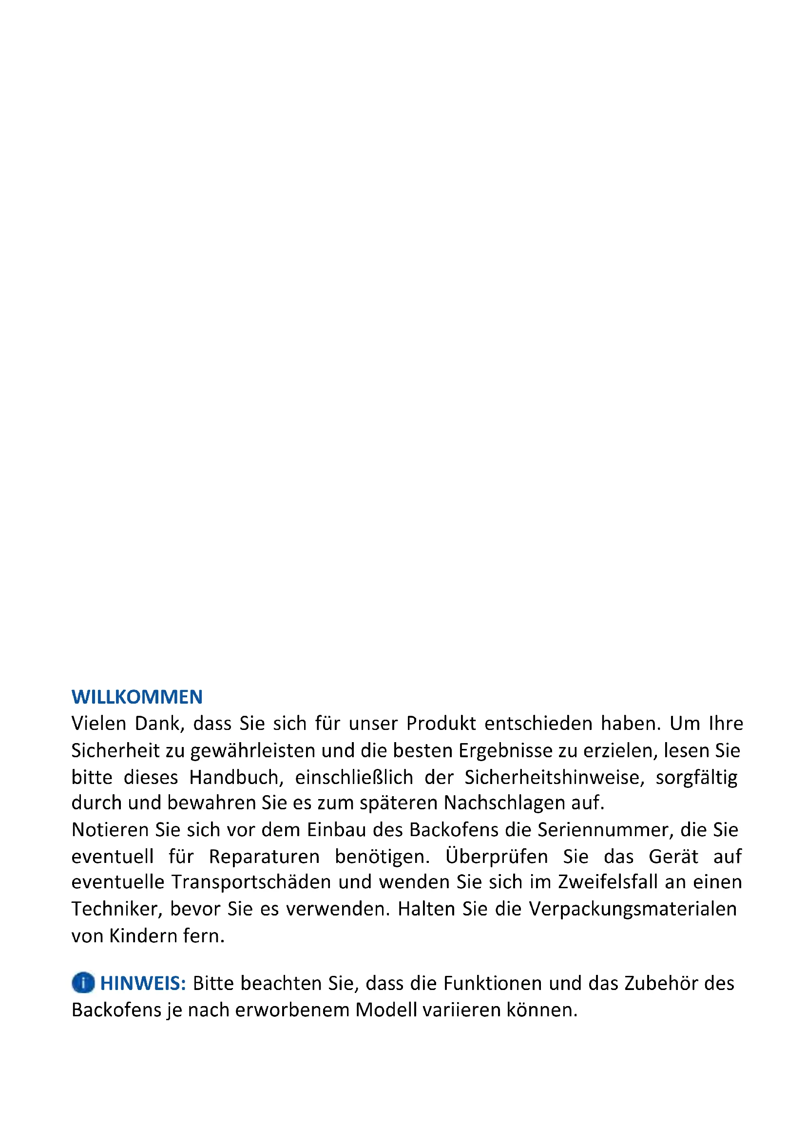 OPPURE Ammortizzatore Ammortizzatore mmWILLKOMMEN Vielen Dank, dass Sie sich für unser Produkt entschieden haben. Um Ihre Sicherheit zu gewährleisten und die besten Ergebnisse zu erzielen, lesen Sie bitte dieses Handbuch, einschließlich der Sicherheitshinweise, sorgfältig durch und bewahren Sie es zum späteren Nachschlagen auf. Notieren Sie sich vor dem Einbau des Backofens die Seriennummer, die Sie eventuell für Reparaturen benötigen. Überprüfen Sie das Gerät auf eventuelle Transportschäden und wenden Sie sich im Zweifelsfall an einen Techniker, bevor Sie es verwenden. Halten Sie die Verpackungsmaterialen von Kindern fern. HINWEIS: Bitte beachten Sie, dass die Funktionen und das Zubehör des Backofens je nach erworbenem Modell variieren können.ZUSAMMENFASSUNG
