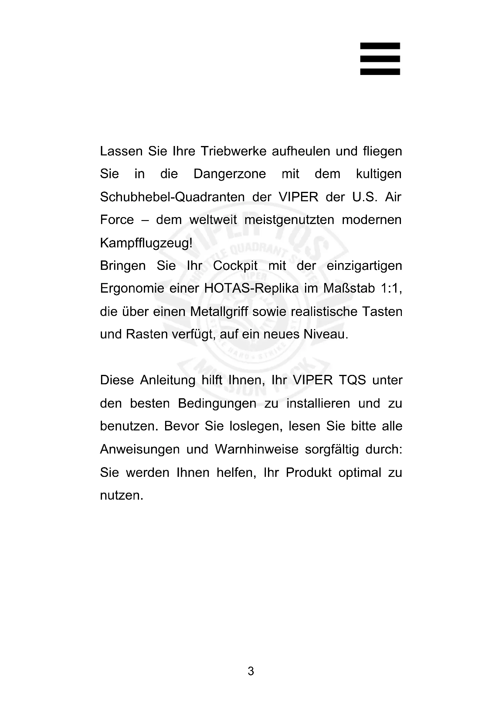 Lassen Sie Ihre Triebwerke aufheulen und fliegen Sie in die Dangerzone mit dem kultigen Schubhebel-Quadranten der VIPER der U.S. Air Force – dem weltweit meistgenutzten modernen Kampfflugzeug! Bringen Sie Ihr Cockpit mit der einzigartigen Ergonomie einer HOTAS-Replika im Maßstab 1:1, die über einen Metallgriff sowie realistische Tasten und Rasten verfügt, auf ein neues Niveau. Diese Anleitung hilft Ihnen, Ihr VIPER TQS unter den besten Bedingungen zu installieren und zu benutzen. Bevor Sie loslegen, lesen Sie bitte alle Anweisungen und Warnhinweise sorgfältig durch: Sie werden Ihnen helfen, Ihr Produkt optimal zu nutzen.4