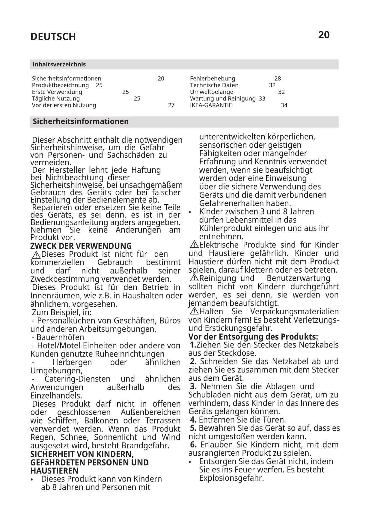 Sicherheitsinformationen 20 Produktbezeichnung 25 Erste Verwendung 25 Tägliche Nutzung 25 Vor der ersten Nutzung 27 Inhaltsverzeichnis Fehlerbehebung 28 Technische Daten 32 Umweltbelange 32 Wartung und Reinigung 33 IKEA-GARANTIE 34 Sicherheitsinformationen Dieser Abschnitt enthält die notwendigen Sicherheitshinweise, um die Gefahr von Personen- und Sachschäden zu vermeiden. Der Hersteller lehnt jede Haftung bei Nichtbeachtung dieser Sicherheitshinweise, bei unsachgemäßem Gebrauch des Geräts oder bei falscher Einstellung der Bedienelemente ab. Reparieren oder ersetzen Sie keine Teile des Geräts, es sei denn, es ist in der Bedienungsanleitung anders angegeben. Nehmen Sie keine Änderungen am Produkt vor.