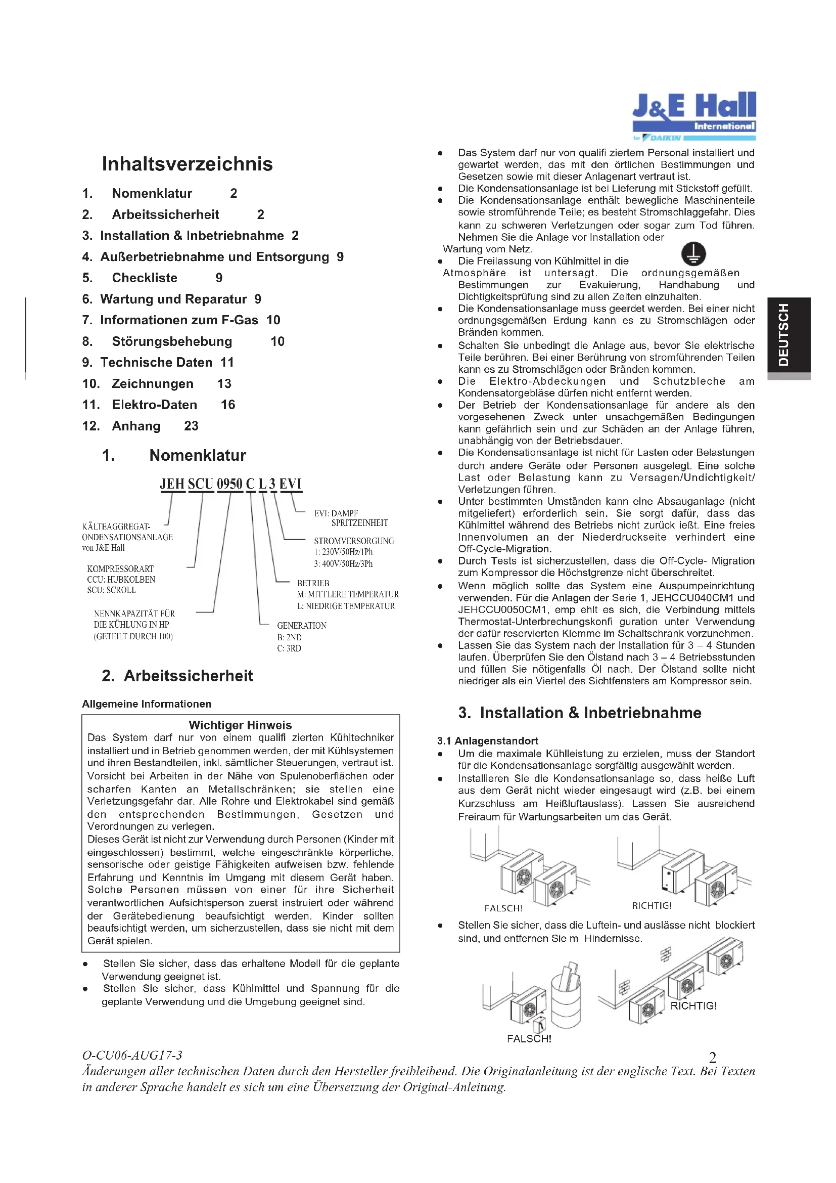 EVI: DAMPF SPRITZEINHEITSTROMVERSORGUNG1: 230V/50Hz/1Ph3: 400V/50Hz/3PhBETRIEBM: MITTLERE TEMPERATURL: NIEDRIGE TEMPERATURGENERATIONB: 2NDC: 3RDNENNKAPAZITÄT FÜRDIE KÜHLUNG IN HP(GETEILT DURCH 100)KOMPRESSORARTCCU: HUBKOLBENSCU: SCROLLKÄLTEAGGREGAT-ONDENSATIONSANLAGEvon J&E Hall ● Das System darf nur von qualifi ziertem Personal installiert und gewartet werden, das mit den örtlichen Bestimmungen und Gesetzen sowie mit dieser Anlagenart vertraut ist.● Die Kondensationsanlage ist bei Lieferung mit Stickstoff gefüllt.● Die Kondensationsanlage enthält bewegliche Maschinenteile sowie stromführende Teile; es besteht Stromschlaggefahr. Dies kann zu schweren Verletzungen oder sogar zum Tod führen. Nehmen Sie die Anlage vor Installation oder Wartung vom Netz.● Die Freilassung von Kühlmittel in die Atmosphäre ist untersagt. Die ordnungsgemäßen Bestimmungen zur Evakuierung, Handhabung und Dichtigkeitsprüfung sind zu allen Zeiten einzuhalten. ● Die Kondensationsanlage muss geerdet werden. Bei einer nicht ordnungsgemäßen Erdung kann es zu Stromschlägen oder Bränden kommen. ● Schalten Sie unbedingt die Anlage aus, bevor Sie elektrische Teile berühren. Bei einer Berührung von stromführenden Teilen kann es zu Stromschlägen oder Bränden kommen. ● Die Elektro-Abdeckungen und Schutzbleche am Kondensatorgebläse dürfen nicht entfernt werden.● Der Betrieb der Kondensationsanlage für andere als den vorgesehenen Zweck unter unsachgemäßen Bedingungen kann gefährlich sein und zur Schäden an der Anlage führen, unabhängig von der Betriebsdauer. ● Die Kondensationsanlage ist nicht für Lasten oder Belastungen durch andere Geräte oder Personen ausgelegt. Eine solche Last oder Belastung kann zu Versagen/Undichtigkeit/ Verletzungen führen.● Unter bestimmten Umständen kann eine Absauganlage (nicht mitgeliefert) erforderlich sein. Sie sorgt dafür, dass das Kühlmittel während des Betriebs nicht zurück ießt. Eine freies Innenvolumen an der Niederdruckseite verhindert eine Off-Cycle-Migration. ● Durch Tests ist sicherzustellen, dass die Off-Cycle- Migration zum Kompressor die Höchstgrenze nicht überschreitet. ● Wenn möglich sollte das System eine Auspumpeinrichtung verwenden. Für die Anlagen der Serie 1, JEHCCU040CM1 und JEHCCU0050CM1, emp ehlt es sich, die Verbindung mittels Thermostat-Unterbrechungskonfi guration unter Verwendung der dafür reservierten Klemme im Schaltschrank vorzunehmen. ● Lassen Sie das System nach der Installation für 3 – 4 Stunden laufen. Überprüfen Sie den Ölstand nach 3 – 4 Betriebsstunden und füllen Sie nötigenfalls Öl nach. Der Ölstand sollte nicht niedriger als ein Viertel des Sichtfensters am Kompressor sein.3.1 Anlagenstandort● Um die maximale Kühlleistung zu erzielen, muss der Standort für die Kondensationsanlage sorgfältig ausgewählt werden. ● Installieren Sie die Kondensationsanlage so, dass heiße Luft aus dem Gerät nicht wieder eingesaugt wird (z.B. bei einem Kurzschluss am Heißluftauslass). Lassen Sie ausreichend Freiraum für Wartungsarbeiten um das Gerät. ● Stellen Sie sicher, dass die Luftein- und auslässe nicht blockiert sind, und entfernen Sie m Hindernisse.RICHTIG!FALSCH!FALSCH!RICHTIG! ● Stellen Sie sicher, dass das erhaltene Modell für die geplante Verwendung geeignet ist. ● Stellen Sie sicher, dass Kühlmittel und Spannung für die geplante Verwendung und die Umgebung geeignet sind.