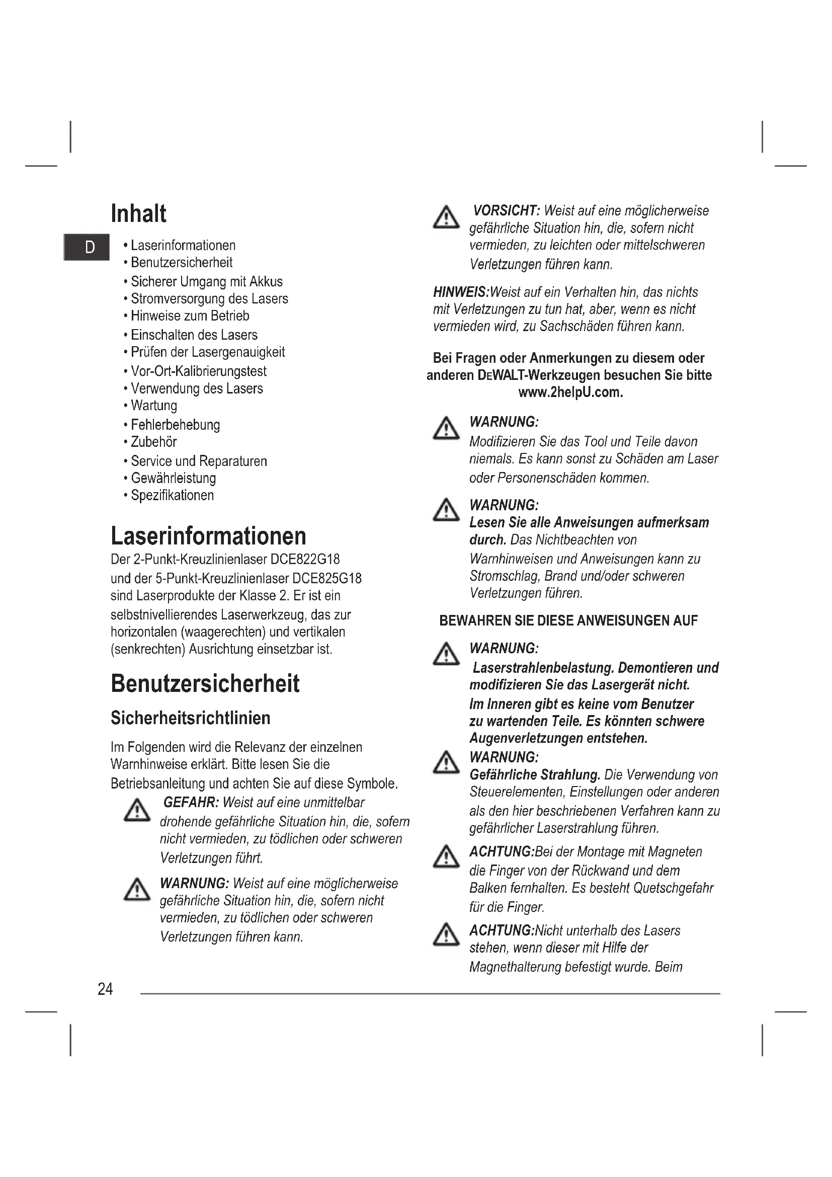 - Spezikationen Laserinformationen Der 2-Punkt-Kreuzlinienlaser DCE822G18 und der 5-Punkt-Kreuzlinienlaser DCE825G18 sind Laserprodukte der Klasse 2. Er ist ein selbstnivellierendes Laserwerkzeug, das zur horizontalen (waagerechten) und vertikalen (senkrechten) Ausrichtung einsetzbar ist. Benutzersicherheit Sicherheitsrichtlinien Im Folgenden wird die Relevanz der einzelnen Warnhinweise erklärt. Bitte lesen Sie die Betriebsanleitung und achten Sie auf diese Symbole. GEFAHR: Weist auf eine unmittelbar drohende gefährliche Situation hin, die, sofern nicht vermieden, zu tödlichen oder schweren Verletzungen führt. WARNUNG: Weist auf eine möglicherweise gefährliche Situation hin, die, sofern nicht vermieden, zu tödlichen oder schweren Verletzungen führen kann. VORSICHT: Weist auf eine möglicherweise gefährliche Situation hin, die, sofern nicht vermieden, zu leichten oder mittelschweren Verletzungen führen kann. HINWEIS: Weist auf ein Verhalten hin, das nichts mit Verletzungen zu tun hat, aber, wenn es nicht vermieden wird, zu Sachschäden führen kann. Bei Fragen oder Anmerkungen zu diesem oder anderen DEWALT-Werkzeugen besuchen Sie bitte www.2helpU.com. WARNUNG: Modizieren Sie das Tool und Teile davon niemals. Es kann sonst zu Schäden am Laser oder Personenschäden kommen. WARNUNG: Lesen Sie alle Anweisungen aufmerksam durch. Das Nichtbeachten von Warnhinweisen und Anweisungen kann zu Stromschlag, Brand und/oder schweren Verletzungen führen.