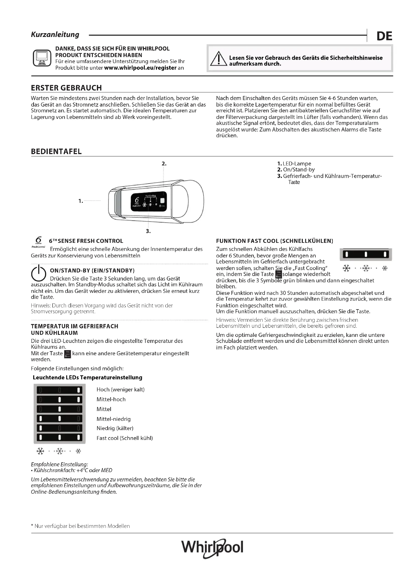 Für eine umfassendere Unterstützung melden Sie Ihr Produkt bitte unter www.whirlpool.eu/register an Lesen Sie vor Gebrauch des Geräts die Sicherheitshinweise aufmerksam durch. ERSTER GEBRAUCH Warten Sie mindestens zwei Stunden nach der Installation, bevor Sie das Gerät an das Stromnetz anschließen. Schließen Sie das Gerät an das Stromnetz an. Es startet automatisch. Die idealen Temperaturen zur Lagerung von Lebensmitteln sind ab Werk voreingestellt. Nach dem Einschalten des Geräts müssen Sie 4-6Stunden warten, bis die korrekte Lagertemperatur für ein normal befülltes Gerät erreicht ist. Platzieren Sie den antibakteriellen Geruchsfilter wie auf der Filterverpackung dargestellt im Lüfter (falls vorhanden). Wenn das akustische Signal ertönt, bedeutet dies, dass der Temperaturalarm ausgelöst wurde: Zum Abschalten des akustischen Alarms die Taste drücken. BEDIENTAFEL