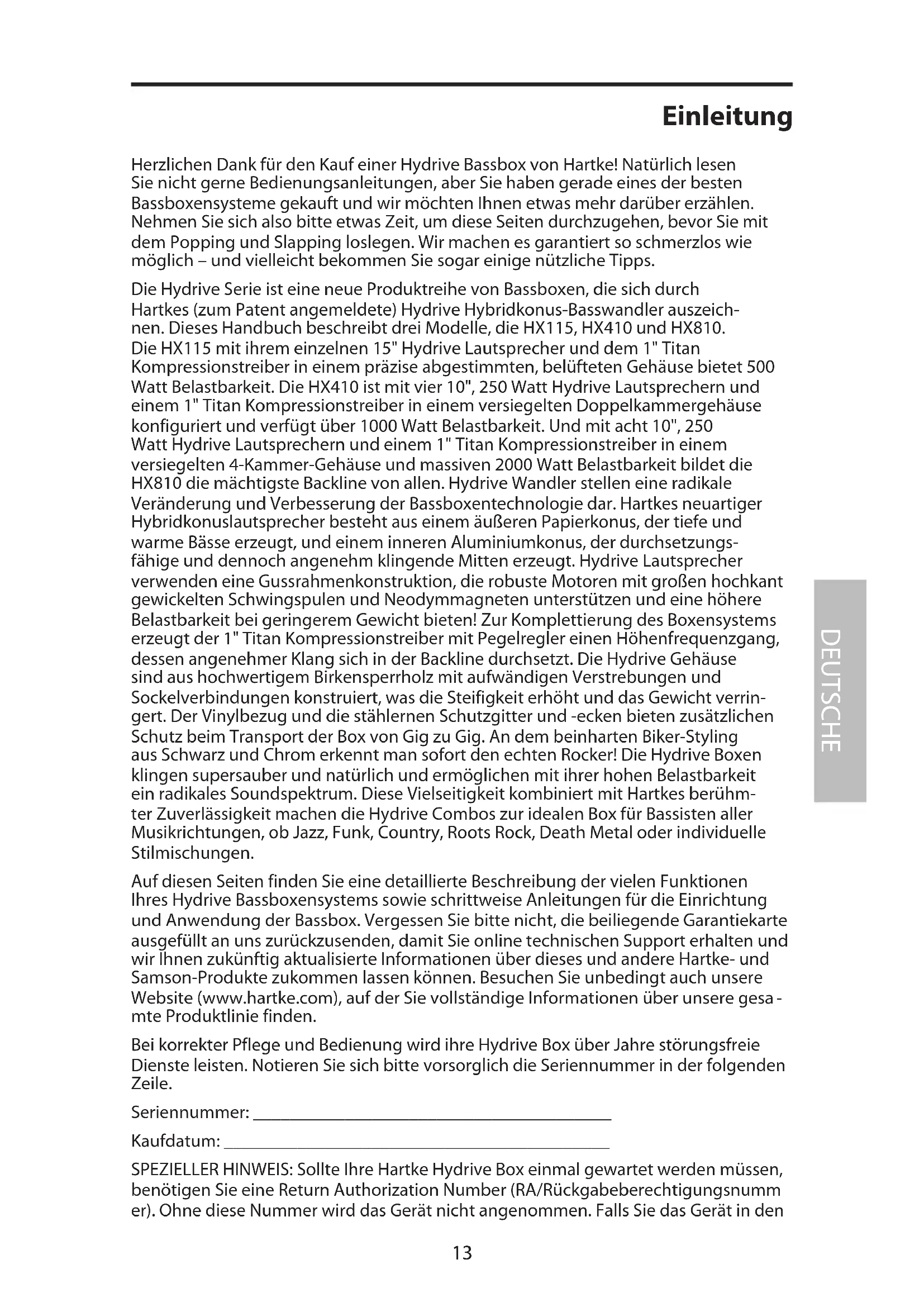 Auf diesen Seiten finden Sie eine detaillierte Beschreibung der vielen Funktionen Ihres Hydrive Bassboxensystems sowie schrittweise Anleitungen für die Einrichtung und Anwendung der Bassbox. Vergessen Sie bitte nicht, die beiliegende Garantiekarte ausgefüllt an uns zurückzusenden, damit Sie online technischen Support erhalten und wir Ihnen zukünftig aktualisierte Informationen über dieses und andere Hartke- und Samson-Produkte zukommen lassen können. Besuchen Sie unbedingt auch unsere Website (www.hartke.com), auf der Sie vollständige Informationen über unsere gesamte Produktlinie finden.