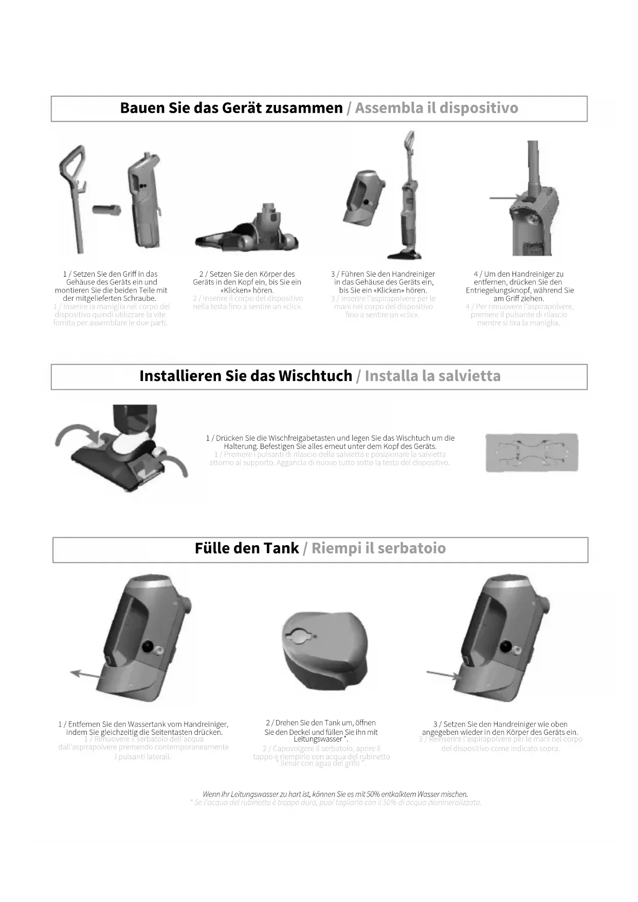 - Se l’acqua del rubinetto è troppo dura, puoi tagliarla con il 50% di acqua demineralizzata. 3 / Führen Sie den Handreiniger in das Gehäuse des Geräts ein, bis Sie ein «Klicken» hören. 3 / Inserire l’aspirapolvere per le mani nel corpo del dispositivo no a sentire un «clic». 4 / Um den Handreiniger zu entfernen, drücken Sie den Entriegelungsknopf, während Sie am Gri ziehen. 4 / Per rimuovere l’aspirapolvere, premere il pulsante di rilascio mentre si tira la maniglia.Start / Avvio Verwenden Sie das Gerät nicht mit feuchten oder nassen Filtern oder ohne Filter. Der Kopf und das Wischtuch können bei Verwendung des Dampfreinigers heiß werden. Berühren Sie sie nicht, während Sie das Gerät verwenden. Geben Sie niemals Entkalkungsprodukte, Alkohol oder Reinigungsmittel in den Dampfreiniger, da dies ihn beschädigen oder seine Verwendung gefährden könnte. Versuchen Sie nicht, das Gerät auf hartem Boden ohne Wasser im Tank zu verwenden. Sie hören dann ein Klicken, das Ihnen sagt, dass kein Wasser mehr vorhanden ist. Non utilizzare il dispositivo con ltri umidi o bagnati o senza i ltri in posizione. Il vassoio e la salvietta possono surriscaldarsi quando si utilizza il pulitore a vapore. Non toccarli durante l’utilizzo del dispositivo. Non mettere mai prodotti disincrostanti, alcool o detergenti nel pulitore a vapore, poiché potrebbero danneggiarlo o renderne pericoloso l’uso. Non tentare di utilizzare il dispositivo su un terreno duro senza acqua nel serbatoio. Sentirai quindi un clic che ti dirà che non c’è più acqua. 1 / Schließen Sie das Gerät an und drücken Sie die EIN / AUS-Taste am Handreiniger, um es einzuschalten. Die grüne LED blinkt, bis das Gerät bereit ist. 1 / Collegare il dispositivo e premere il pulsante ON / OFF sull’aspirapolvere per accenderlo. Il LED verde lampeggerà no a quando il dispositivo non sarà pronto. 3 / Drücken Sie die Dampaste um mit der Reinigung zu beginnen. 3 / Premere il pulsante del vapore per iniziare la pulizia. 2 / Sobald die grüne LED leuchtet, drücken Sie die mittlere Taste auf dem Steuerbildschirm, um die gewünschte Dampntensität auszuwählen. 2 / Una volta che il LED verde è sso, premere il pulsante centrale sullo schermo di controllo per scegliere l’intensità del vapore che si desidera. Handreiniger / Detergente per le mani 1 / Drücken Sie die EIN / AUS-Taste des Geräts nach vorne, um es einzuschalten. Ziehen Sie es erneut zurück, um es auszuschalten. 1 / Spingere in avanti il pulsante ON / OFF del dispositivo per accenderlo. Tirare indietro di nuovo per spegnerlo. 2 / Drücken Sie den Dampfauslöser, um den Dampf zu betreiben. Drücken Sie die mittlere Taste auf dem Steuerbildschirm, um die gewünschte Dampfintensität auszuwählen. 2 / Premere il pulsante del vapore per azionare il vapore. Premere il pulsante centrale sullo schermo di controllo per selezionare l’intensità del vapore desiderata.