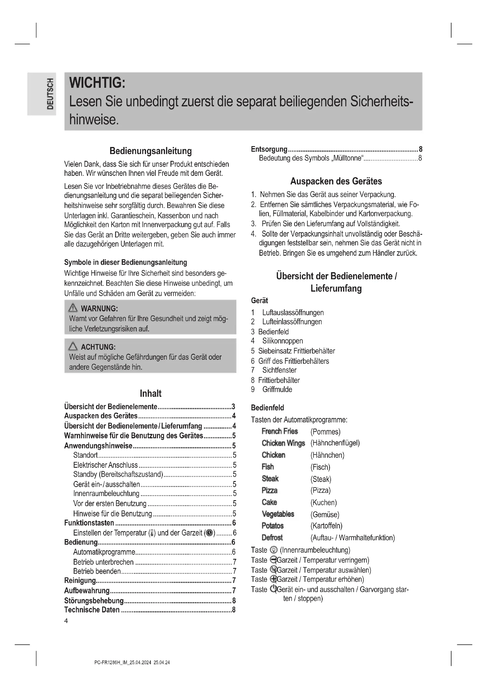 digungen feststellbar sein, nehmen Sie das Gerät nicht in Betrieb. Bringen Sie es umgehend zum Händler zurück. Übersicht der Bedienelemente / Lieferumfang Gerät 1 Luftauslassöffnungen 2 Lufteinlassöffnungen 3 Bedienfeld 4 Silikonnoppen 5 Siebeinsatz Frittierbehälter 6 Griff des Frittierbehälters 7 Sichtfenster 8 Frittierbehälter 9 Griffmulde Bedienfeld Tasten der Automatikprogramme: (Pommes) (Hähnchenflügel) (Hähnchen) (Fisch) (Steak) (Pizza) (Kuchen) (Gemüse) (Kartoffeln) (Auftau- / Warmhaltefunktion) Taste (Innenraumbeleuchtung) Taste (Garzeit / Temperatur verringern) Taste (Garzeit / Temperatur auswählen) Taste (Garzeit / Temperatur erhöhen) Taste (Gerät ein- und ausschalten / Garvorgang star- ten / stoppen)5 PC-FR1286H_IM_25.04.2024 25.04.24 Warnhinweise für die Benutzung des Gerätes WARNUNG: Verbrennungsgefahr!