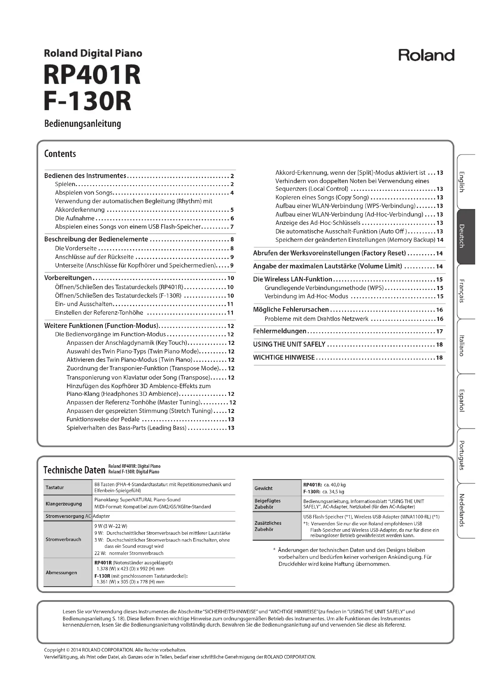 - It is forbidden by law to make an audio recording, video recording, copy or revision of a third party's copyrighted work (musical work, video work, broadcast, live performance, or other work), whether in whole or in part, and distribute, sell, lease, perform, or broadcast it without the permission of the copyright owner.• Do not use this product for purposes that could infringe on a copyright held by a third party. We assume no responsibility whatsoever with regard to any infringements of third-party copyrights arising through your use of this product.• The copyright of content in this product (the sound waveform data, style data, accompaniment patterns, phrase data, audio loops and image data) is reserved by Roland Corporation.• Purchasers of this product are permitted to utilize said content (except song data such as Demo Songs) for the creating, performing, recording and distributing original musical works.• Purchasers of this product are NOT permitted to extract said content in original or modied form, for the purpose of distributing recorded medium of said content or making them available on a computer network.• XGlite () is a registered trademark or a trademark of Yamaha Corporation.• Roland, SuperNATURAL and GS are either registered trademarks or trademarks of Roland Corporation in the United States and/or other countries.• Apple, iPad are either registered trademarks or trademarks of Apple Inc. WARNING WARNING CAUTION CAUTION 18Bedienen des Instrumentes . . . . . . . . . . . . . . . . . . . . . . . . . . . . . . . . . . . . 2 Spielen . . . . . . . . . . . . . . . . . . . . . . . . . . . . . . . . . . . . . . . . . . . . . . . . . . . . . . 2 Abspielen von Songs . . . . . . . . . . . . . . . . . . . . . . . . . . . . . . . . . . . . . . . . . 4 Verwendung der automatischen Begleitung (Rhythm) mit Akkorderkennung . . . . . . . . . . . . . . . . . . . . . . . . . . . . . . . . . . . . . . . . . . . 5 Die Aufnahme . . . . . . . . . . . . . . . . . . . . . . . . . . . . . . . . . . . . . . . . . . . . . . . 6 Abspielen eines Songs von einem USB Flash-Speicher . . . . . . . . . . 7 Beschreibung der Bedienelemente . . . . . . . . . . . . . . . . . . . . . . . . . . . . 8 Die Vorderseite . . . . . . . . . . . . . . . . . . . . . . . . . . . . . . . . . . . . . . . . . . . . . . 8 Anschlüsse auf der Rückseite . . . . . . . . . . . . . . . . . . . . . . . . . . . . . . . . . 9 Unterseite (Anschlüsse für Kopfhörer und Speichermedien). . . . . 9 Vorbereitungen . . . . . . . . . . . . . . . . . . . . . . . . . . . . . . . . . . . . . . . . . . . . . . . 10 Önen/Schließen des Tastaturdeckels (RP401R) . . . . . . . . . . . . . . . 10 Önen/Schließen des Tastaturdeckels (F-130R) . . . . . . . . . . . . . . . 10 Ein- und Ausschalten . . . . . . . . . . . . . . . . . . . . . . . . . . . . . . . . . . . . . . . . 11 Einstellen der Referenz-Tonhöhe . . . . . . . . . . . . . . . . . . . . . . . . . . . . 11 Weitere Funktionen (Function-Modus) . . . . . . . . . . . . . . . . . . . . . . . . 12 Die Bedienvorgänge im Function-Modus . . . . . . . . . . . . . . . . . . . . . 12 Anpassen der Anschlagdynamik (Key Touch) . . . . . . . . . . . . . . 12 Auswahl des Twin Piano-Typs (Twin Piano Mode) . . . . . . . . . . 12 Aktivieren des Twin Piano-Modus (Twin Piano) . . . . . . . . . . . . 12 Zuordnung der Transponier-Funktion (Transpose Mode) . . . 12 Transponierung von Klaviatur oder Song (Transpose) . . . . . . 12 Hinzufügen des Kopfhörer 3D Ambience-Eekts zum Piano-Klang (Headphones 3D Ambience) . . . . . . . . . . . . . . . . . 12 Anpassen der Referenz-Tonhöhe (Master Tuning). . . . . . . . . . 12 Anpassen der gespreizten Stimmung (Stretch Tuning) . . . . . 12 Funktionsweise der Pedale . . . . . . . . . . . . . . . . . . . . . . . . . . . . . . 13 Spielverhalten des Bass-Parts (Leading Bass) . . . . . . . . . . . . . . 13 Akkord-Erkennung, wenn der [Split]-Modus aktiviert ist . . . 13 Verhindern von doppelten Noten bei Verwendung eines Sequenzers (Local Control) . . . . . . . . . . . . . . . . . . . . . . . . . . . . . . 13 Kopieren eines Songs (Copy Song) . . . . . . . . . . . . . . . . . . . . . . . 13 Aufbau einer WLAN-Verbindung (WPS-Verbindung) . . . . . . . 13 Aufbau einer WLAN-Verbindung (Ad-Hoc-Verbindung) . . . . 13 Anzeige des Ad-Hoc-Schlüssels . . . . . . . . . . . . . . . . . . . . . . . . . . 13 Die automatische Ausschalt-Funktion (Auto O ) . . . . . . . . . . 13 Speichern der geänderten Einstellungen (Memory Backup) 14 Abrufen der Werksvoreinstellungen (Factory Reset) . . . . . . . . . . 14 Angabe der maximalen Lautstärke (Volume Limit) . . . . . . . . . . . 14 Die Wireless LAN-Funktion . . . . . . . . . . . . . . . . . . . . . . . . . . . . . . . . . . . . 15 Grundlegende Verbindungsmethode (WPS) . . . . . . . . . . . . . . . . . . 15 Verbindung im Ad-Hoc-Modus . . . . . . . . . . . . . . . . . . . . . . . . . . . . . . 15 Mögliche Fehlerursachen . . . . . . . . . . . . . . . . . . . . . . . . . . . . . . . . . . . . . 16 Probleme mit dem Drahtlos-Netzwerk . . . . . . . . . . . . . . . . . . . . . . . 16 Fehlermeldungen . . . . . . . . . . . . . . . . . . . . . . . . . . . . . . . . . . . . . . . . . . . . . 17