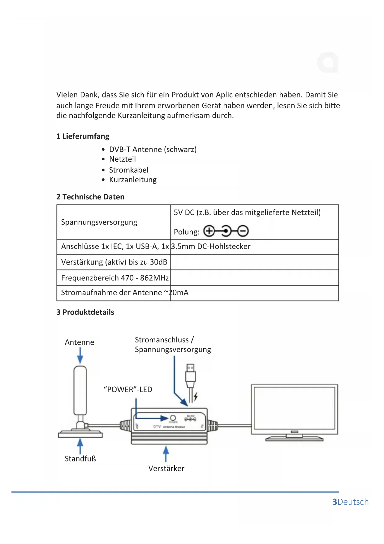 Vielen Dank, dass Sie sich für ein Produkt von Aplic entschieden haben. Damit Sie auch lange Freude mit Ihrem erworbenen Gerät haben werden, lesen Sie sich bitte die nachfolgende Kurzanleitung aufmerksam durch.