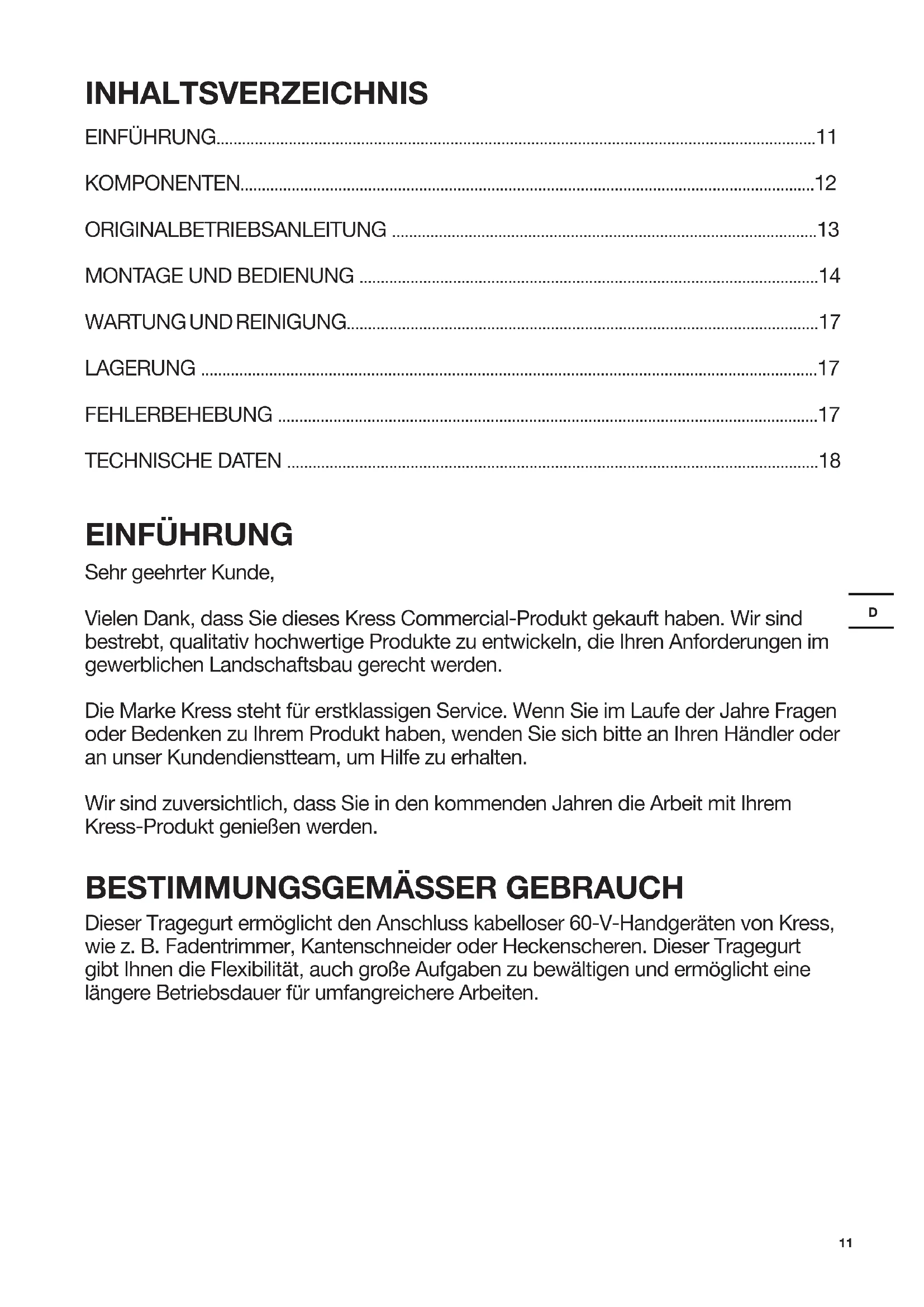 - TECHNISCHE DATEN EINFÜHRUNG Sehr geehrter Kunde, Vielen Dank, dass Sie dieses Kress Commercial-Produkt gekauft haben. Wir sind bestrebt, qualitativ hochwertige Produkte zu entwickeln, die Ihren Anforderungen im gewerblichen Landschaftsbau gerecht werden. Die Marke Kress steht für erstklassigen Service. Wenn Sie im Laufe der Jahre Fragen oder Bedenken zu Ihrem Produkt haben, wenden Sie sich bitte an Ihren Händler oder an unser Kundendienstteam, um Hilfe zu erhalten. Wir sind zuversichtlich, dass Sie in den kommenden Jahren die Arbeit mit Ihrem Kress-Produkt genießen werden. p. 18