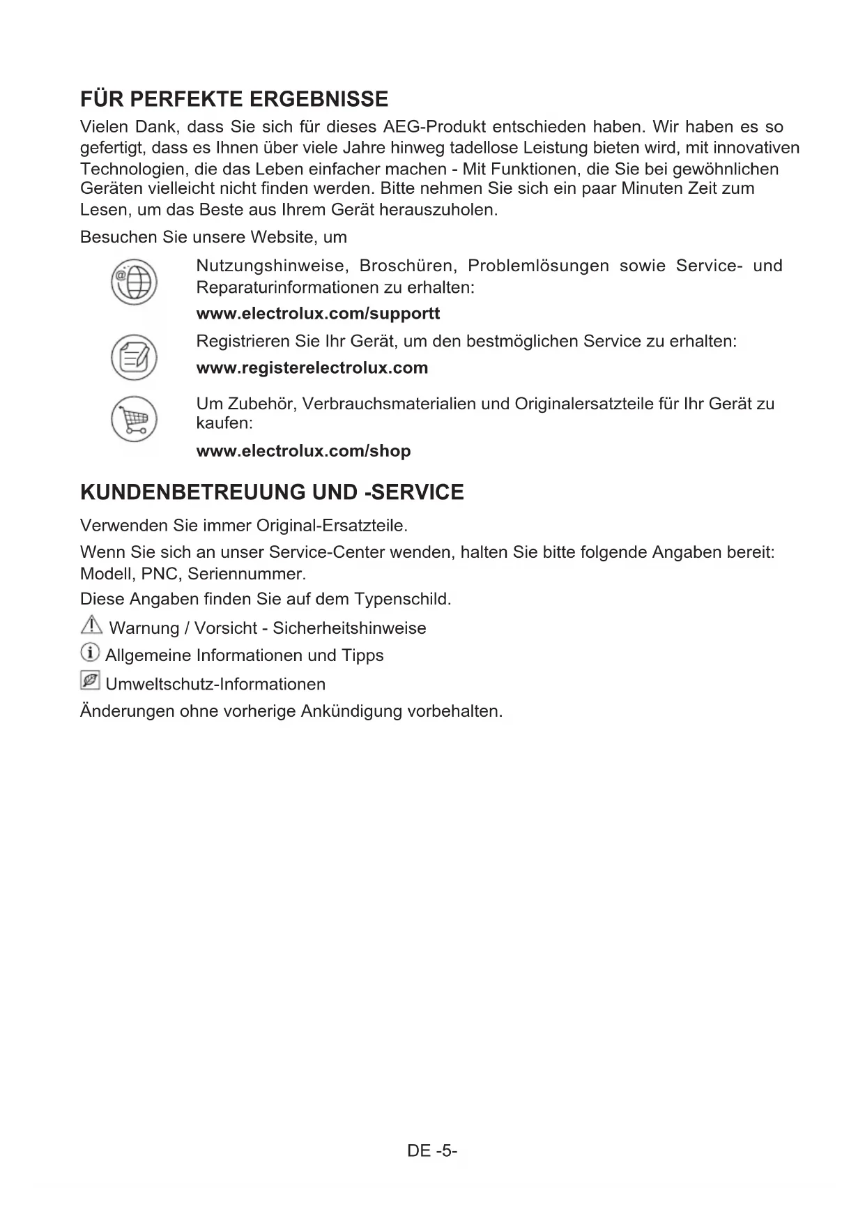Vielen Dank, dass Sie sich für dieses AEG-Produkt entschieden haben. Wir haben es so gefertigt, dass es Ihnen über viele Jahre hinweg tadellose Leistung bieten wird, mit innovativen Technologien, die das Leben einfacher machen - Mit Funktionen, die Sie bei gewöhnlichen Geräten vielleicht nicht finden werden. Bitte nehmen Sie sich ein paar Minuten Zeit zum Lesen, um das Beste aus Ihrem Gerät herauszuholen. Besuchen Sie unsere Website, um Nutzungshinweise, Broschüren, Problemlösungen sowie Service- und Reparaturinformationen zu erhalten: www.electrolux.com/supportt Registrieren Sie Ihr Gerät, um den bestmöglichen Service zu erhalten: www.registerelectrolux.com Um Zubehör, Verbrauchsmaterialien und Originalersatzteile für Ihr Gerät zu kaufen: www.electrolux.com/shop