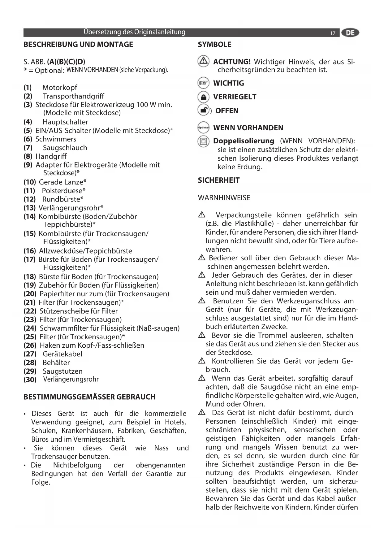 - = Optional: WENN VORHANDEN (siehe Verpackung). (1) Motorkopf (2) Transporthandgri (3) Steckdose für Elektrowerkzeug 100 W min. (Modelle mit Steckdose) (4) Hauptschalter (5) EIN/AUS-Schalter (Modelle mit Steckdose)* (6) Schwimmers (7) Saugschlauch (8) Handgri (9) Adapter für Elektrogeräte (Modelle mit Steckdose)* (10) Gerade Lanze* (11) Polsterduese* (12) Rundbürste* (13) Verlängerungsrohr* (14) Kombibürste (Boden/Zubehör Teppichbürste)* (15) Kombibürste (für Trockensaugen/ Flüssigkeiten)* (16) Allzweckdüse/Teppichbürste (17) Bürste für Boden (für Trockensaugen/ Flüssigkeiten)* (18) Bürste für Boden (für Trockensaugen) (19) Zubehör für Boden (für Flüssigkeiten) (20) Papierlter nur zum (für Trockensaugen) (21) Filter (für Trockensaugen)* (22) Stützenscheibe für Filter (23) Filter (für Trockensaugen) (24) Schwammlter für Flüssigkeit (Naß-saugen) (25) Filter (für Trockensaugen)* (26) Haken zum Kopf-/Fass-schließen (27) Gerätekabel (28) Behälter (29) Saugstutzen (30) Verlängerungsrohr