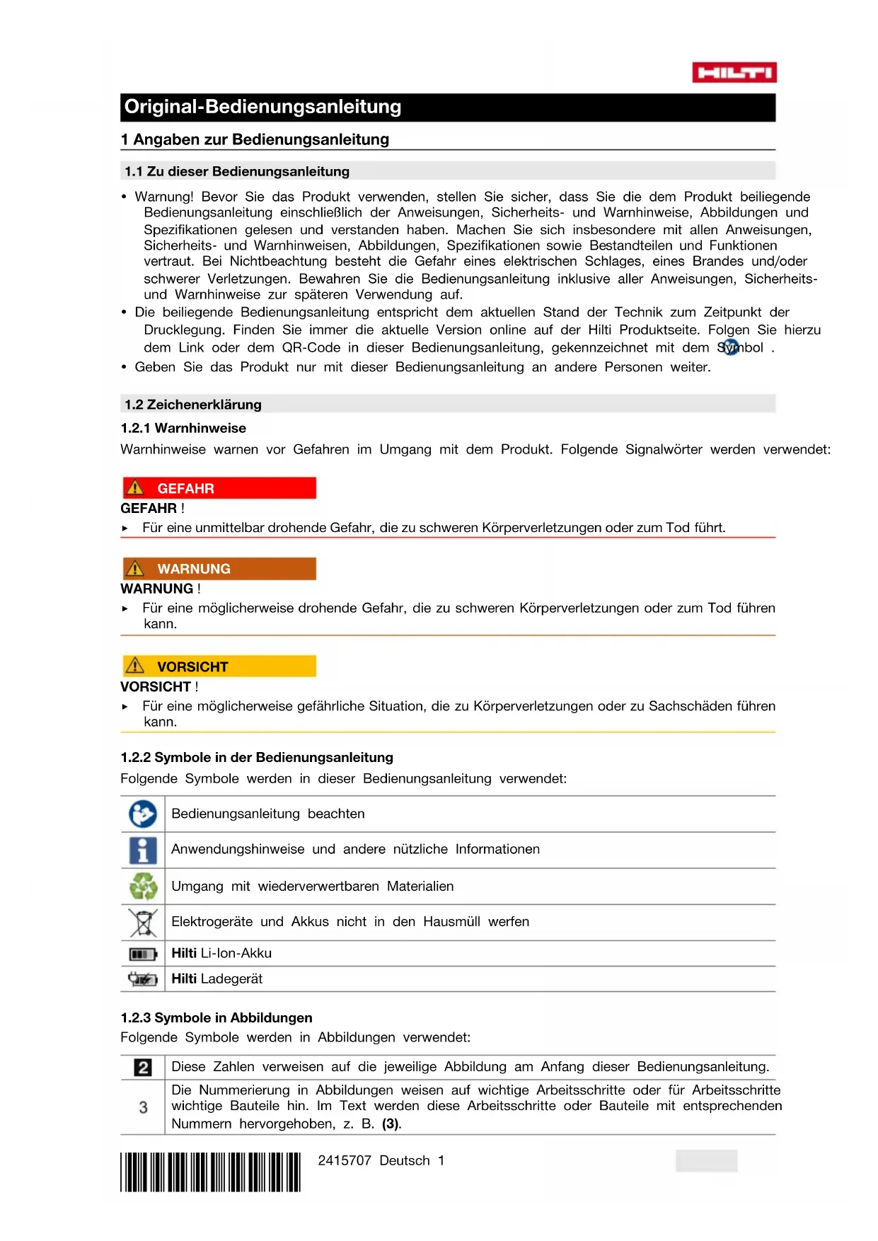 Akku defekt. ▶ Wenden Sie sich an den Hilti Service. Akku wird schneller leer als üblich. Sehr niedrige Umgebungstempera- tur. ▶ Lassen Sie den Akku sich langsam auf Raumtemperatur erwärmen.*2415707* 2415707 English 9 Störung Mögliche Ursache Lösung Akku rastet nicht mit hörba- rem Klick ein. Rastnase am Akku ist verschmutzt. ▶ Reinigen Sie die Rastnase und setzen Sie den Akku erneut ein. Starke Hitzeentwicklung im Produkt oder Akku. Elektrischer Defekt ▶ Schalten Sie das Produkt sofort aus, entnehmen Sie den Akku, beobachten Sie ihn, lassen Sie ihn abkühlen und kontaktieren Sie den Hilti Service. 10 Entsorgung WARNUNG Verletzungsgefahr durch unsachgemäße Entsorgung! Gesundheitsgefährdungen durch austretende Gase oder Flüssigkeiten. ▶ Versenden oder verschicken Sie keine beschädigten Akkus! ▶ Decken Sie die Anschlüsse mit einem nicht leitfähigen Material ab, um Kurzschlüsse zu vermeiden. ▶ Entsorgen Sie Akkus so, dass sie nicht in die Hände von Kindern gelangen können. ▶ Entsorgen Sie den Akku in Ihrem Hilti Store oder wenden Sie sich an ihr zuständiges Entsorgungsunter- nehmen. Hilti Produkte sind zu einem hohen Anteil aus wiederverwertbaren Materialien hergestellt. Voraussetzung für eine Wiederverwertung ist eine sachgemäße Stofftrennung. In vielen Ländern nimmt Hilti Ihr Altgerät zur Verwertung zurück. Fragen Sie den Hilti Kundenservice oder Ihren Verkaufsberater. ▶ Werfen Sie Elektrowerkzeuge, Elektronische Geräte und Akkus nicht in den Hausmüll! 11 Herstellergewährleistung ▶ Bitte wenden Sie sich bei Fragen zu den Gewährleistungsbedingungen an Ihren lokalen Hilti Partner. 12 Weitere Informationen Weiterführende Informationen zu Bedienung, Technik, Umwelt und Recycling finden Sie unter folgendem Link: qr.hilti.com/manual/?id=2415707 Diesen Link finden Sie auch am Ende der Bedienungsanleitung als QR-Code. Original operating instructions 1 Information about the operating instructions