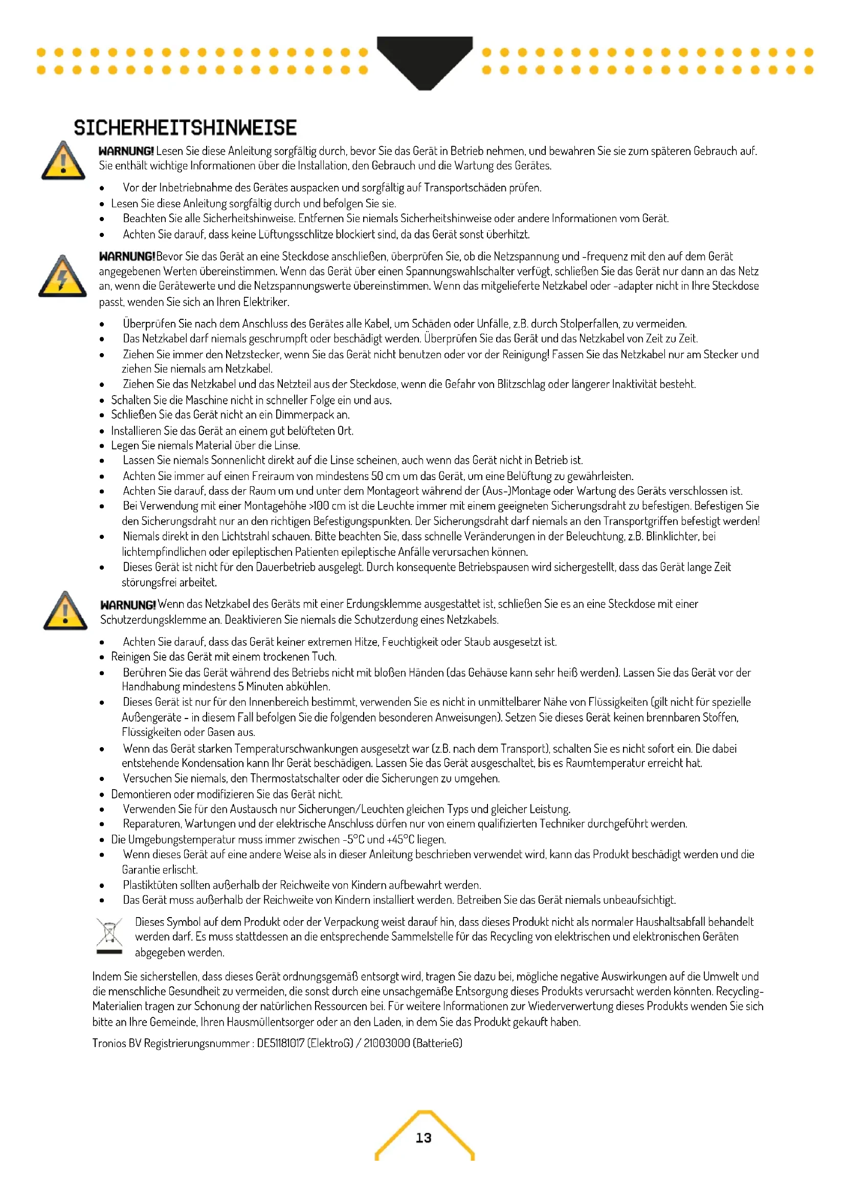 - Das Gerät muss außerhalb der Reichweite von Kindern installiert werden. Betreiben Sie das Gerät niemals unbeaufsichtigt. Dieses Symbol auf dem Produkt oder der Verpackung weist darauf hin, dass dieses Produkt nicht als normaler Haushaltsabfall behandelt werden darf. Es muss stattdessen an die entsprechende Sammelstelle für das Recycling von elektrischen und elektronischen Geräten abgegeben werden. Indem Sie sicherstellen, dass dieses Gerät ordnungsgemäß entsorgt wird, tragen Sie dazu bei, mögliche negative Auswirkungen auf die Umwelt und die menschliche Gesundheit zu vermeiden, die sonst durch eine unsachgemäße Entsorgung dieses Produkts verursacht werden könnten. Recycling- Materialien tragen zur Schonung der natürlichen Ressourcen bei. Für weitere Informationen zur Wiederverwertung dieses Produkts wenden Sie sich bitte an Ihre Gemeinde, Ihren Hausmüllentsorger oder an den Laden, in dem Sie das Produkt gekauft haben. Tronios BV Registrierungsnummer : DE51181017 (ElektroG) / 21003000 (BatterieG)Packen Sie den Karton sofort nach Erhalt sorgfältig aus, überprüfen Sie seinen Inhalt, um sicherzustellen, dass alle Teile vorhanden sind und in gutem Zustand erhalten wurden. Bei Transportschäden oder fehlenden Teilen ist der Verkäufer unverzüglich zu informieren. Lagern Sie die Verpackung und das Verpackungsmaterial. Wenn das Produkt zurückgegeben werden muss, ist es wichtig, dass das Produkt in der Originalverpackung zurückgegeben wird. Wenn das Gerät drastischen Temperaturunterschieden ausgesetzt war (z.B. nach dem Transport), schalten Sie es nicht sofort ein. Die dabei entstehende Kondensation kann das Gerät beschädigen. Vergewissern Sie sich, dass das Gerät Raumtemperatur hat, und stecken Sie dann den Netzstecker in die Steckdose. Auf der Rückseite von das Gerät wird angezeigt, an welche Netzspannung es angeschlossen werden muss. Prüfen Sie, ob die Netzspannung mit dieser übereinstimmt. Wenn die Netzspannung von der angegebenen abweicht, kann das Gerät irreparabel beschädigt werden. Das Gerät muss auch direkt an die Netzspannung angeschlossen werden. Es darf kein Dimmer oder eine einstellbare Stromversorgung verwendet werden. Schließen Sie das Gerät immer an einen geschützten Stromkreis an (Fehlerstromschutzschalter oder Sicherung). Vergewissern Sie sich, dass das Gerät ausreichend elektrisch geerdet ist, um die Gefahr eines Stromschlags oder Brandes zu vermeiden. Das Gerät kann auf einer stabilen und ebenen Fläche aufgestellt werden. Durch die Befestigungsmöglichkeiten der Grundplatte kann das Gerät auch kopfüber an einer Traverse montiert werden, siehe untenstehende Abbildung. Für die Befestigung sind zertifizierte Klemmen mit korrekter Tragfähigkeit erforderlich. Gemäß der Abbildung werden die Schnellverschlussriegel der Omega-Halterungen in die vorgesehenen Öffnungen der Grundplatte eingesetzt und im Uhrzeigersinn gedreht, bis sie einrasten (bis zum Anschlag). Der Montageort muss ausreichend stabil sein und ein Gewicht von dem 10- fachen des Gerätegewichts tragen können. Befestigen Sie das Gerät mit einem Sicherheitskabel so, dass es nicht herunterfallen kann. Befolgen Sie bei der Durchführung einer Installation immer die europäischen und nationalen Richtlinien bezüglich Rigging, Traversen und allen anderen Sicherheitsaspekten. Lassen Sie die Installation immer von einem autorisierten Fachhändler prüfen!Wenn Sie einen Standard-DMX-Controller verwenden, können Sie den DMX-Ausgang des Controller direkt mit dem DMX-Eingang des ersten Geräts verbinden. Verbinden Sie den DMX-Ausgang immer mit dem nächsten DMX-Eingang des nächsten Geräts, bis alle Geräte angeschlossen sind.