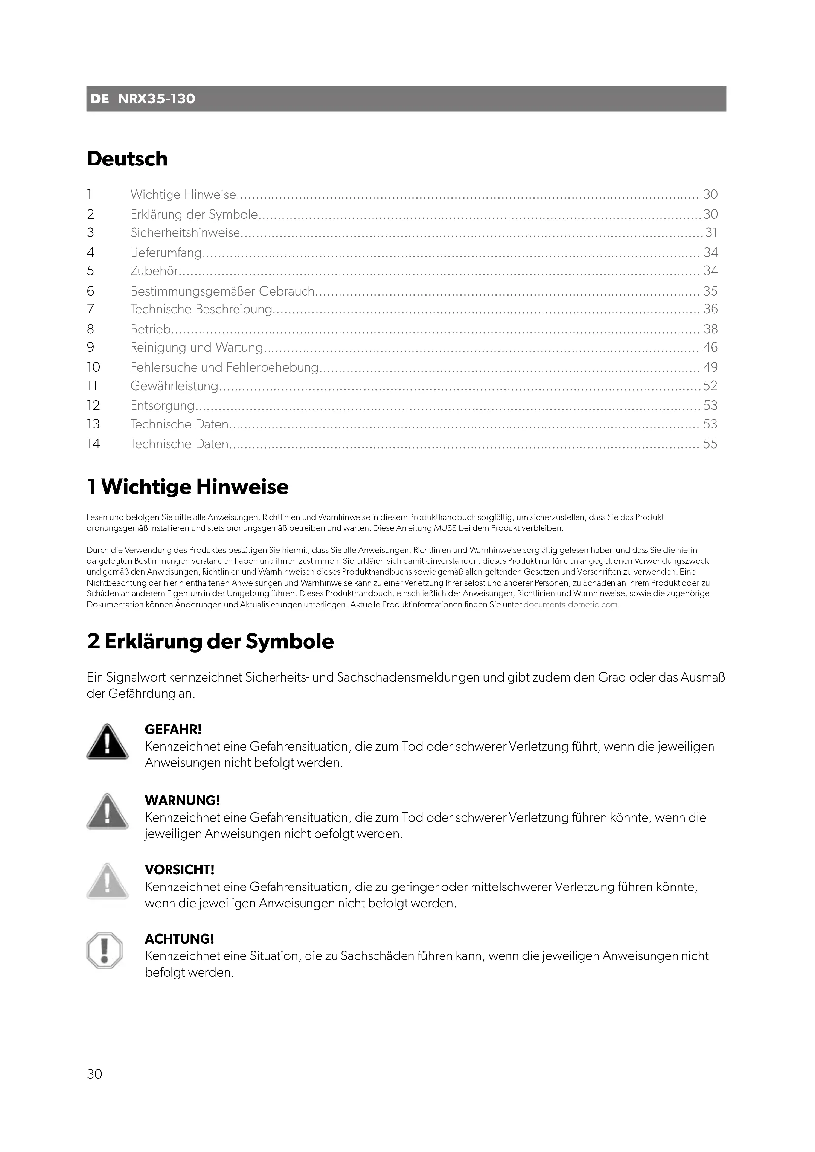 - A reason for the claim or description of the fault Note that self-repair or nonprofessional repair can have safety consequences and might void the warranty. 12 Disposal NOTICE! Damage hazard The insulation of the cooling device contains flammable cyclopentane and requires special disposal procedures. Deliver the cooling device at the end of its life-cycle to an appropriate recycling center. 25DENRX35-130 Deutsch 1 Wichtige Hinweise....................................................................................................................... 30 2 Erklärung der Symbole..................................................................................................................30 3 Sicherheitshinweise.......................................................................................................................31 4 Lieferumfang................................................................................................................................ 34 5 Zubehör...................................................................................................................................... 34 6 Bestimmungsgemäßer Gebrauch................................................................................................... 35 7 Technische Beschreibung.............................................................................................................. 36 8 Betrieb........................................................................................................................................ 38 9 Reinigung und Wartung................................................................................................................ 46 10 Fehlersuche und Fehlerbehebung.................................................................................................. 49 11 Gewährleistung............................................................................................................................52 12 Entsorgung..................................................................................................................................53 13 Technische Daten......................................................................................................................... 53 14 Technische Daten......................................................................................................................... 55 1 Wichtige Hinweise Lesen und befolgen Sie bitte alle Anweisungen, Richtlinien und Warnhinweise in diesem Produkthandbuch sorgfältig, um sicherzustellen, dass Sie das Produkt ordnungsgemäß installieren und stets ordnungsgemäß betreiben und warten. Diese Anleitung MUSS bei dem Produkt verbleiben. Durch die Verwendung des Produktes bestätigen Sie hiermit, dass Sie alle Anweisungen, Richtlinien und Warnhinweise sorgfältig gelesen haben und dass Sie die hierin dargelegten Bestimmungen verstanden haben und ihnen zustimmen. Sie erklären sich damit einverstanden, dieses Produkt nur für den angegebenen Verwendungszweck und gemäß den Anweisungen, Richtlinien und Warnhinweisen dieses Produkthandbuchs sowie gemäß allen geltenden Gesetzen und Vorschrien zu verwenden. Eine Nichtbeachtung der hierin enthaltenen Anweisungen und Warnhinweise kann zu einer Verletzung Ihrer selbst und anderer Personen, zu Schäden an Ihrem Produkt oder zu Schäden an anderem Eigentum in der Umgebung führen. Dieses Produkthandbuch, einschließlich der Anweisungen, Richtlinien und Warnhinweise, sowie die zugehörige Dokumentation können Änderungen und Aktualisierungen unterliegen. Aktuelle Produktinformationen finden Sie unter documents.dometic.com. 2 Erklärung der Symbole Ein Signalwort kennzeichnet Sicherheits- und Sachschadensmeldungen und gibt zudem den Grad oder das Ausmaß der Gefährdung an. GEFAHR! Kennzeichnet eine Gefahrensituation, die zum Tod oder schwerer Verletzung führt, wenn die jeweiligen Anweisungen nicht befolgt werden. WARNUNG! Kennzeichnet eine Gefahrensituation, die zum Tod oder schwerer Verletzung führen könnte, wenn die jeweiligen Anweisungen nicht befolgt werden. VORSICHT! Kennzeichnet eine Gefahrensituation, die zu geringer oder mittelschwerer Verletzung führen könnte, wenn die jeweiligen Anweisungen nicht befolgt werden. ACHTUNG! Kennzeichnet eine Situation, die zu Sachschäden führen kann, wenn die jeweiligen Anweisungen nicht befolgt werden.