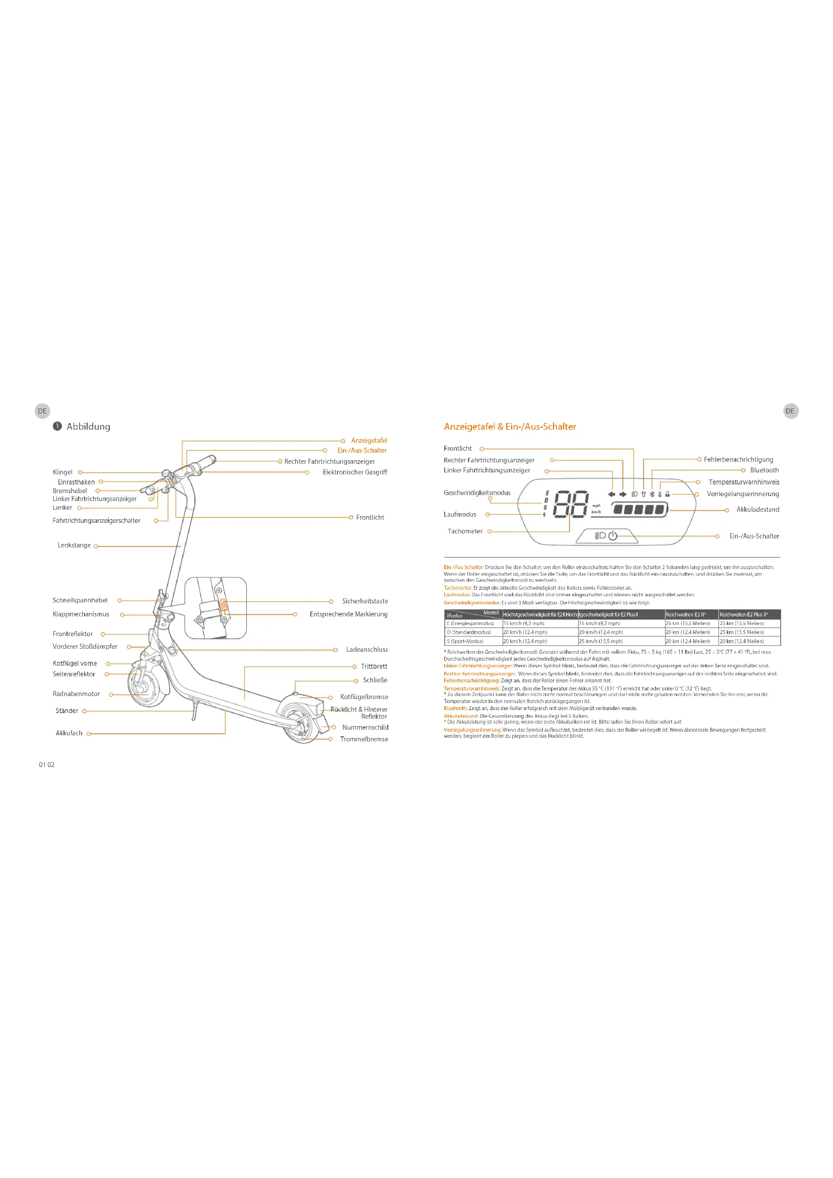 Anzeigetafel & Ein-/Aus-Schalter TachometerTemperaturwarnhinweisVerriegelungserinnerungBluetoothGeschwindigkeitsmodusLaufmodusFrontlichtFehlerbenachrichtigungAkkuladestandEin-/Aus-Schalter Modell Modus Höchstgeschwindigkeit für E2 II Höchstgeschwindigkeit für E2 Plus II 15 km/h (9,3 mph) 20 km/h (12,4 mph) 20 km/h (12,4 mph) 15 km/h (9,3 mph) 20 km/h (12,4 mph) 25 km/h (15,5 mph) Reichweiten E2 Plus II* 25 km (15,5 Meilen) 25 km (15,5 Meilen) 20 km (12,4 Meilen) Reichweiten E2 II* 25 km (15,5 Meilen) 20 km (12,4 Meilen) 20 km (12,4 Meilen) D (Standardmodus) E (Energiesparmodus) S (Sport-Modus) KlingelLenkerElektronischer GasgriFahrtrichtungsanzeigerschalterLinker FahrtrichtungsanzeigerRechter FahrtrichtungsanzeigerEinrasthakenAnzeigetafelBremshebelFrontlichtLenkstangeSicherheitstasteEntsprechende MarkierungKlappmechanismusSchnellspannhebelKotügel vorneVorderer StoßdämpferRadnabenmotorLadeanschlussTrittbrettSchließeKotügelbremseTrommelbremseSeitenreektorFrontreektorStänderAkkufachEin-/Aus-Schalter Dieses Produkt ist vom TÜV Rheinland nach ANSI/CAN/UL-2272 zertiziert.Der Akku entspricht den UN/DOT 38.3-Vorschriften.Der Akku entspricht den ANSI/CAN/UL-2271-Vorschriften.Konformitätserklärung der Europäischen UnionWichtige WEEE-Informationen Dieses Symbol auf dem Produkt oder seiner Verpackung weist darauf hin, dass gebrauchte elektrische und elektronische Produkte nicht mit unsortiertem Hausmüll vermischt werden dürfen. Um eine ordnungsgemäße Verarbeitung zu gewährleisten, sind Sie dafür verantwortlich, Ihre Altgeräte bei den dafür vorgesehenen Sammelstellen abzugeben. Die ordnungsgemäße Entsorgung dieses Produkts trägt dazu bei, wertvolle Ressourcen zu sparen und mögliche negative Auswirkungen auf die menschliche Gesundheit und die Umwelt zu vermeiden, die sonst durch unsachgemäße Abfallentsorgung entstehen könnten. Bei unsachgemäßer Entsorgung dieser Abfälle können gemäß den nationalen Rechtsvorschriften Strafen verhängt werden. Wenden Sie sich bitte an Ihre örtliche Behörde, um weitere Informationen zur nächstgelegenen ausgewiesenen Sammelstelle zu erhalten.Informationen zum Batterierecycling für Benutzer Dieses Symbol bedeutet, dass Batterien und Akkumulatoren am Ende ihrer Lebensdauer nicht mit unsortiertem Hausmüll vermischt werden dürfen. Ihre Teilnahme ist ein wichtiger Teil der Bemühungen, die Auswirkungen von Batterien und Akkumulatoren auf die Umwelt und die menschliche Gesundheit zu minimieren. Für ein ordnungsgemäßes Recycling können Sie dieses Produkt oder die darin enthaltenen Batterien oder Akkus an Ihren Lieferanten oder an eine dafür vorgesehene Sammelstelle zurückgeben. Die ordnungsgemäße Entsorgung dieses Produkts trägt dazu bei, wertvolle Ressourcen zu sparen und mögliche negative Auswirkungen auf die menschliche Gesundheit und die Umwelt zu vermeiden, die sonst durch unsachgemäße Abfallentsorgung entstehen könnten. Bei unsachgemäßer Entsorgung dieser Abfälle können gemäß den nationalen Rechtsvorschriften Strafen verhängt werden.Es gibt getrennte Sammelsysteme für Altbatterien und -akkumulatoren.Bitte entsorgen Sie Batterien und Akkus ordnungsgemäß bei Ihrer örtlichen kommunalen Sammel-/Recyclingstelle.FunkanlagenrichtlinieHiermit erklärt Ninebot (Changzhou) Tech Co., Ltd., dass das in diesem Abschnitt aufgeführte Produkt den grundlegenden Anforderungen und anderen relevanten Bestimmungen der Funkanlagenrichtlinie 2014/53/EU entspricht.Richtlinie zur Einschränkung der Verwendung bestimmter gefährlicher Stoe (RoHS) Ninebot (Changzhou) Tech Co., Ltd. erklärt hiermit, dass das gesamte Produkt einschließlich der Teile (Kabel, Leitungen usw.) die Anforderungen der RoHS-Richtlinie 2011/65/EU und der Änderung der Delegierten Richtlinie (EU) 2015/863 der Kommission zur Einschränkung der Verwendung bestimmter gefährlicher Stoe in Elektro- und Elektronikgeräten („RoHS-Neufassung“ oder „RoHS 2.0“) erfüllt. Zertizierungen MaschinenrichtlinieHiermit erklärt Ninebot (Changzhou) Tech Co., Ltd., dass das in diesem Abschnitt aufgeführte Produkt den grundlegenden Anforderungen und anderen relevanten Bestimmungen der Maschinenrichtlinie 2006/42/EG entspricht.Bevollmächtigter Vertreter (EU):Segway-Ninebot EuropaDynamostraat 7, 1014 BN Amsterdam, Niederlande. Ninebot (Changzhou) Tech Co., Ltd. erklärt hiermit, dass das Produktmodell: 051401DD, 051402EE den grundlegenden Anforderungen und anderen relevanten Bestimmungen der Funkanlagenrichtlinie 2014/53/EU, der Maschinenrichtlinie 2006/42/EG und der RoHS-Richtlinie 2011/65/EU und der Änderung der Delegierten Richtlinie (EU) 2015/863 entspricht.Die Konformitätserklärung kann unter folgender Adresse eingesehen werden:https://eu-en.segway.com/instruction-manuals Technische Daten Schaltplan ControllerMotorAnzeigetafelElektronischerGasgriBremseFrontlicht MCU SummerSchlüsselDisplay