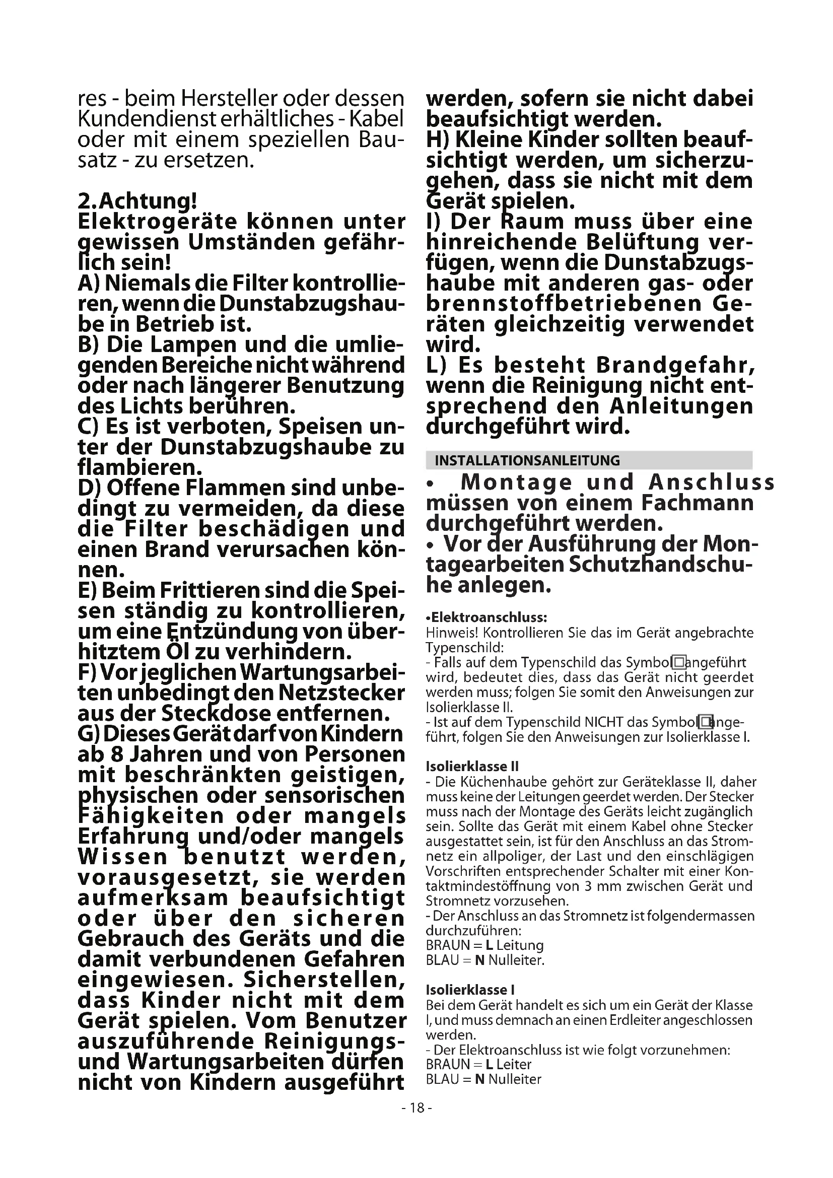 Elektrogeräte können unter gewissen Umständen gefähr- lich sein! A) Niemals die Filter kontrollie- ren, wenn die Dunstabzugshau- be in Betrieb ist. B) Die Lampen und die umlie- genden Bereiche nicht während oder nach längerer Benutzung des Lichts berühren. C) Es ist verboten, Speisen un- ter der Dunstabzugshaube zu flambieren. D) Offene Flammen sind unbe- dingt zu vermeiden, da diese die Filter beschädigen und einen Brand verursachen kön- nen. E) Beim Frittieren sind die Spei- sen ständig zu kontrollieren, um eine Entzündung von über- hitztem Öl zu verhindern. F) Vor jeglichen Wartungsarbei- ten unbedingt den Netzstecker aus der Steckdose entfernen. G) Dieses Gerät darf von Kindern ab 8 Jahren und von Personen mit beschränkten geistigen, physischen oder sensorischen Fähigkeiten oder mangels Erfahrung und/oder mangels Wissen benutzt werden, vorausgesetzt, sie werden aufmerksam beaufsichtigt oder über den sicheren Gebrauch des Geräts und die damit verbundenen Gefahren eingewiesen. Sicherstellen, dass Kinder nicht mit dem Gerät spielen. Vom Benutzer auszuführende Reinigungs- und Wartungsarbeiten dürfen nicht von Kindern ausgeführt werden, sofern sie nicht dabei beaufsichtigt werden. H) Kleine Kinder sollten beauf- sichtigt werden, um sicherzu- gehen, dass sie nicht mit dem Gerät spielen.