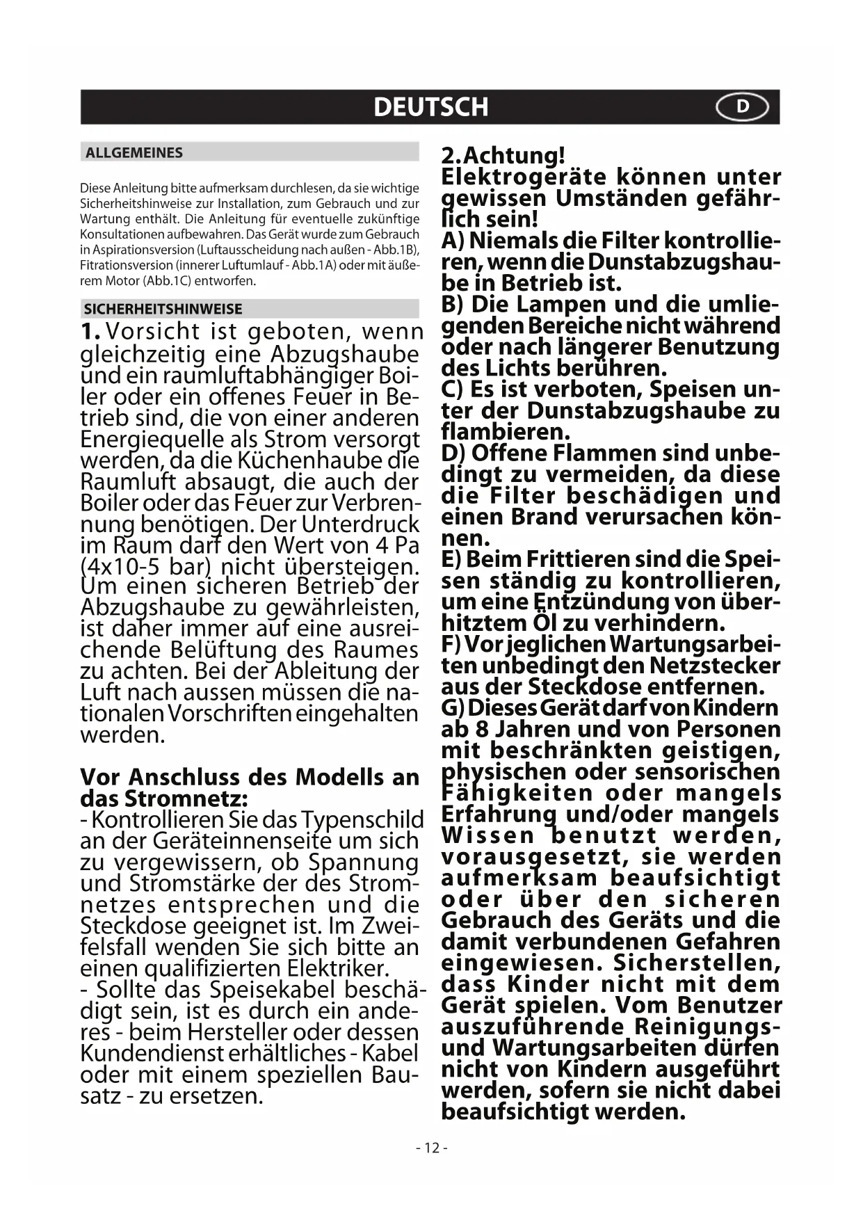 ALLGEMEINES Diese Anleitung bitte aufmerksam durchlesen, da sie wichtige Sicherheitshinweise zur Installation, zum Gebrauch und zur Wartung enthält. Die Anleitung für eventuelle zukünftige Konsultationen aufbewahren. Das Gerät wurde zum Gebrauch in Aspirationsversion (Luftausscheidung nach außen - Abb.1B), Fitrationsversion (innerer Luftumlauf - Abb.1A) oder mit äuße- rem Motor (Abb.1C) entworfen. SICHERHEITSHINWEISE