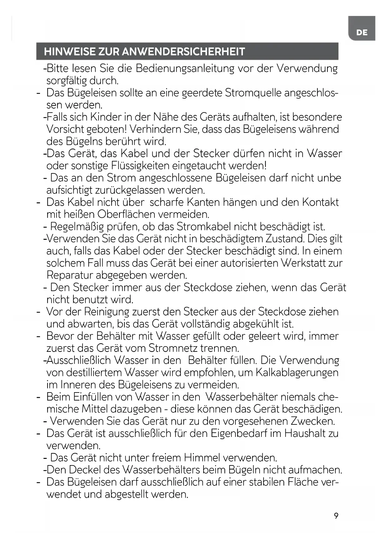 Bitte lesen Sie die Bedienungsanleitung vor der Verwendung sorgfältig durch. - Das Bügeleisen sollte an eine geerdete Stromquelle angeschlos