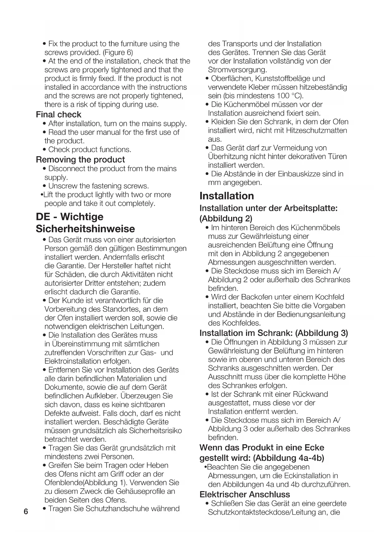 - Die Küchenmöbel müssen vor der Installation ausreichend fixiert sein.